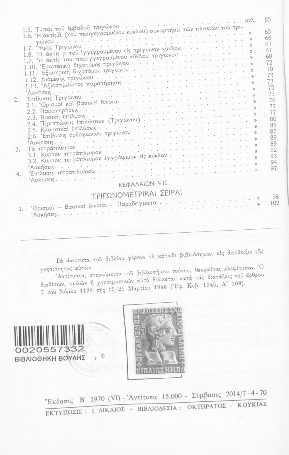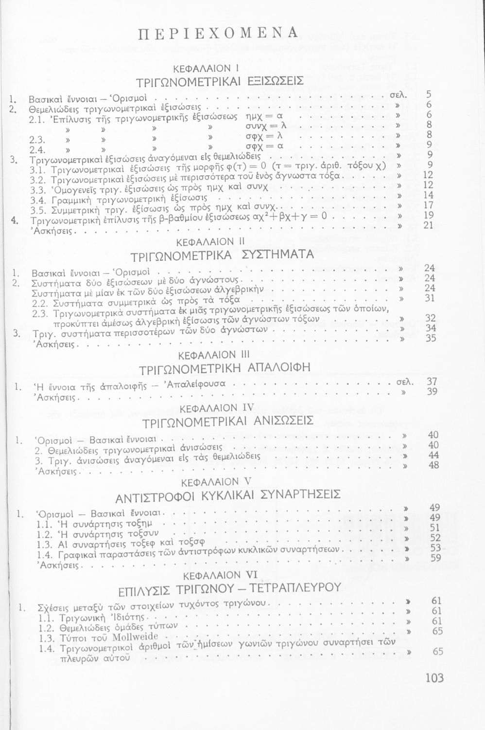 Παρουσίαση περιεχομένου: Σχολικό εγχειρίδιο της ΣΤ΄ Γυμνασίου για το μάθημα των Μαθηματικών. Περιέχει θεωρία, ασκήσεις λυμένες και παραδείγματα της Τριγωνομετρίας. Απευθυνόταν στους μαθητές της θετικής κατεύθυνσης.