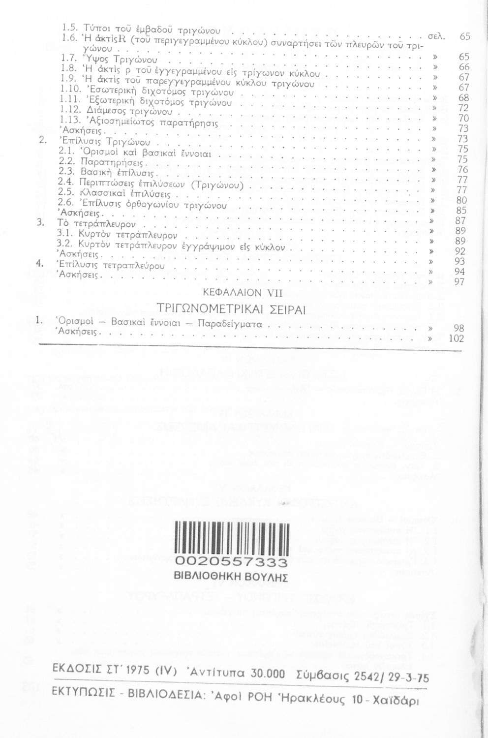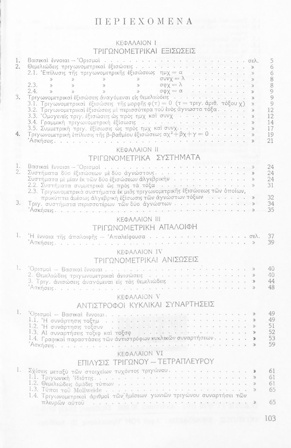 Σχολικό εγχειρίδιο της ΣΤ΄ Γυμνασίου για το μάθημα των Μαθηματικών. Περιέχει θεωρία, ασκήσεις λυμένες και παραδείγματα της Τριγωνομετρίας. Απευθυνόταν στους μαθητές της θετικής κατεύθυνσης.