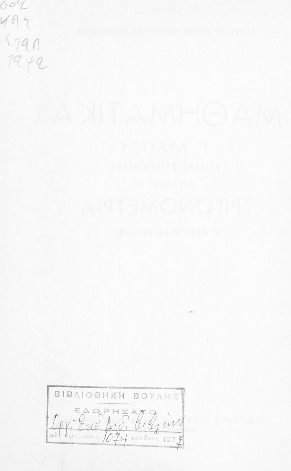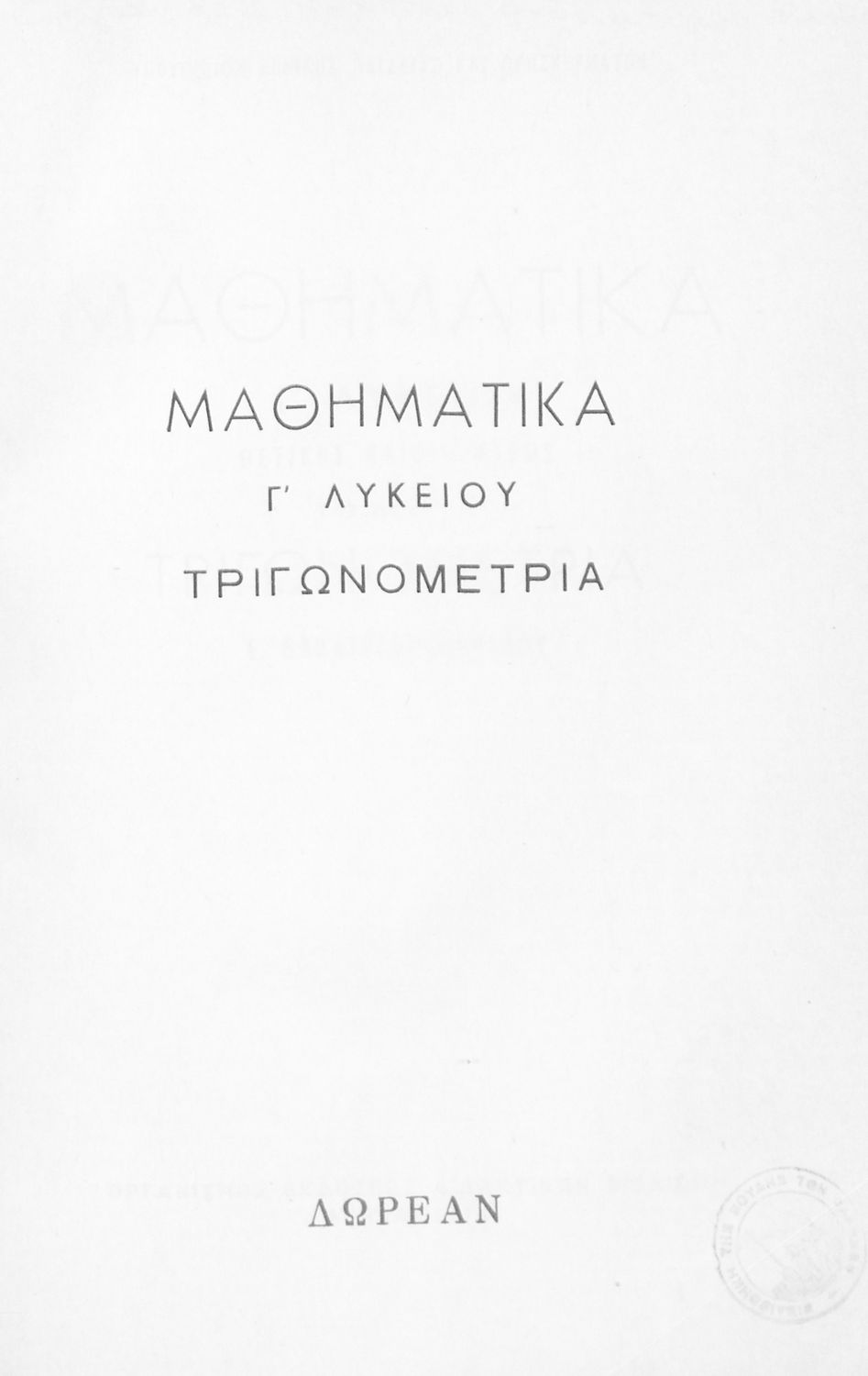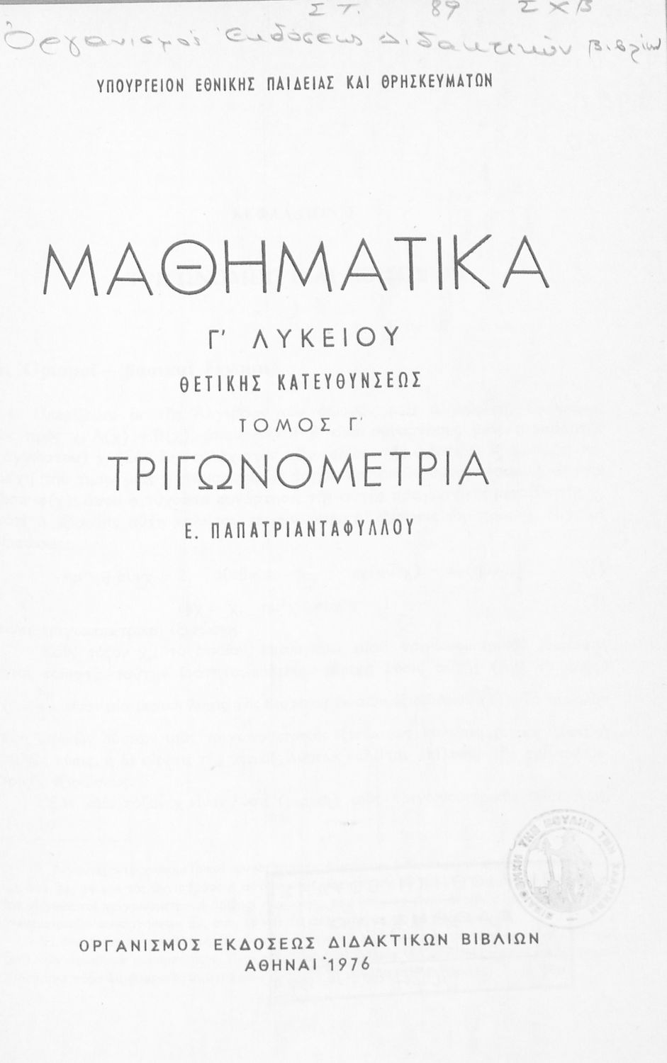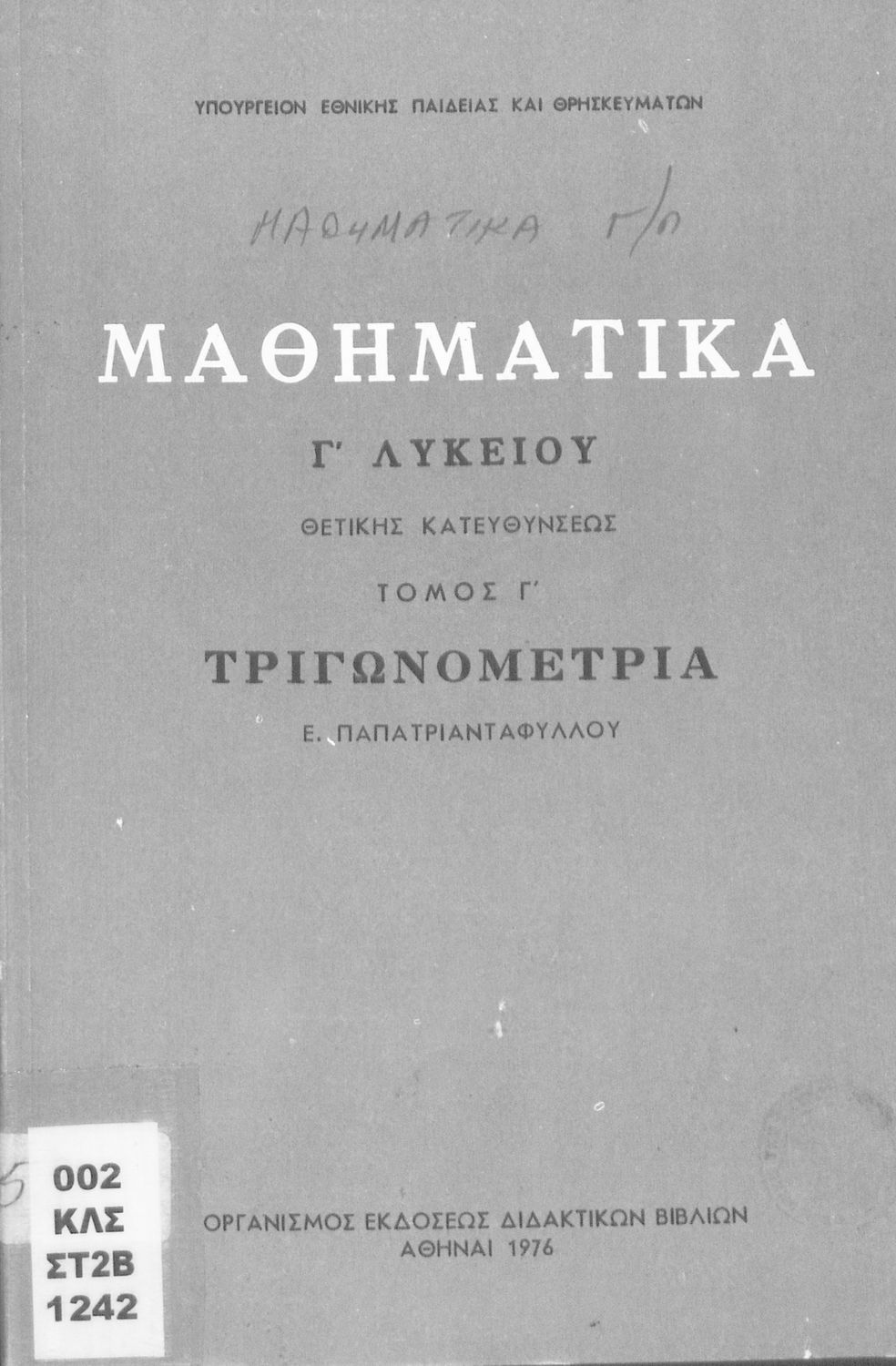 Σχολικό εγχειρίδιο της ΣΤ΄ Γυμνασίου για το μάθημα των Μαθηματικών. Περιέχει θεωρία, ασκήσεις λυμένες και παραδείγματα της Τριγωνομετρίας. Απευθυνόταν στους μαθητές της θετικής κατεύθυνσης.