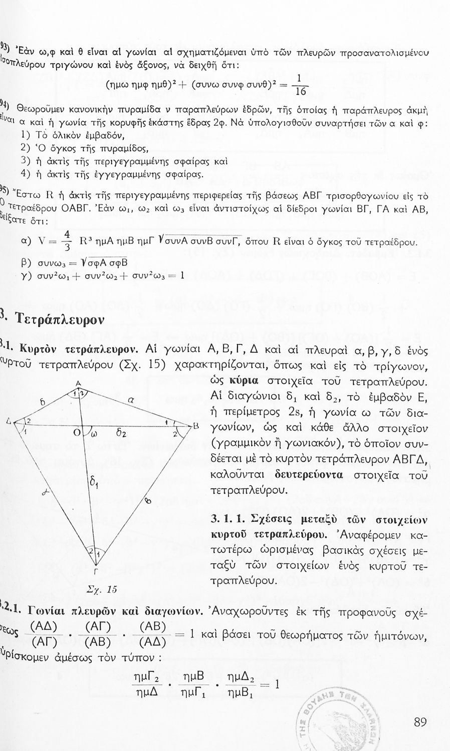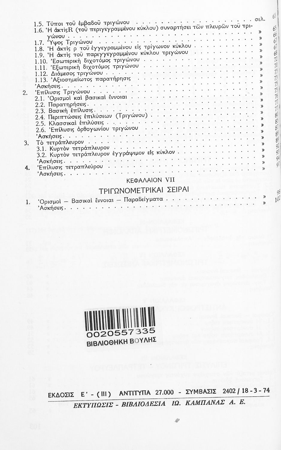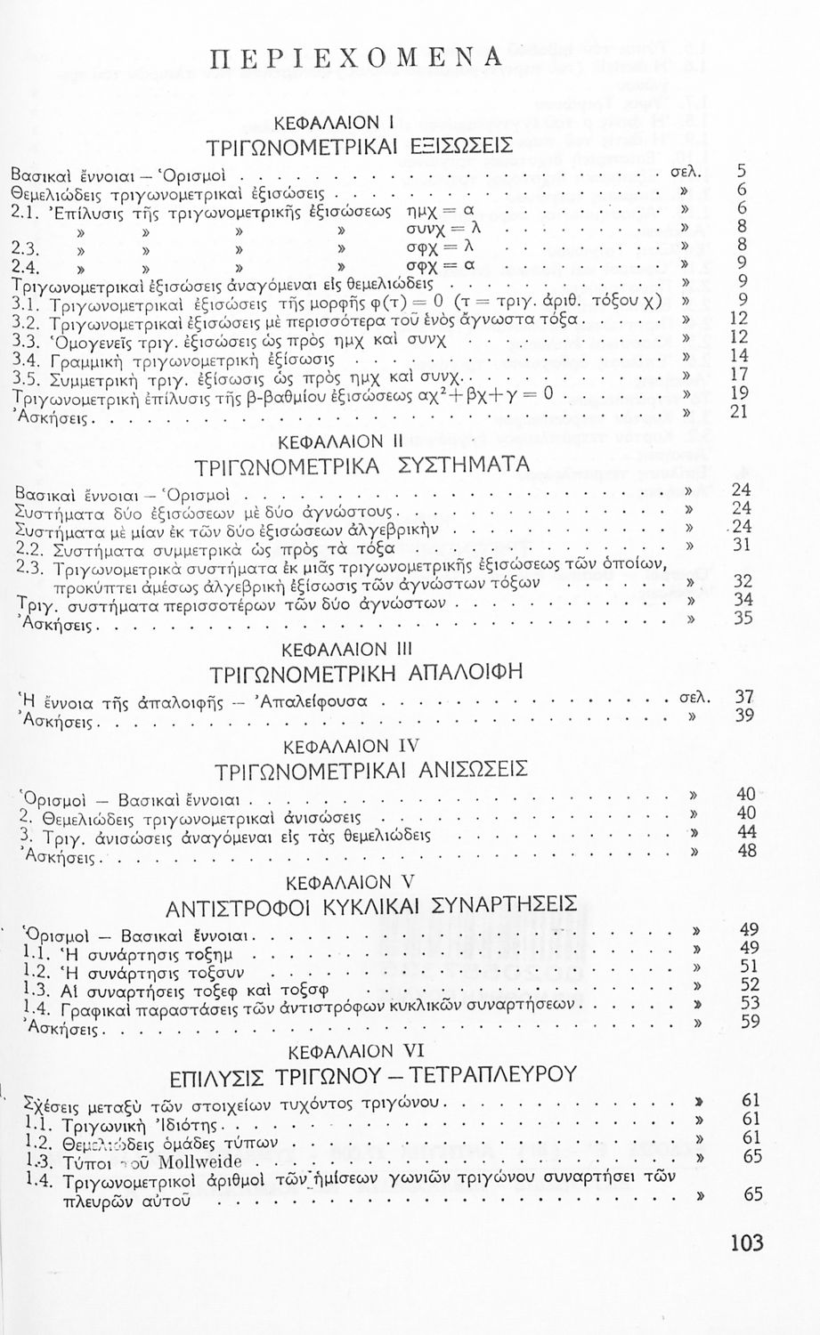 Παρουσίαση περιεχομένου: Το σύγγραμμα ήταν σχολικό εγχειρίδιο για το μάθημα των Μαθηματικών στο Γυμνάσιο. Περιέχει βασικές γνώσεις Τριγωνομετρίας. Αναφέρεται στις τριγωνομετρικές εξισώσεις, τα τριγωνομετρικά συστήματα, την απαλοιφή, την επίλυση τριγώνου και τετράπλευρου. Εκτός από τη θεωρία το βιβλίο περιέχει και ασκήσεις.