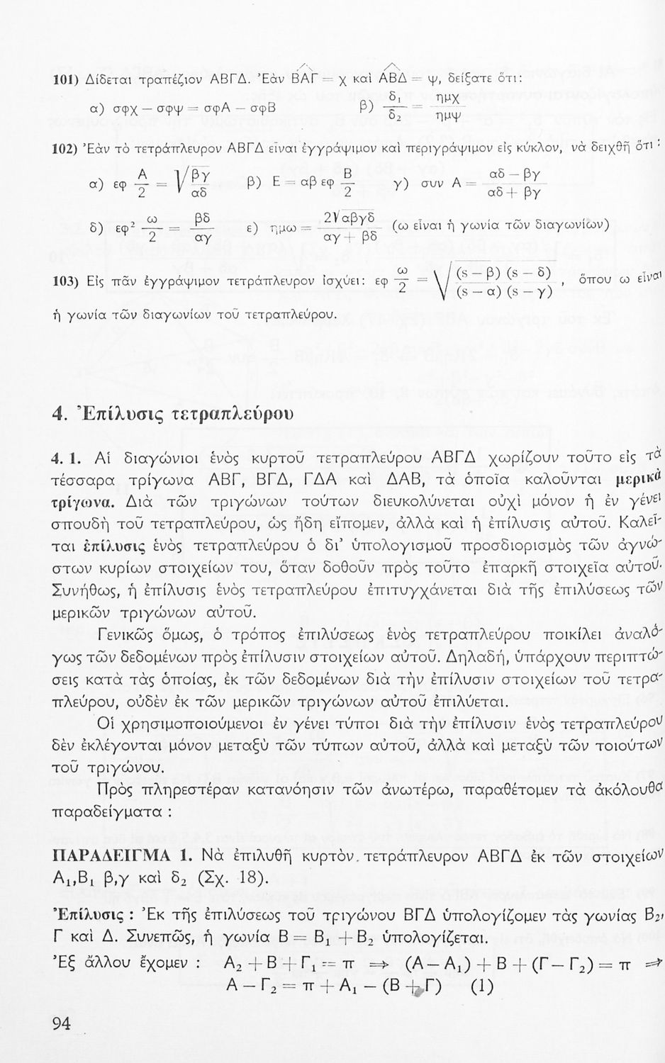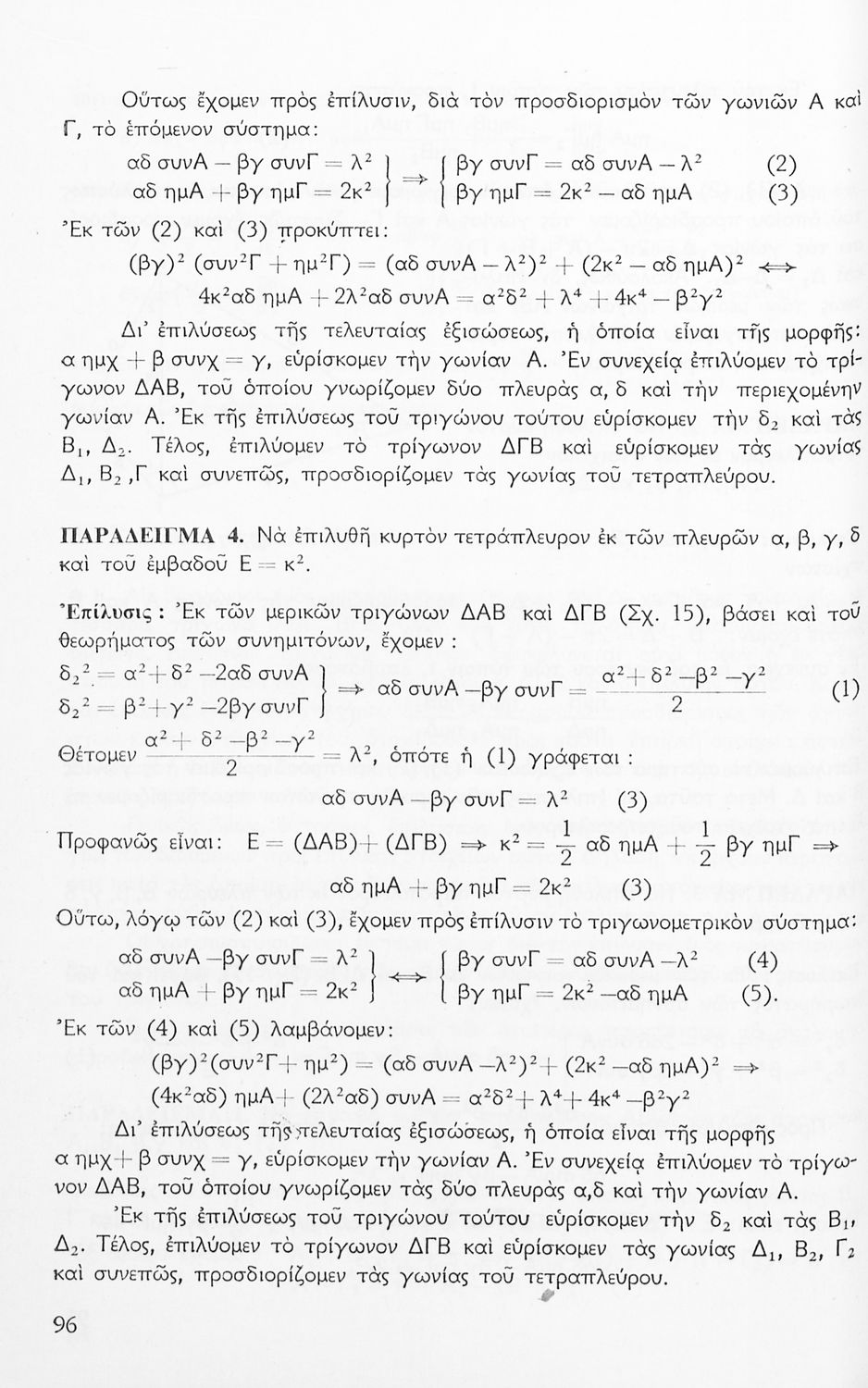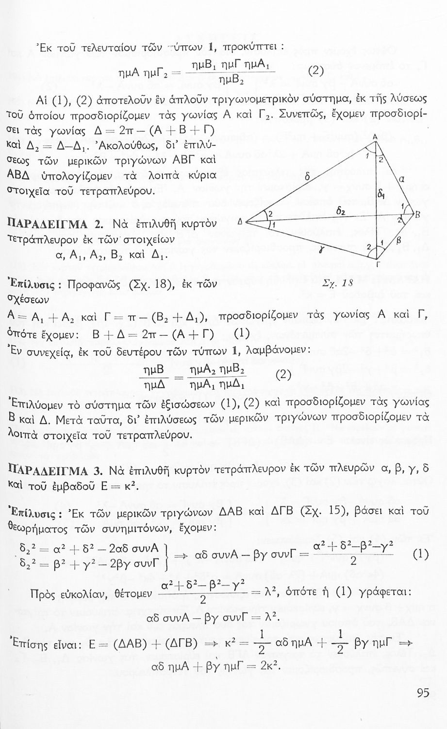 Παρουσίαση περιεχομένου: Το σύγγραμμα ήταν σχολικό εγχειρίδιο για το μάθημα των Μαθηματικών στο Γυμνάσιο. Περιέχει βασικές γνώσεις Τριγωνομετρίας. Αναφέρεται στις τριγωνομετρικές εξισώσεις, τα τριγωνομετρικά συστήματα, την απαλοιφή, την επίλυση τριγώνου και τετράπλευρου. Εκτός από τη θεωρία το βιβλίο περιέχει και ασκήσεις.