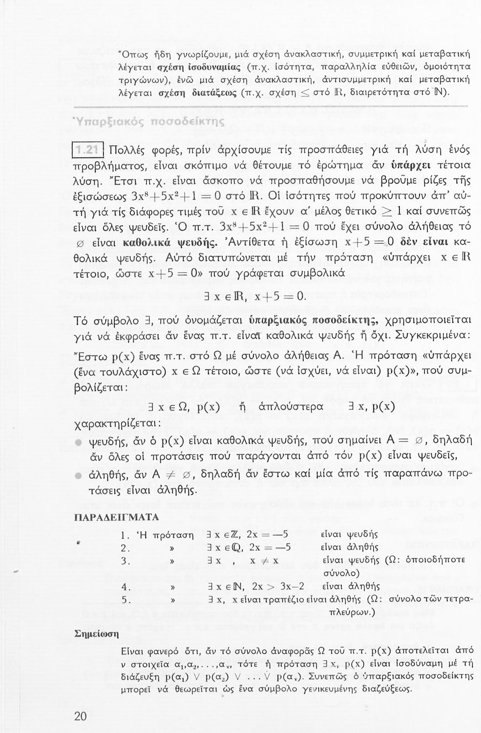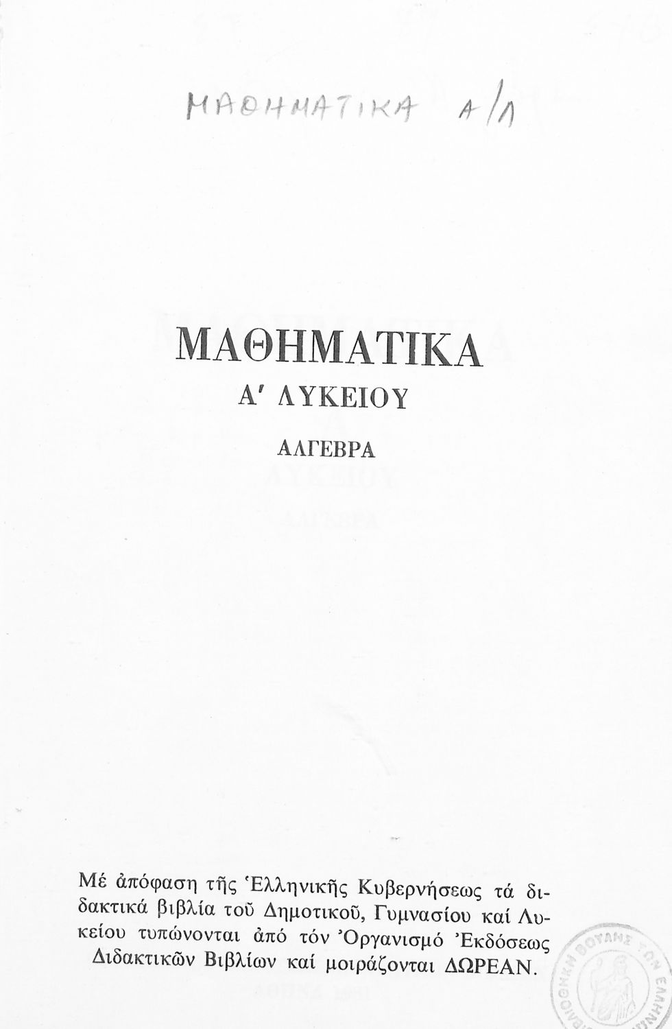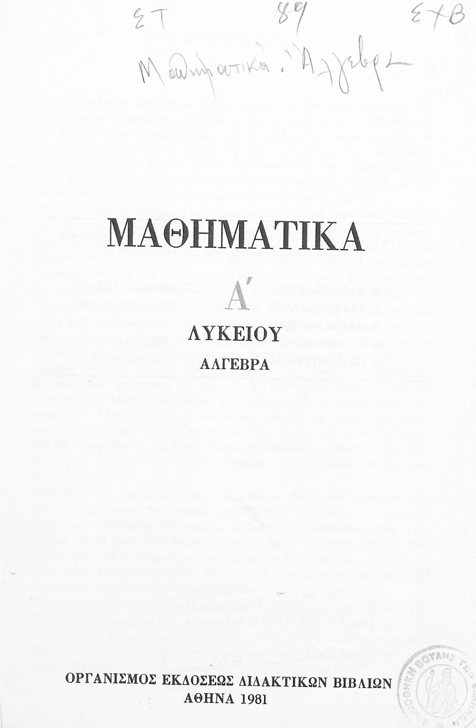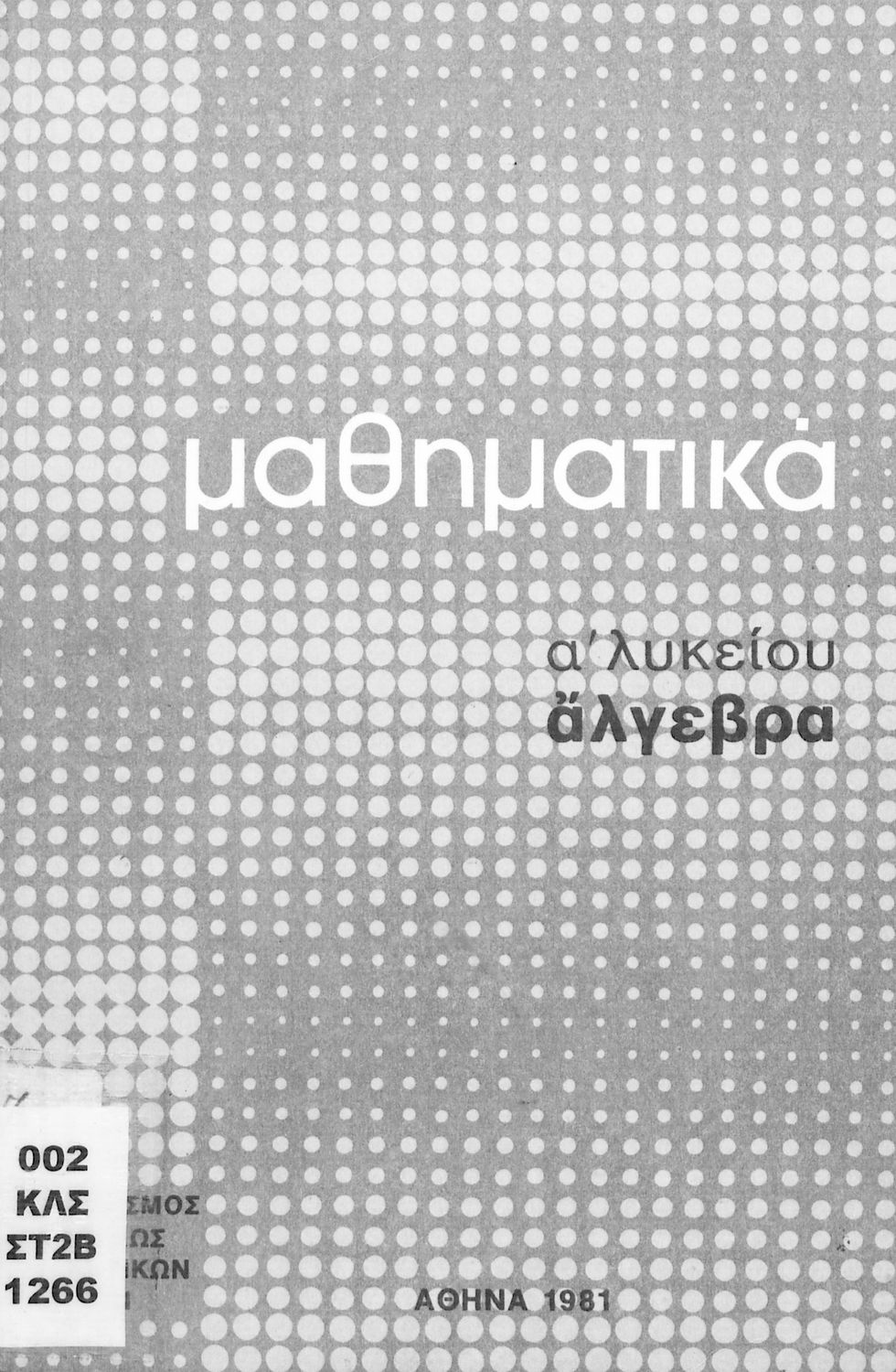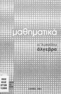Σχολικό εγχειρίδιο Άλγεβρας Α΄ Λυκείου που είναι χωρισμένο σε αξιώματα, πορίσματα, παραδείγματα και ασκήσεις και εστιάζει στις συναρτήσεις, τις εξισώσεις και τις αριθμητικές πράξεις.. Περιέχει παράρτημα με τις λύσεις των ασκήσεων.