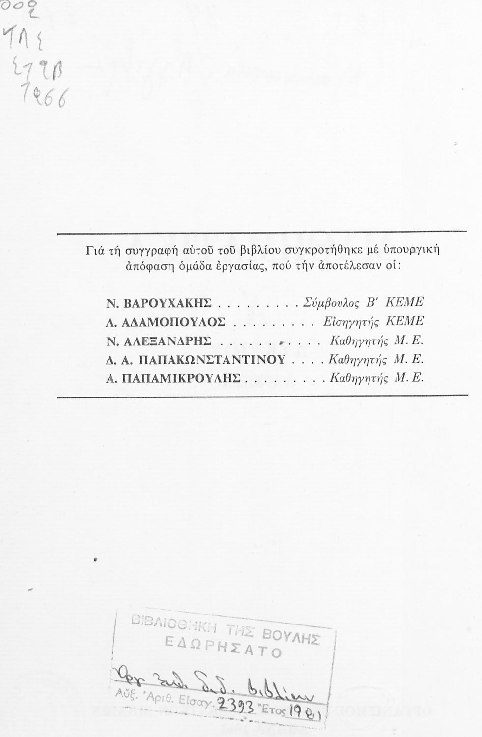 Εκδότης: Οργανισμός Εκδόσεως Διδακτικών Βιβλίων Έτος έκδοσης: 1981 Τόπος έκδοσης: Αθήνα Έκδοση: 3η Υπουργική απόφαση / Σύμβαση: 3501/13-11-1980 Έτος έγκρισης: 1981 |