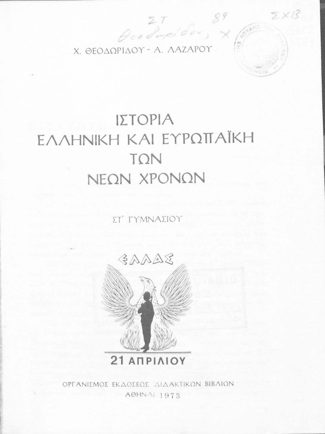 Σχολικό εγχειρίδιο Ιστορίας ΣΤ΄ Γυμνασίου που αποτελεί μια συνοπτική επισκόπηση της ιστορία της Ευρώπης και καλύπτει το διάστημα από την Συνθήκη της Βεστφαλίας ως τον Α΄ Παγκόσμιο Πόλεμο. Φέρει το σύμβολο της δικτατορίας.