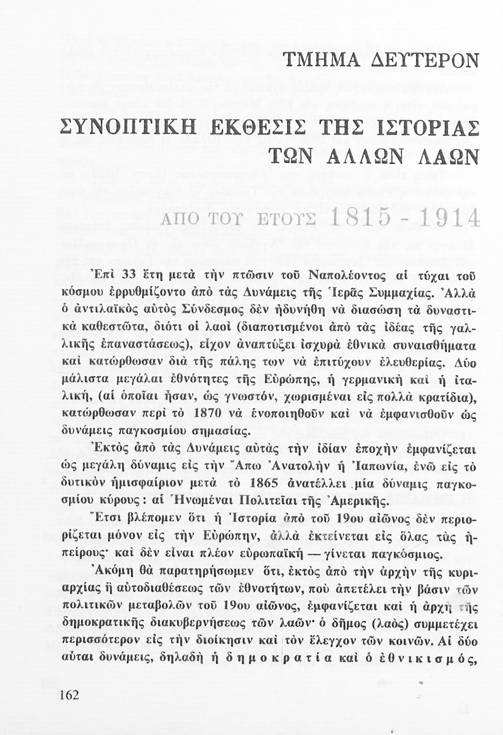 Βαθμίδα εκπαίδευσης: Δευτεροβάθμια Τάξη: Γ' Γυμνασίου Μάθημα: Ιστορία Γλώσσα: Απλή καθαρεύουσα Παρουσίαση περιεχομένου: Σχολικό εγχειρίδιο Ιστορίας Γ΄ Γυμνασίου που καλύπτει την περίοδο της Αναγέννησης και του Διαφωτισμού στην Ευρώπη και την προετοιμασία της Ελληνικής Επανάστασης. Συνοπτικά αναφέρεται στο διάστημα από τη βασίλεια του Όθωνα ως τους δύο Παγκόσμιους Πολέμους και τον Ψυχρό Πόλεμο. Παρουσιάζει και την πνευματική κίνηση κατά τον 19ο και 20ο αιώνα. |