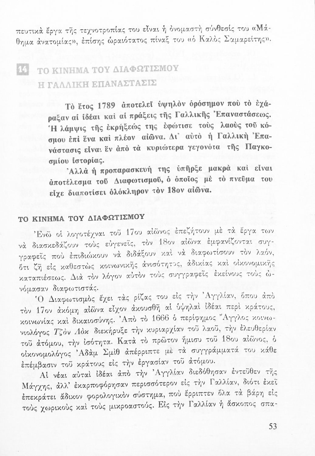 Σχολικό εγχειρίδιο Ιστορίας Γ΄ Γυμνασίου που καλύπτει την περίοδο της Αναγέννησης και του Διαφωτισμού στην Ευρώπη και την προετοιμασία της Ελληνικής Επανάστασης. Συνοπτικά αναφέρεται στο διάστημα από τη βασίλεια του Όθωνα ως τους δύο Παγκόσμιους Πολέμους και τον Ψυχρό Πόλεμο. Παρουσιάζει και την πνευματική κίνηση κατά τον 19ο και 20ο αιώνα.