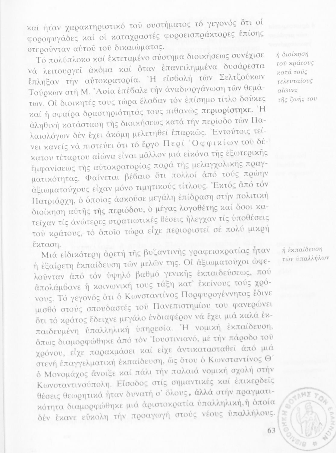 Παρουσίαση περιεχομένου: Σχολικό εγχειρίδιο Ιστορίας Λυκείου που εστιάζει στην περίοδο της Βυζαντινής Αυτοκρατορίας και πραγματεύεται τη διοίκηση, τη θρησκεία, το στρατό, την οικονομική ζωή, την εκπαίδευση και την πνευματική κίνηση.