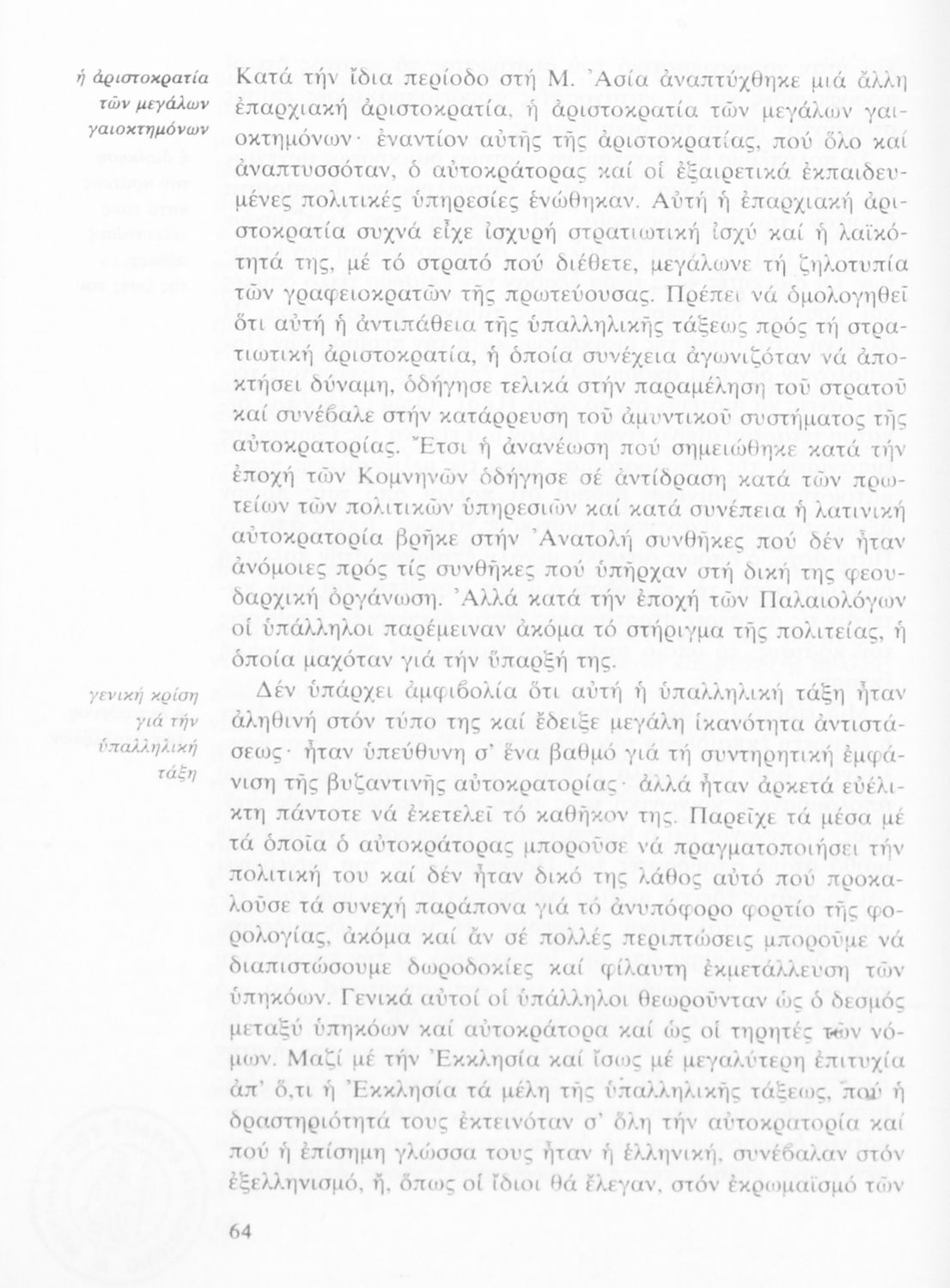Σχολικό εγχειρίδιο Ιστορίας Λυκείου που εστιάζει στην περίοδο της Βυζαντινής Αυτοκρατορίας και πραγματεύεται τη διοίκηση, τη θρησκεία, το στρατό, την οικονομική ζωή, την εκπαίδευση και την πνευματική κίνηση.