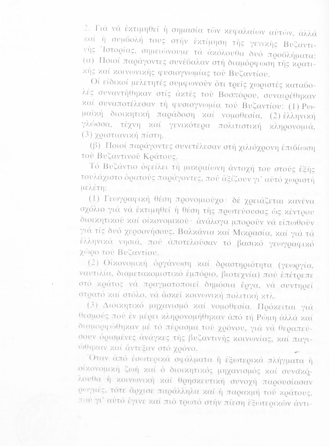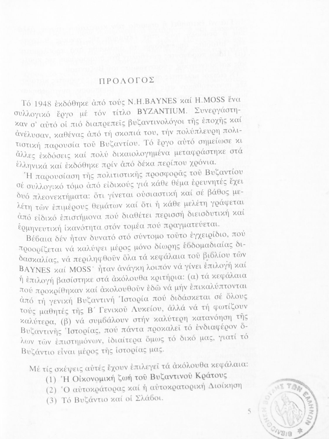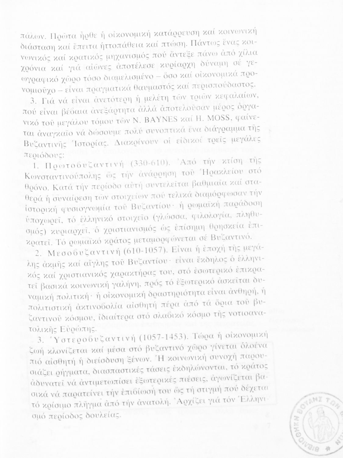 Σχολικό εγχειρίδιο Ιστορίας Λυκείου που εστιάζει στην περίοδο της Βυζαντινής Αυτοκρατορίας και πραγματεύεται τη διοίκηση, τη θρησκεία, το στρατό, την οικονομική ζωή, την εκπαίδευση και την πνευματική κίνηση.