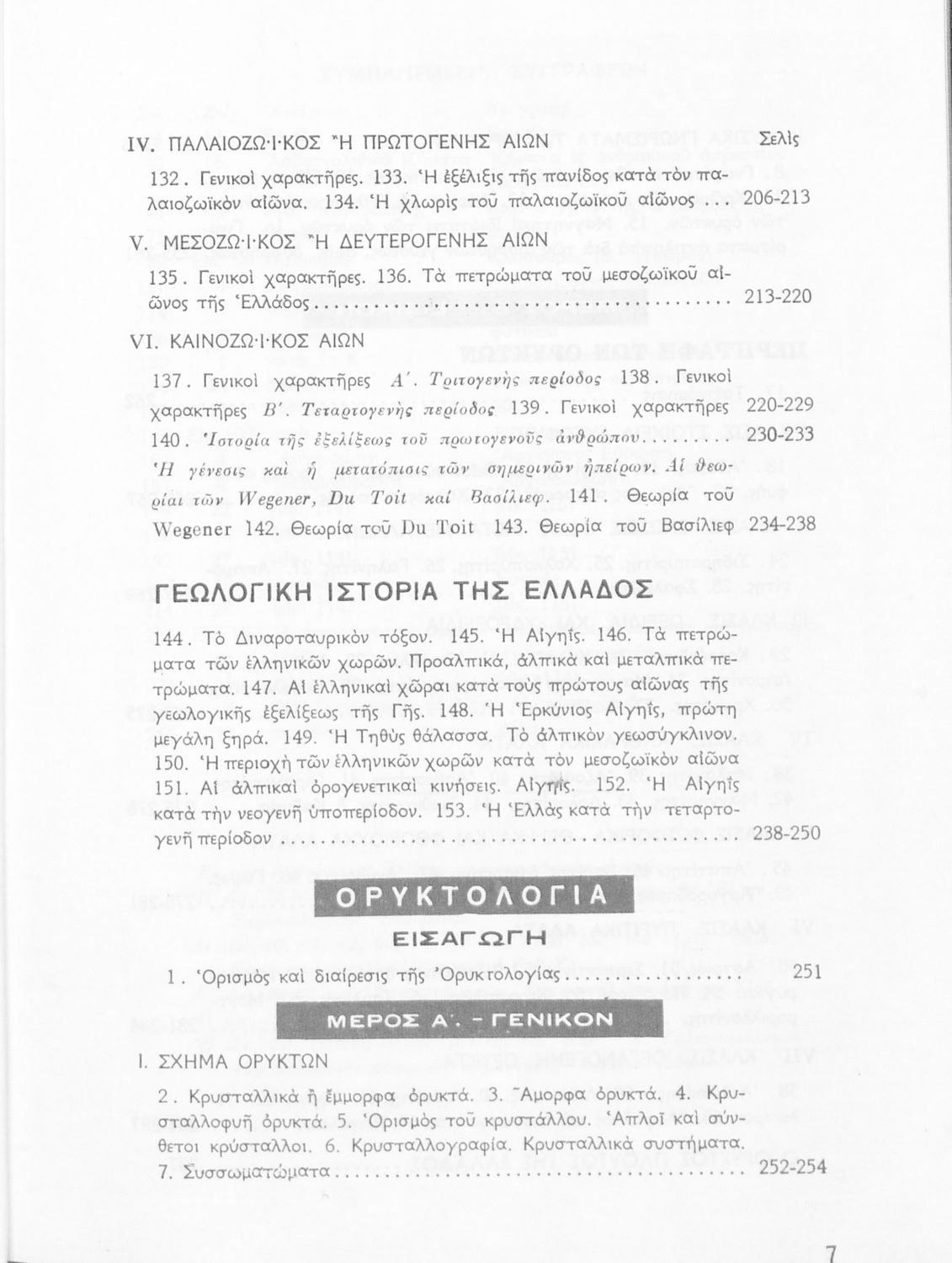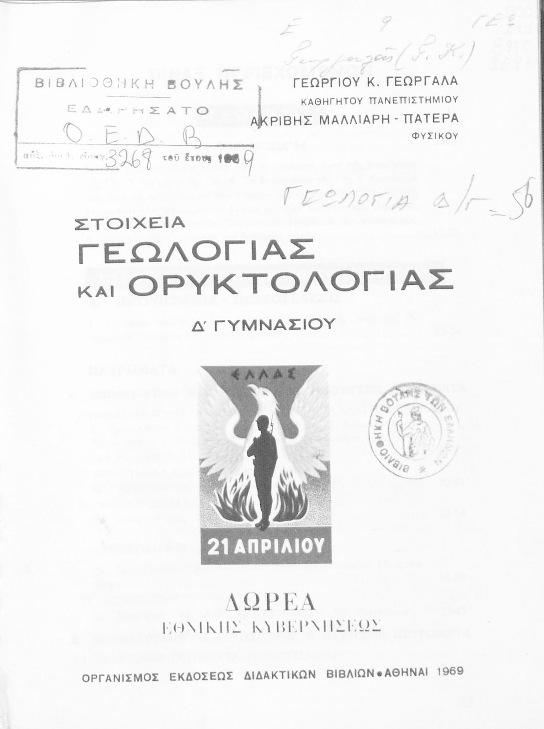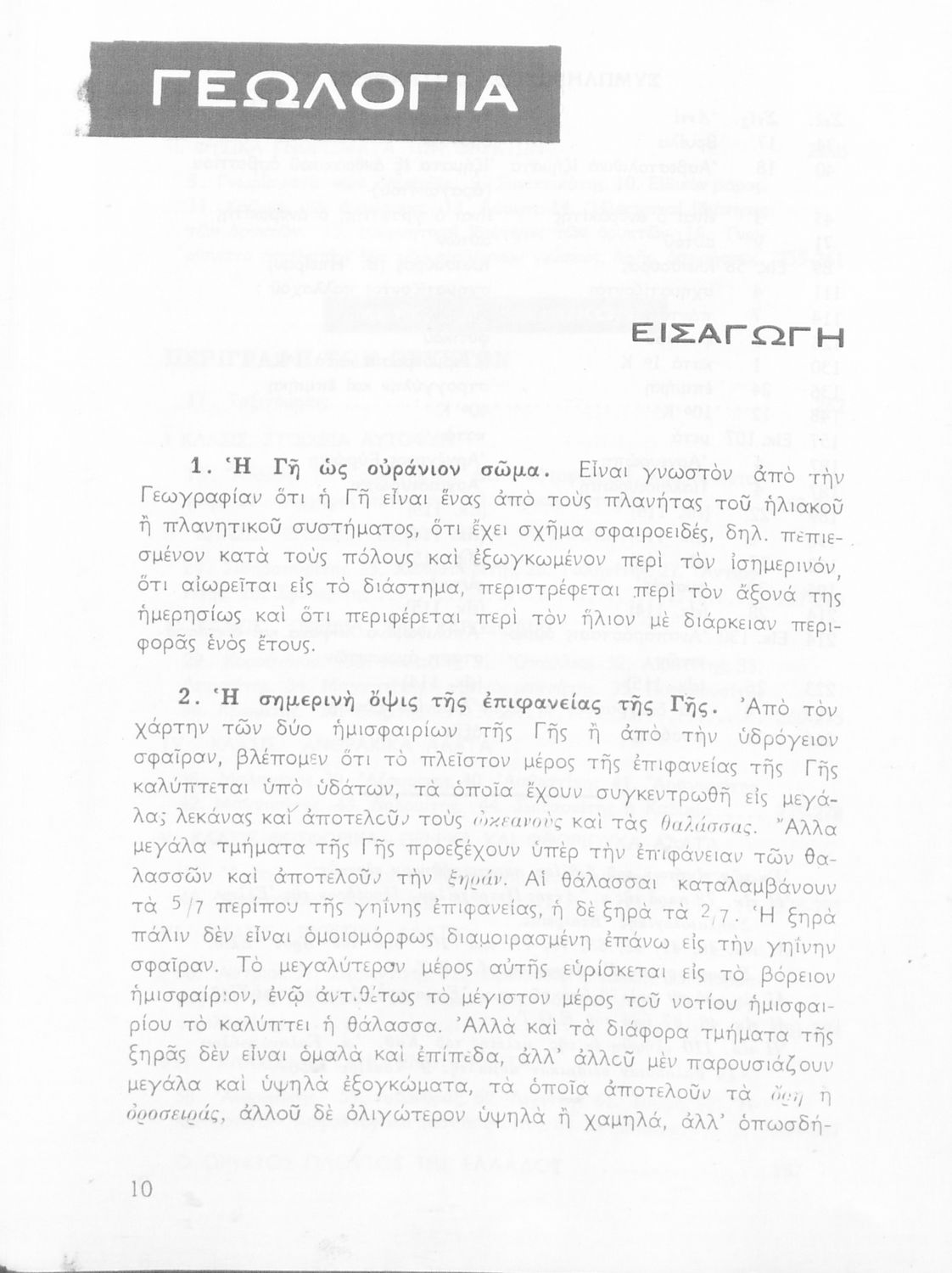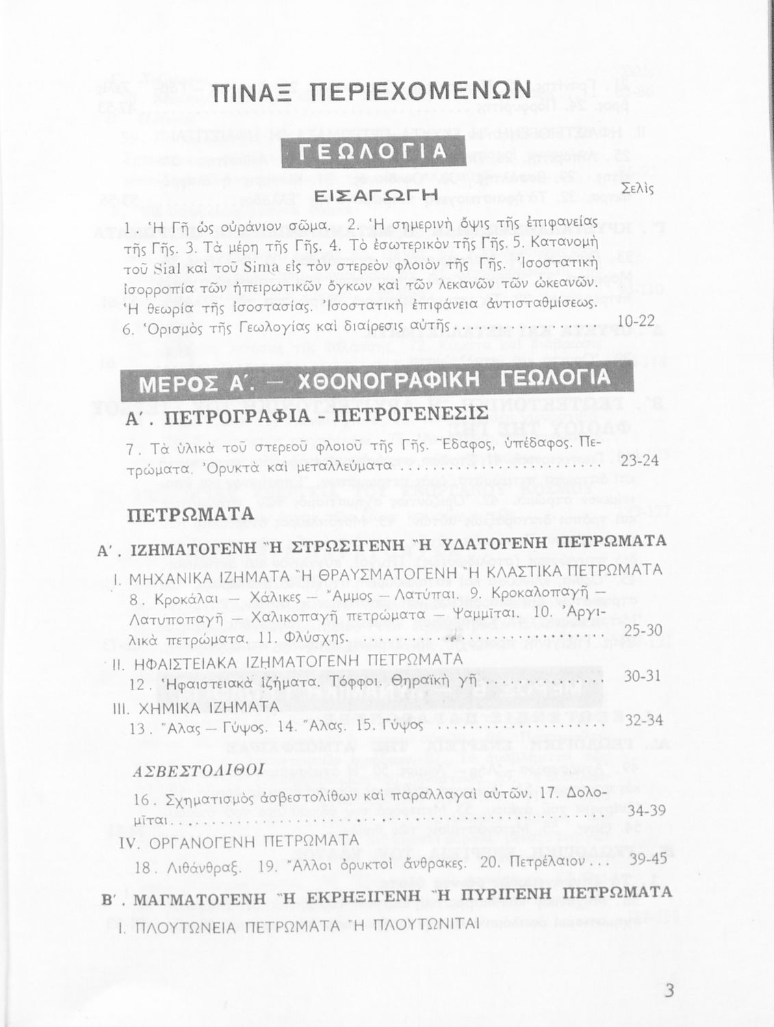 Σχολικό εγχειρίδιο της Δ΄ Γυμνασίου για το μάθημα της Γεωλογίας. Αναφέρεται στα πετρώματα, απολιθώματα, τους γεωλογικούς αιώνες. Στην Ορυκτολογία αναφέρει τα αυτοφυή στοιχεία, τις ορυκτές ενώσεις, τα άλατα, και τις ορυκτές οργανικές ενώσεις.