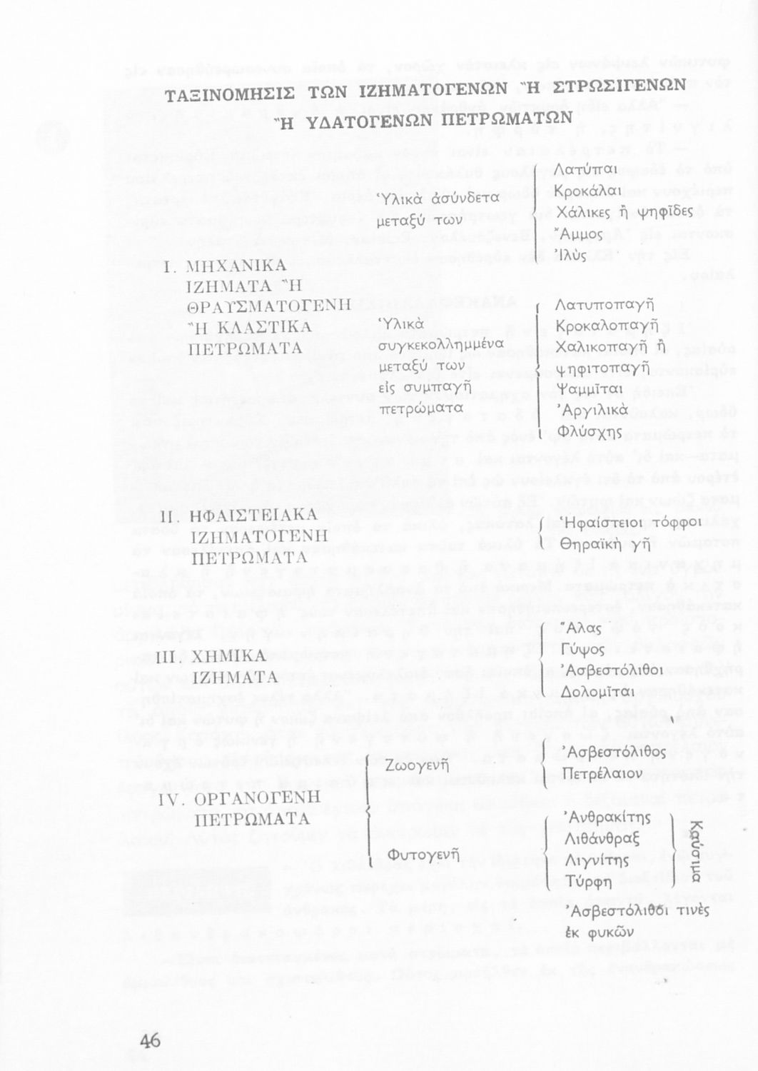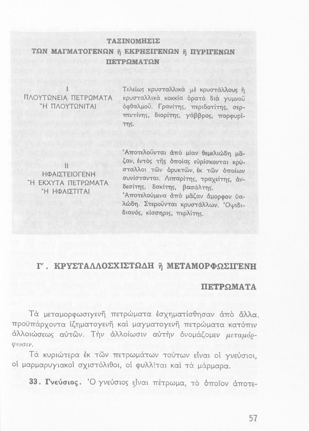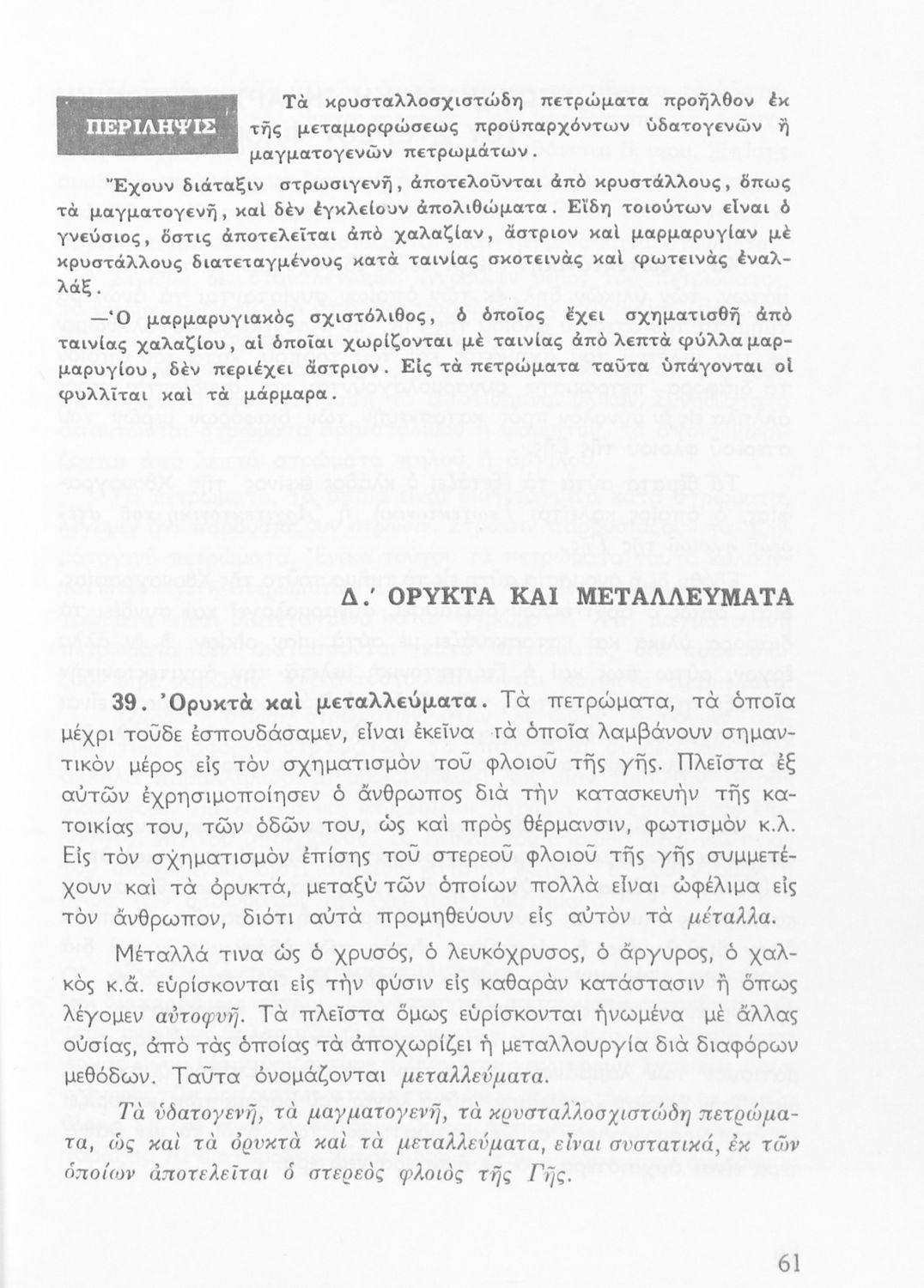 Σχολικό εγχειρίδιο Γεωλογίας/Ορυκτολογίας για τη Β΄ Γυμνασίου που παρουσιάζει τα ορυκτά με βάση την κλάση στην οποία ανήκουν. Περιέχει και πίνακα των γεωλογικών περιόδων.