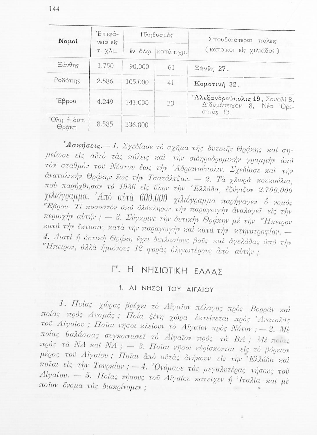 Βαθμίδα εκπαίδευσης: Δευτεροβάθμια Τάξη: Α' Γυμνασίου Μάθημα: Γεωγραφία Γλώσσα: Απλή καθαρεύουσα Παρουσίαση περιεχομένου: Σχολικό εγχειρίδιο Γεωγραφίας Α' Γυμνασίου που εξετάζει την Ελλάδα ανά διαμέρισμα και νομό από γεωφυσική, οικονομική και πολιτική άποψη. |