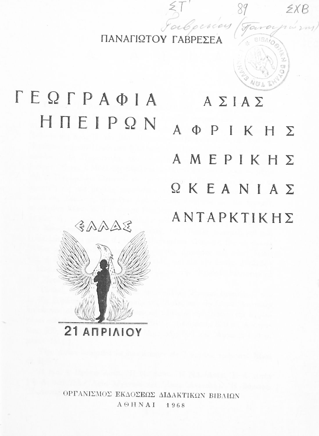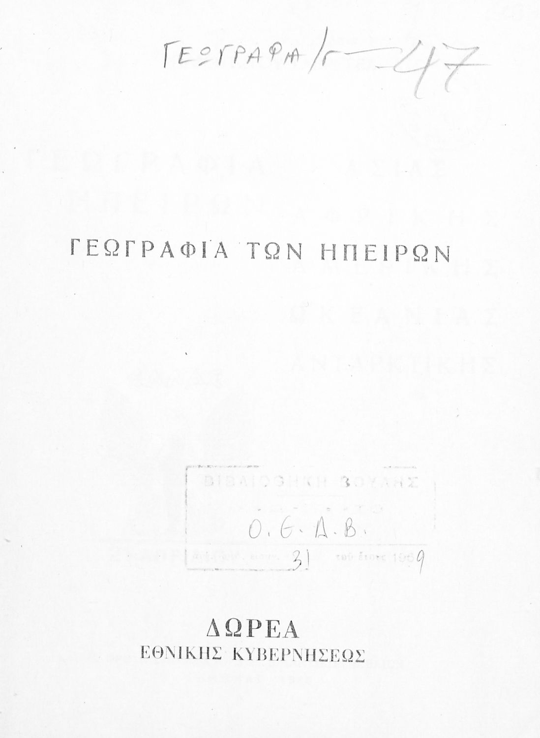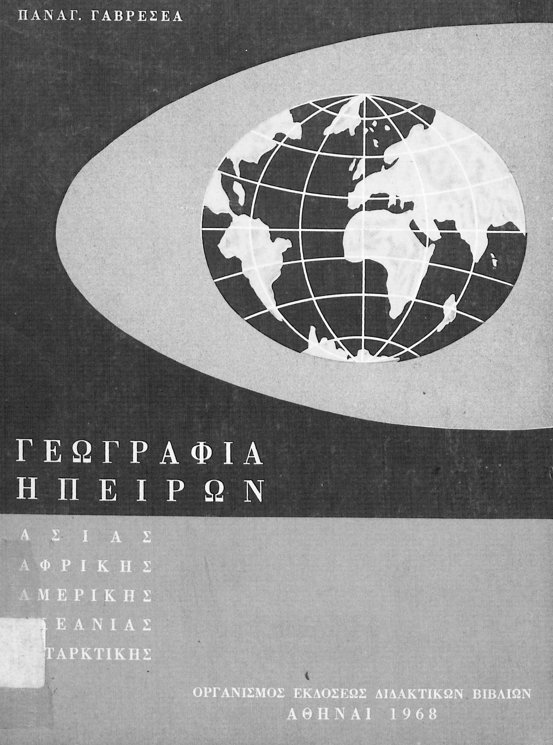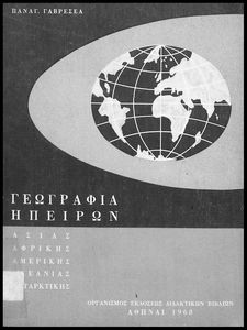 Βαθμίδα εκπαίδευσης: Δευτεροβάθμια Τάξη: ΣΤ' Γυμνασίου Μάθημα: Γεωγραφία Γλώσσα: Απλή καθαρεύουσα Παρουσίαση περιεχομένου: Σχολικό εγχειρίδιο Γεωγραφίας ΣΤ΄ Γυμνασίου που παρουσιάζει τα γενικά πολιτικά, οικονομικά και γεωφυσικά χαρακτηριστικά των ηπείρων πλην της Ευρώπης και εξετάζει ενδεικτικές χώρες και περιοχές |