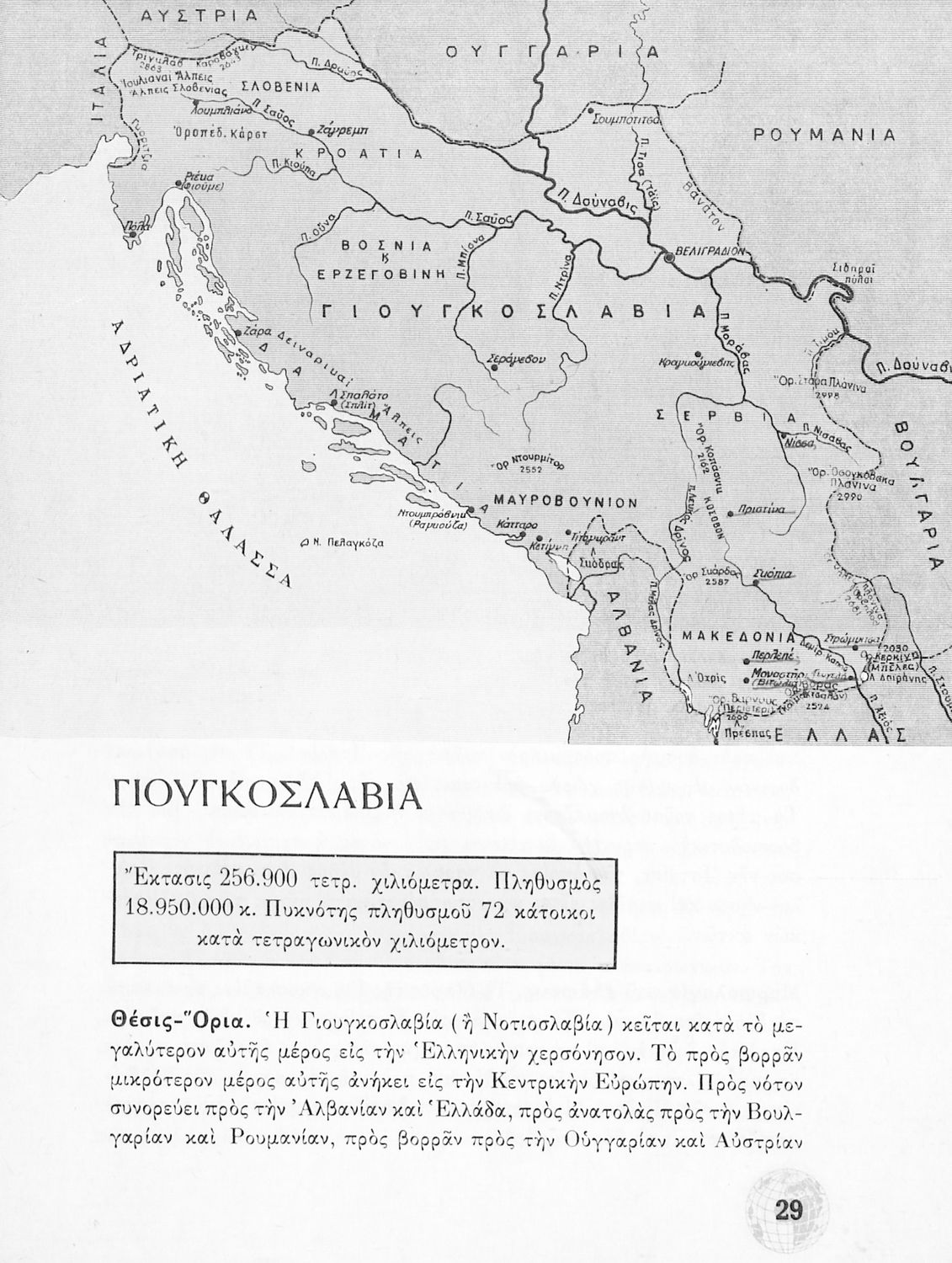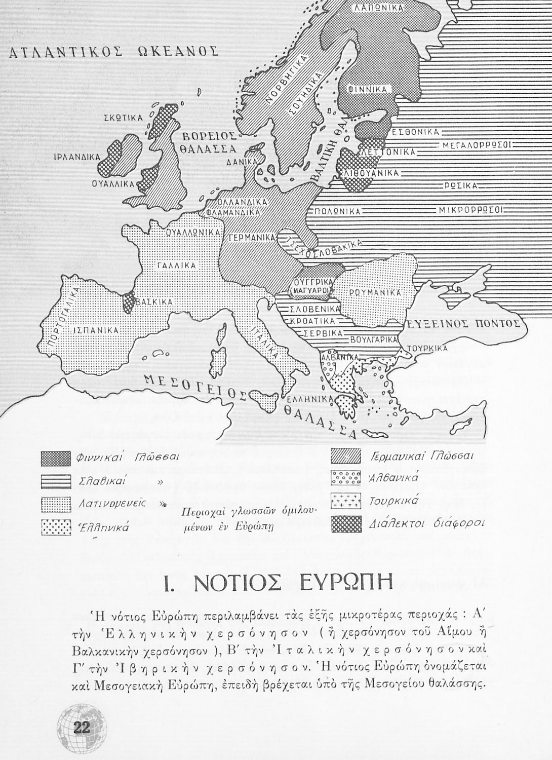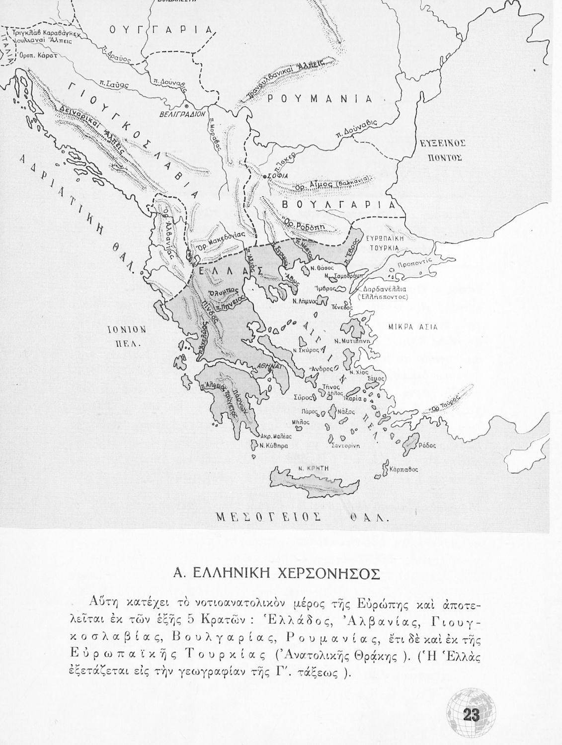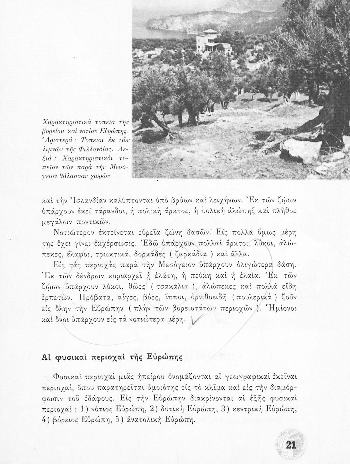 Σχολικό Εγχειρίδιο Γεωγραφίας Γυμνασίου που περιλαμβάνει στοιχεία φυσικής και μαθηματικής γεωγραφίας και εξετάζει χώρες της Ευρώπης από γεωμορφολογική, οικονομική και πολιτική άποψη. Περιέχει και στοιχεία Γεωλογίας.