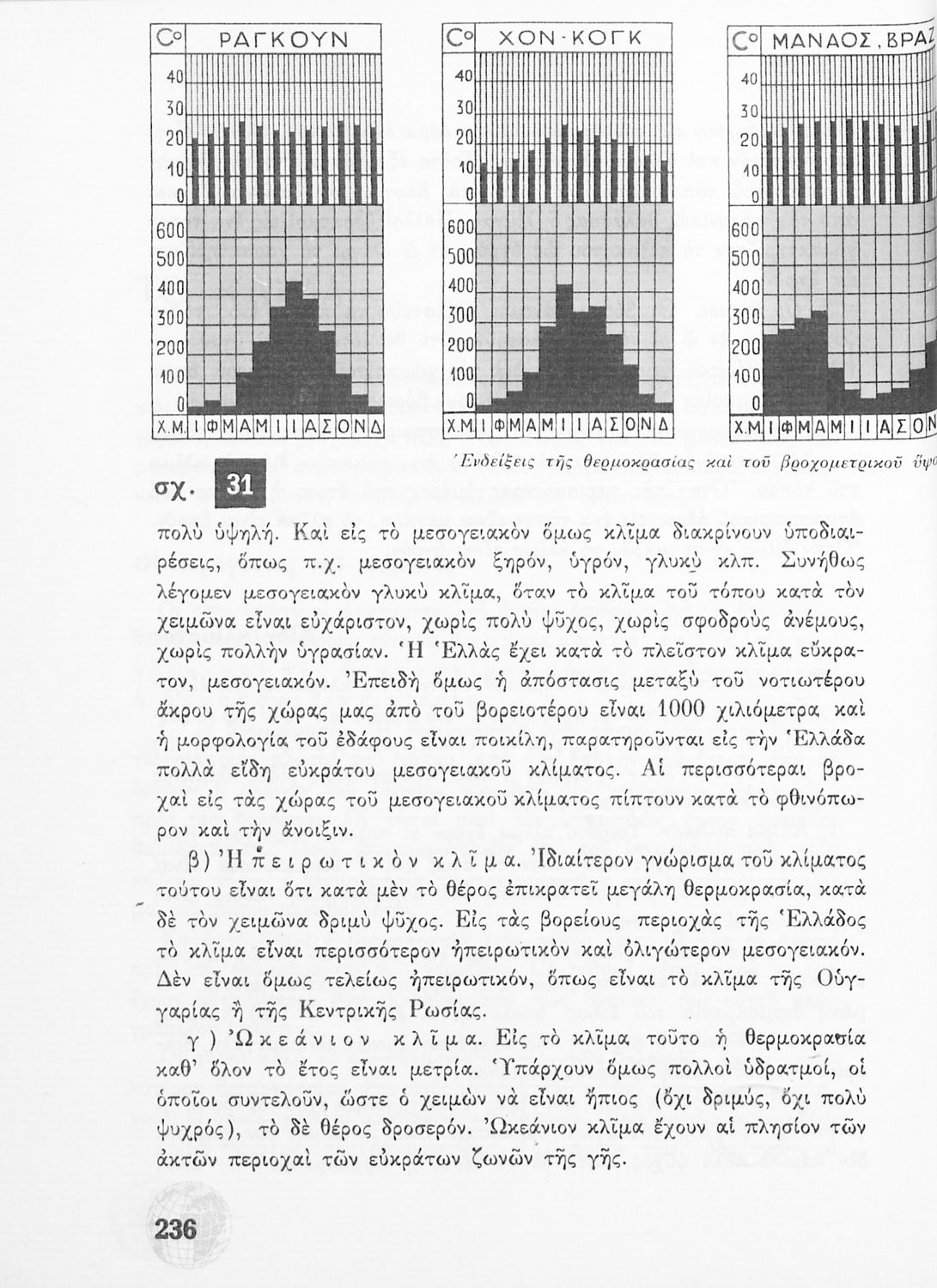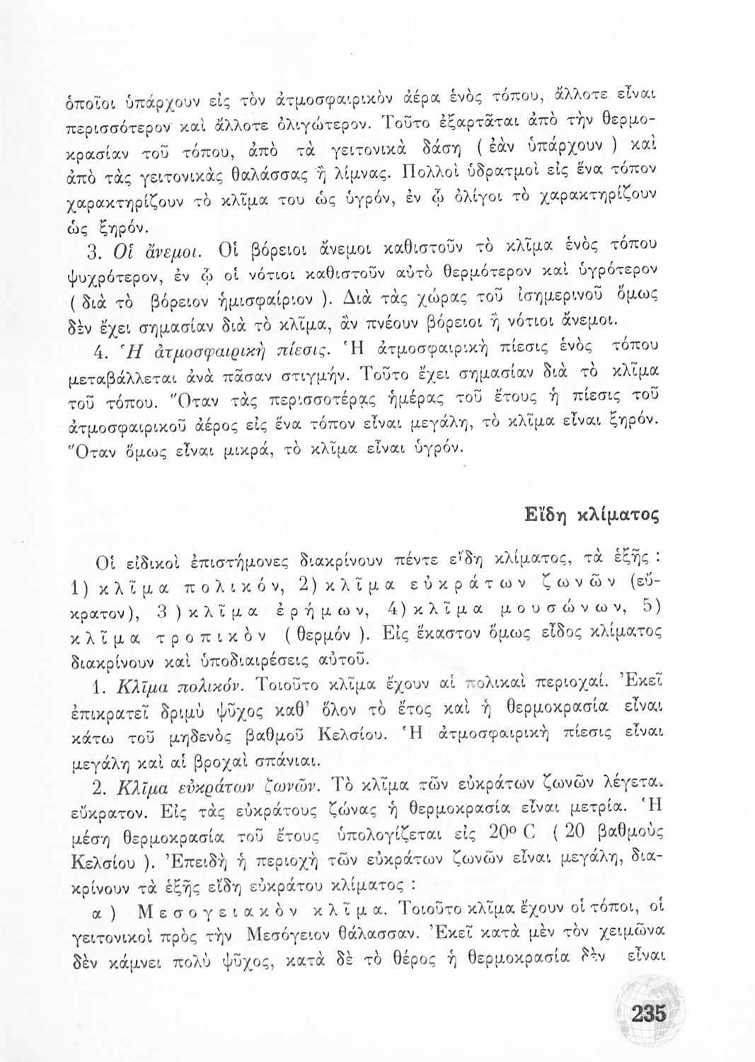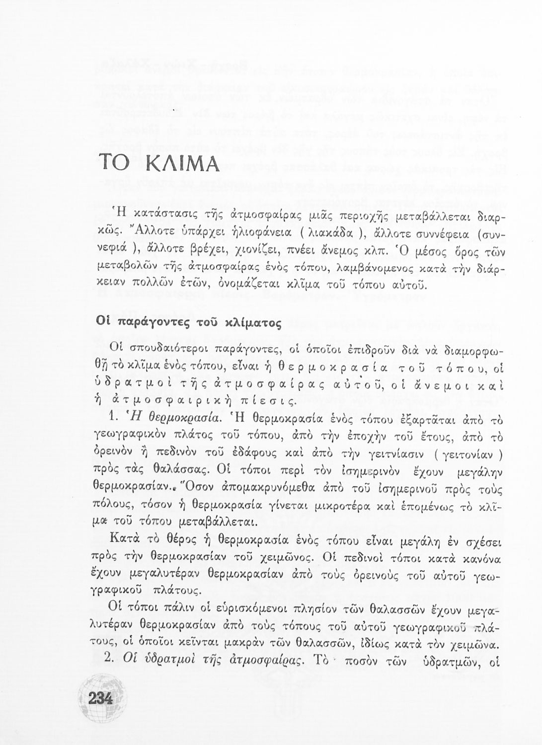 Σχολικό εγχειρίδιο Γεωγραφίας Α' Ελληνικού Σχολείου που περιλαμβάνει στοιχεία ανθρωπογεωγραφίας, μαθηματικής, και φυσικής γεωγραφίας και εξετάζει ενδεικτικά κράτη από τις πέντε ηπείρους από πολιτική, γεωφυσική