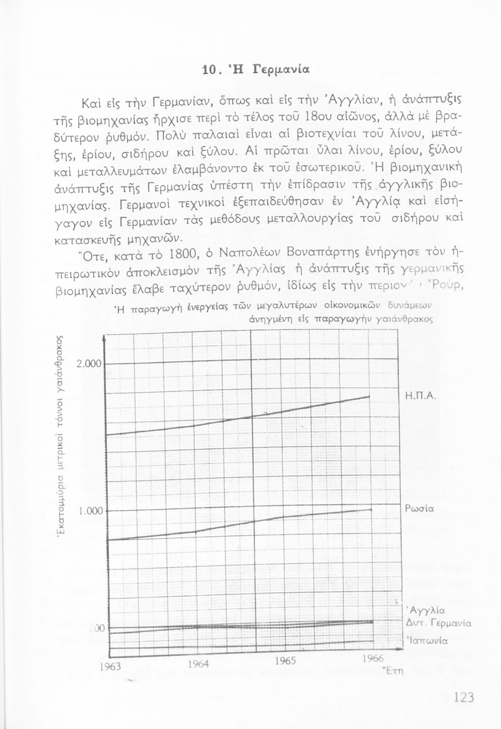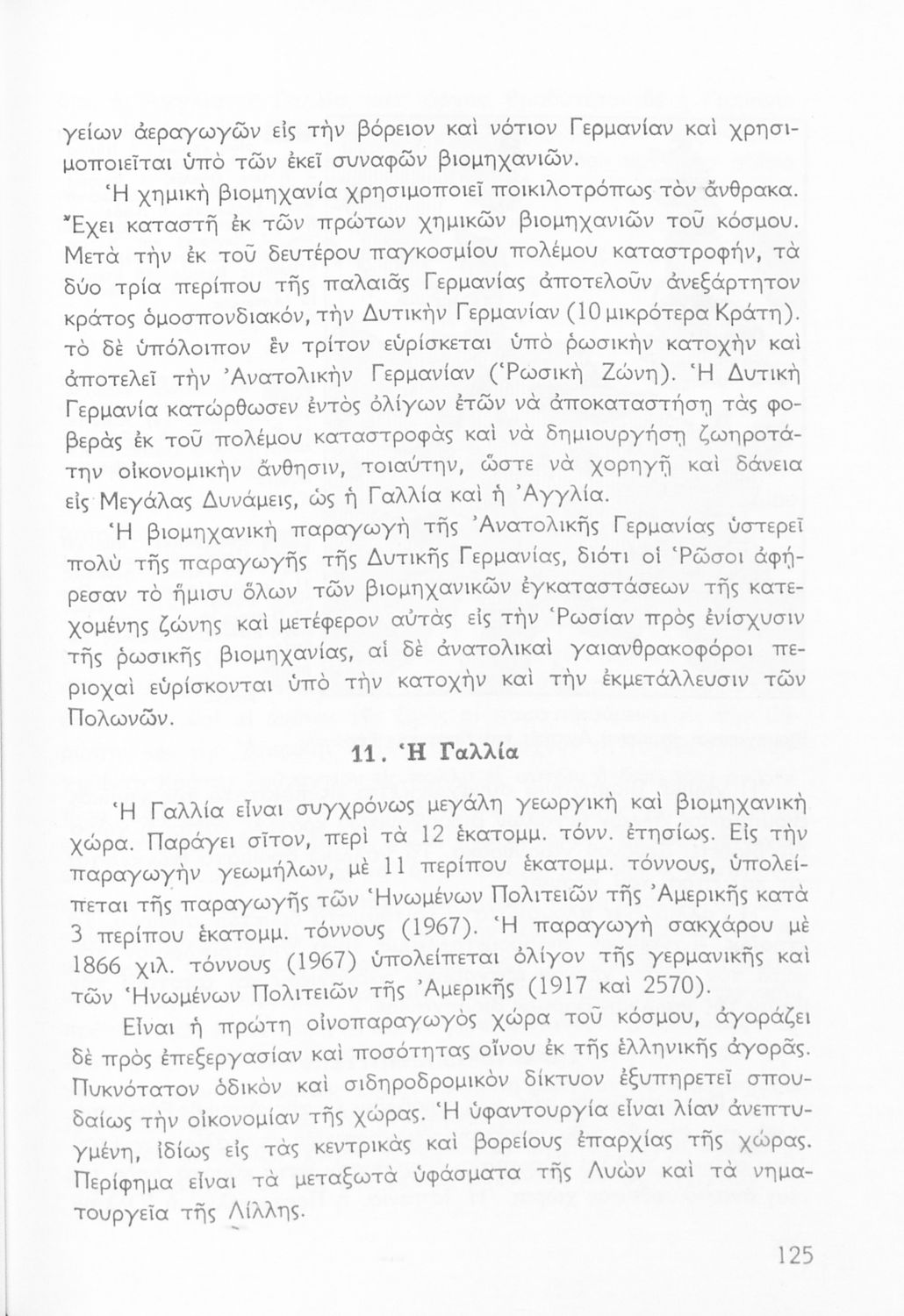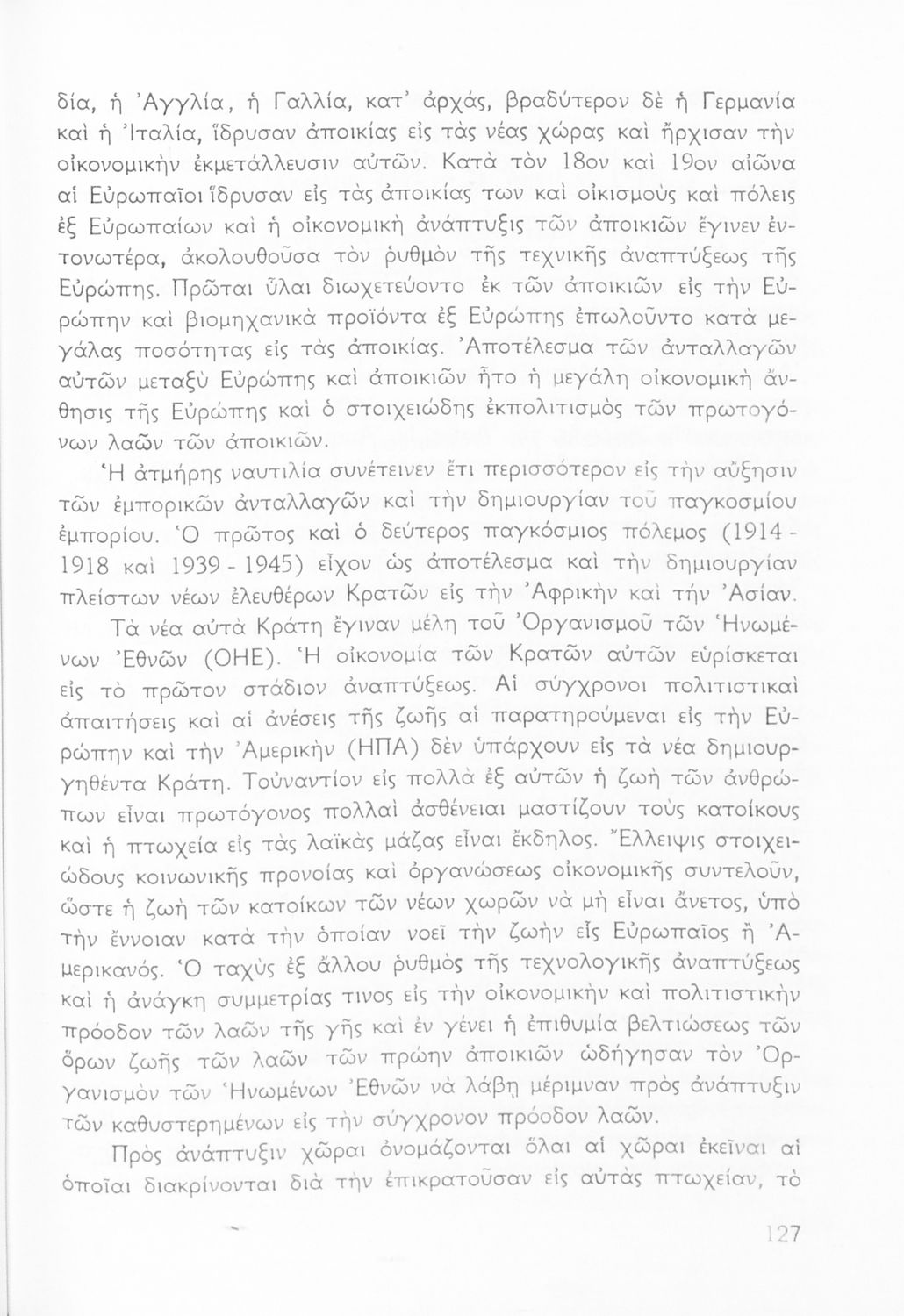 Σχολικό εγχειρίδιο Γεωγραφίας Ε' Γυμνασίου που περιλαμβάνει εισαγωγή στην ανθρωπογεωγραφία και εστιάζει στην οικονομική παραγωγή της Ελλάδας και τη σχέση της με την ΕΟΚ. Περιέχει ειδική αναφορά στα "οικονομικά και κοινωνικά επιτεύγματα της Εθνικής Κυβερνήσεως". Φέρει το σύμβολο της δικτατορίας.