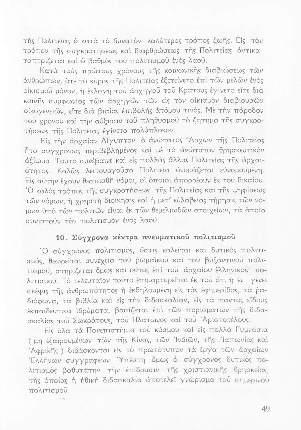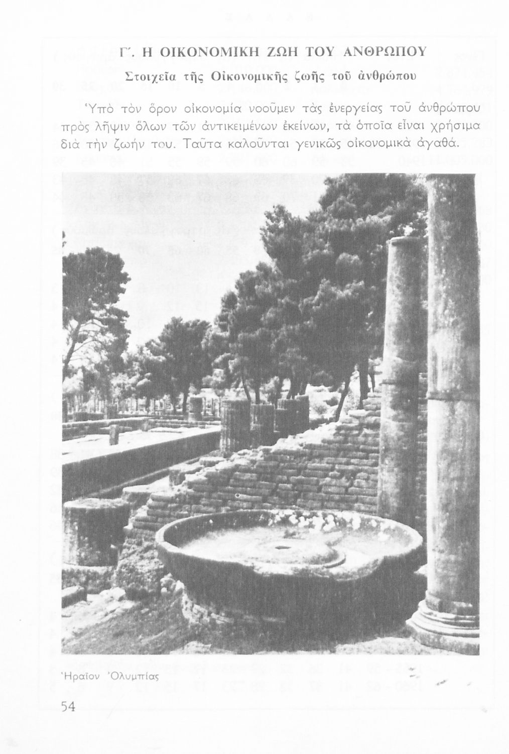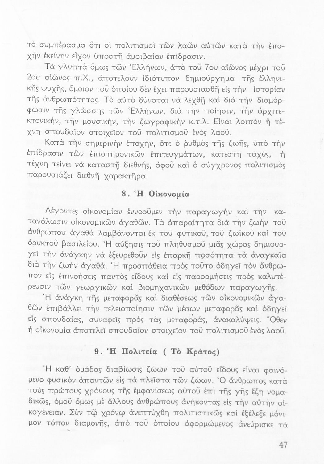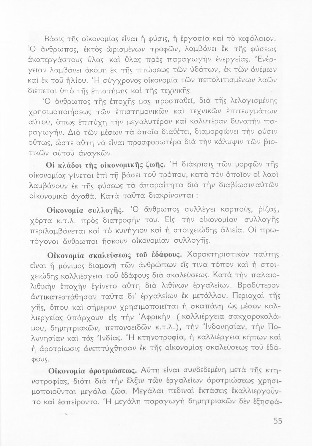 Σχολικό εγχειρίδιο Γεωγραφίας Ε' Γυμνασίου που περιλαμβάνει εισαγωγή στην ανθρωπογεωγραφία και εστιάζει στην οικονομική παραγωγή της Ελλάδας και τη σχέση της με την ΕΟΚ. Περιέχει ειδική αναφορά στα "οικονομικά και κοινωνικά επιτεύγματα της Εθνικής Κυβερνήσεως". Φέρει το σύμβολο της δικτατορίας.