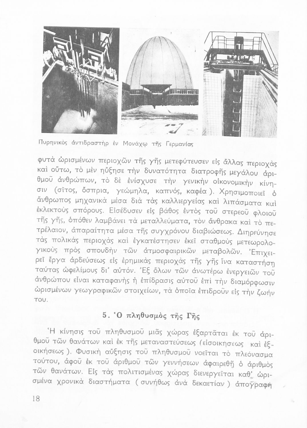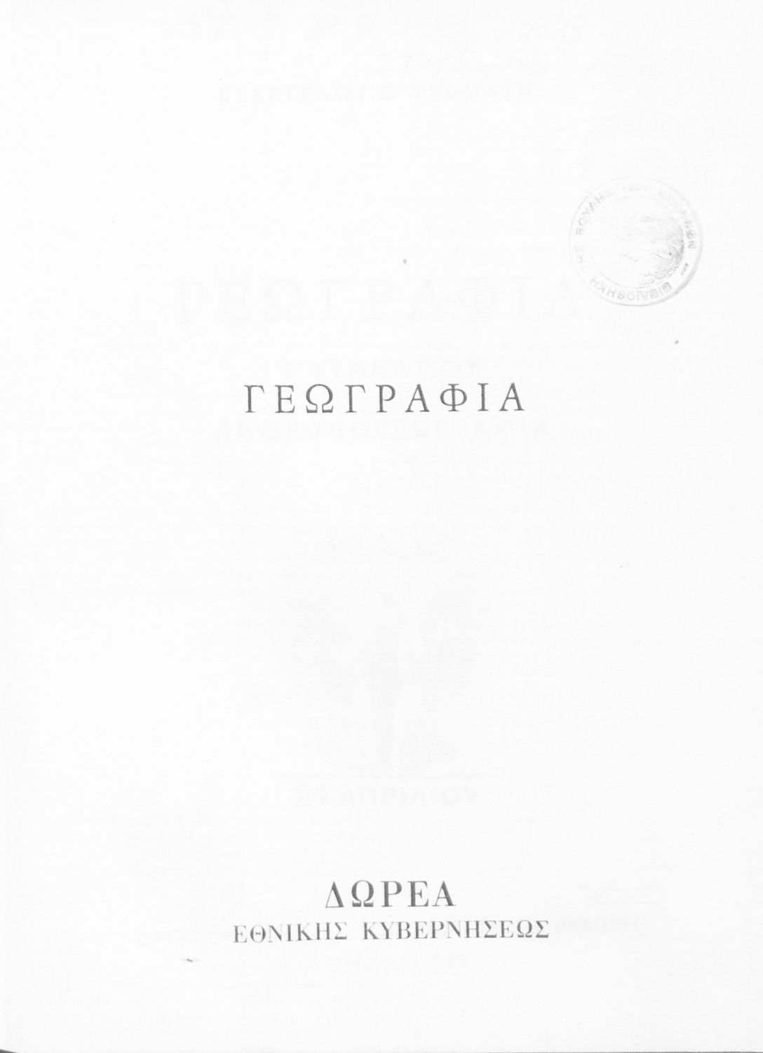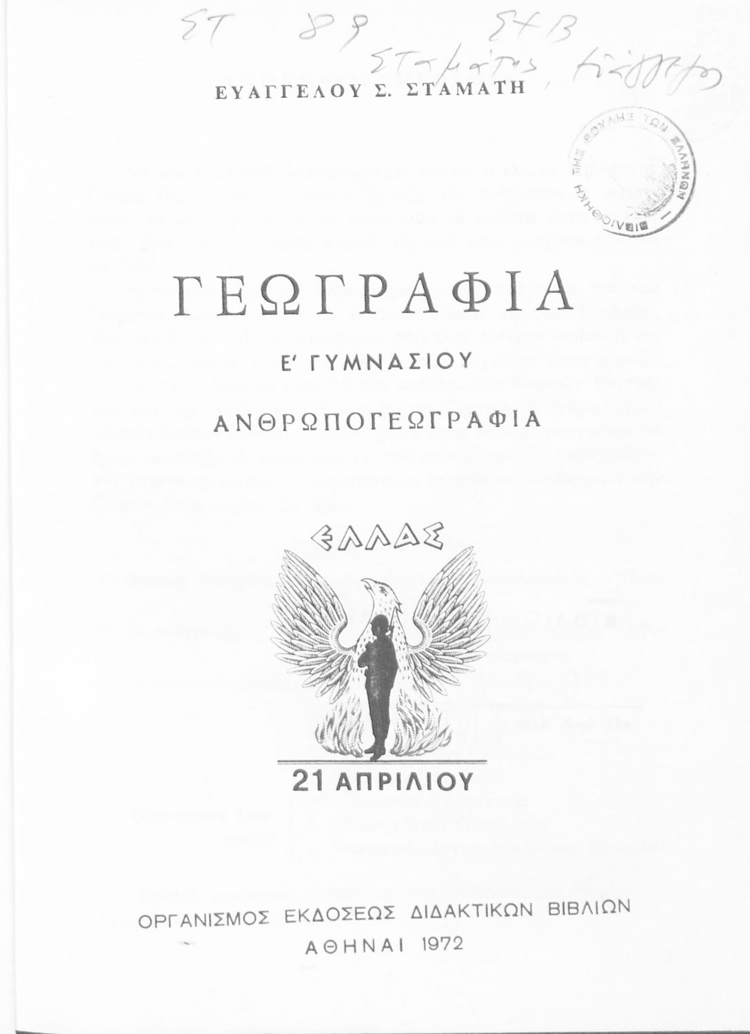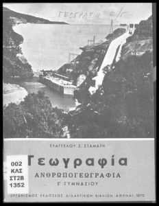 Σχολικό εγχειρίδιο Γεωγραφίας Ε' Γυμνασίου που περιλαμβάνει εισαγωγή στην ανθρωπογεωγραφία και εστιάζει στην οικονομική παραγωγή της Ελλάδας και τη σχέση της με την ΕΟΚ. Περιέχει ειδική αναφορά στα "οικονομικά και κοινωνικά επιτεύγματα της Εθνικής Κυβερνήσεως". Φέρει το σύμβολο της δικτατορίας.