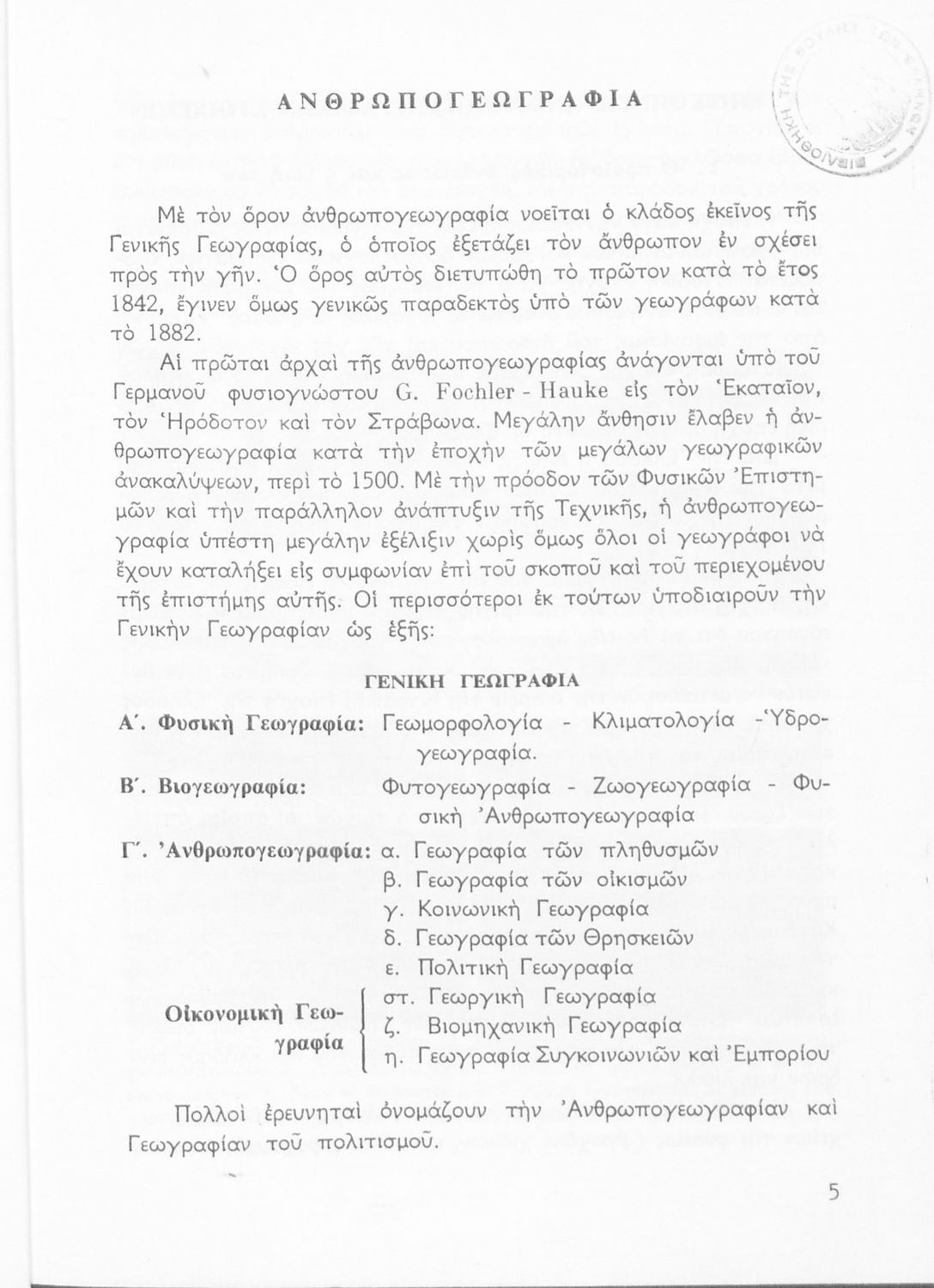 Σχολικό εγχειρίδιο Γεωγραφίας Ε΄ Γυμνασίου που περιλαμβάνει εισαγωγή στην ανθρωπογεωγραφία και την οικονομική και πολιτισμική γεωγραφία και εξετάζει την Ελλάδα από οικονομική, πολιτισμική και πολιτική άποψη.