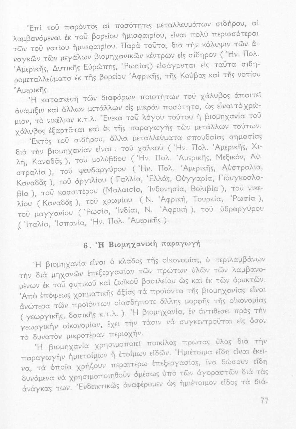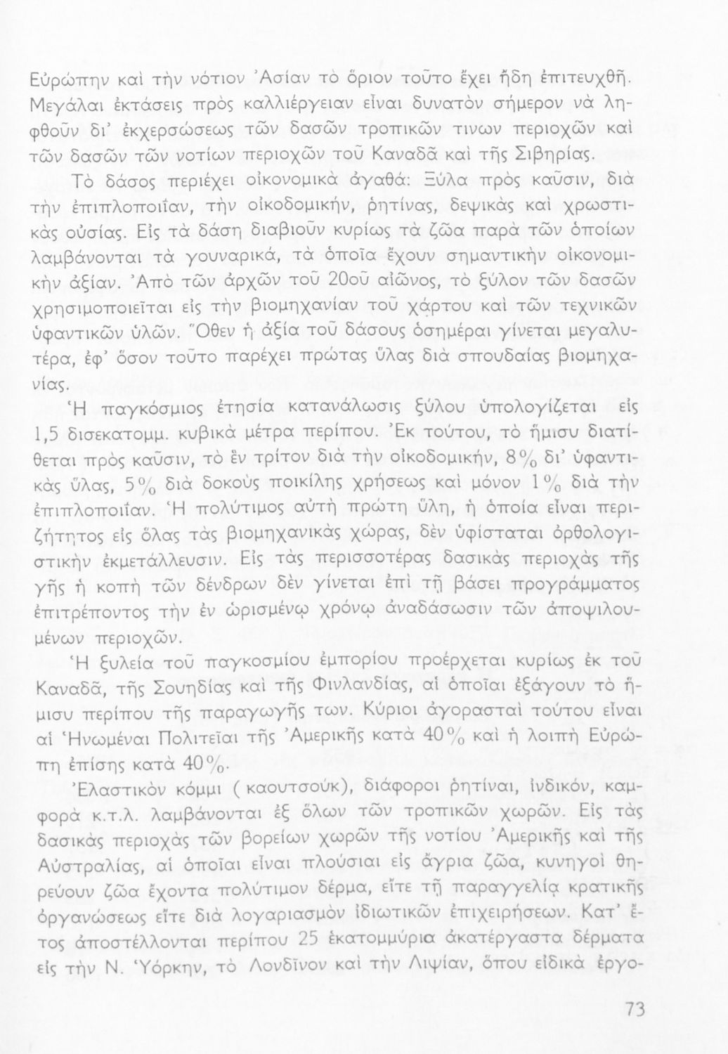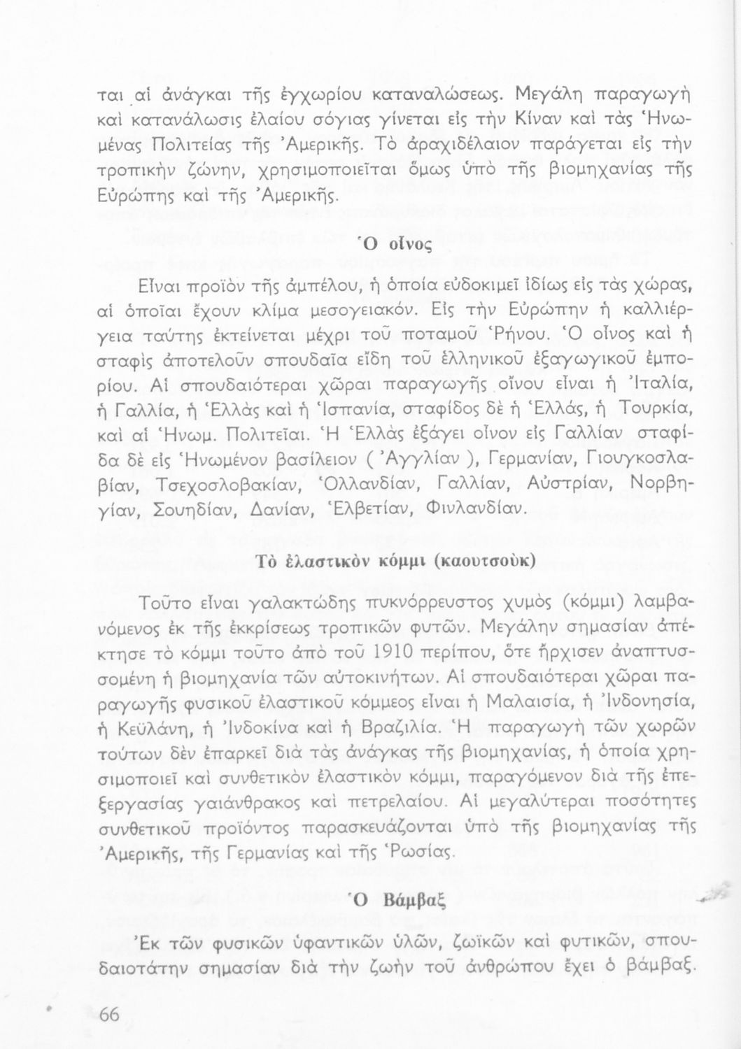 Σχολικό εγχειρίδιο Γεωγραφίας Ε' Γυμνασίου που περιλαμβάνει εισαγωγή στην ανθρωπογεωγραφία και εστιάζει στην οικονομική παραγωγή της Ελλάδας και τη σχέση της με την ΕΟΚ. Περιέχει ειδική αναφορά στα "οικονομικά και κοινωνικά επιτεύγματα της Εθνικής Κυβερνήσεως". Φέρει το σύμβολο της δικτατορίας.