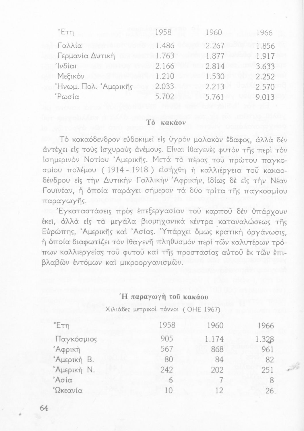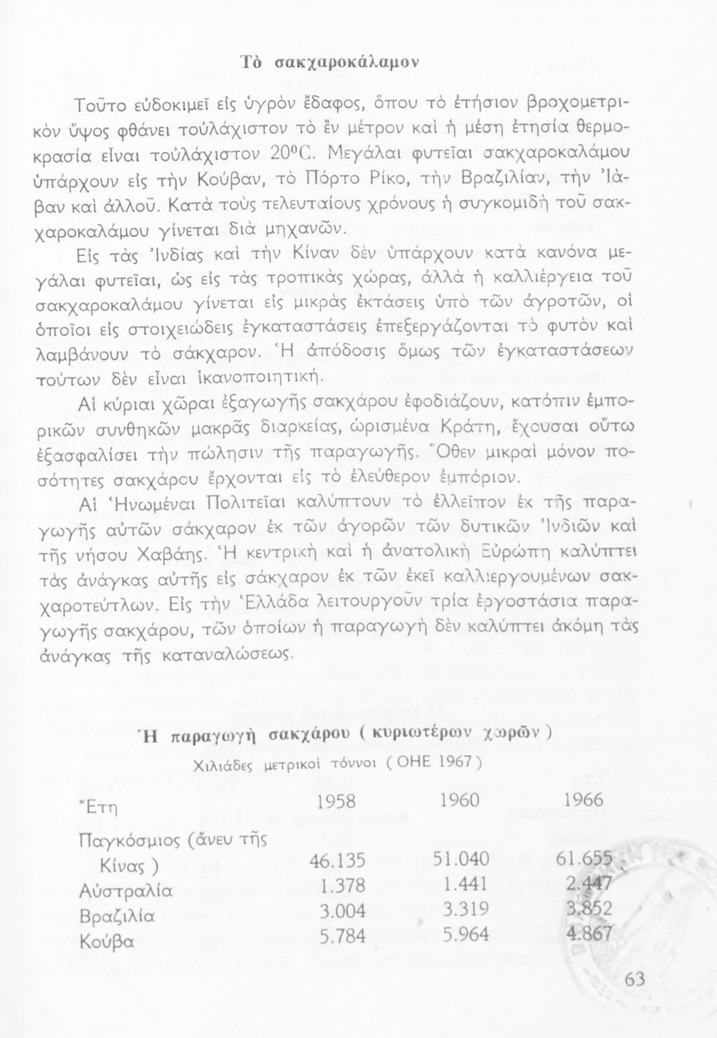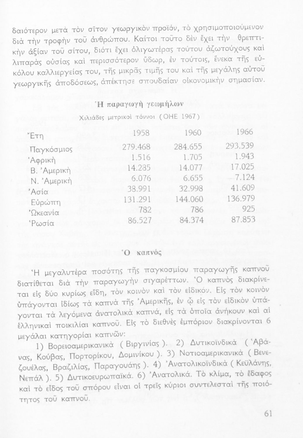 Σχολικό εγχειρίδιο Γεωγραφίας Ε' Γυμνασίου που περιλαμβάνει εισαγωγή στην ανθρωπογεωγραφία και εστιάζει στην οικονομική παραγωγή της Ελλάδας και τη σχέση της με την ΕΟΚ. Περιέχει ειδική αναφορά στα "οικονομικά και κοινωνικά επιτεύγματα της Εθνικής Κυβερνήσεως". Φέρει το σύμβολο της δικτατορίας.