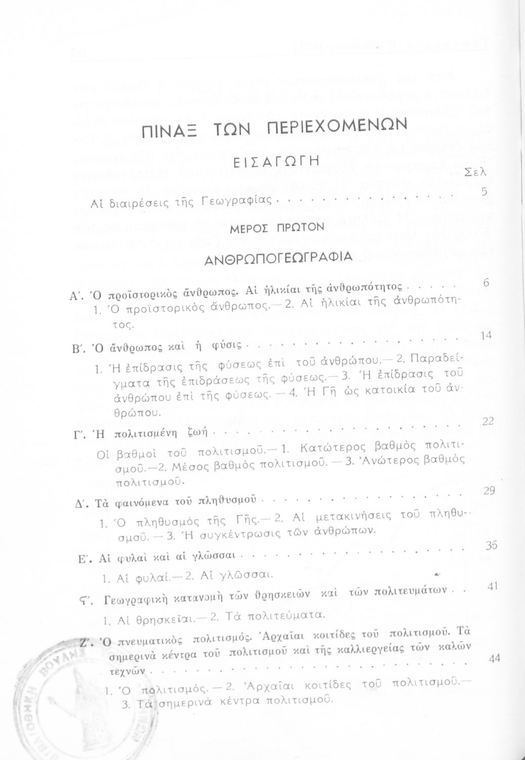 Σχολικό εγχειρίδιο Γεωγραφίας Ε' Εξαταξίου Γυμνασίου που περιλαμβάνει εισαγωγή στην ανθρωπογεωγραφία και εστιάζει στην παγκόσμια οικονομική ζωή και τις μεγάλες οικονομικές δυνάμεις. Περιέχει και γεωγραφική και οικονομική επισκόπηση της Ελλάδας καθώς και μελέτη της πολιτικής και κοινωνικής ζωής της.