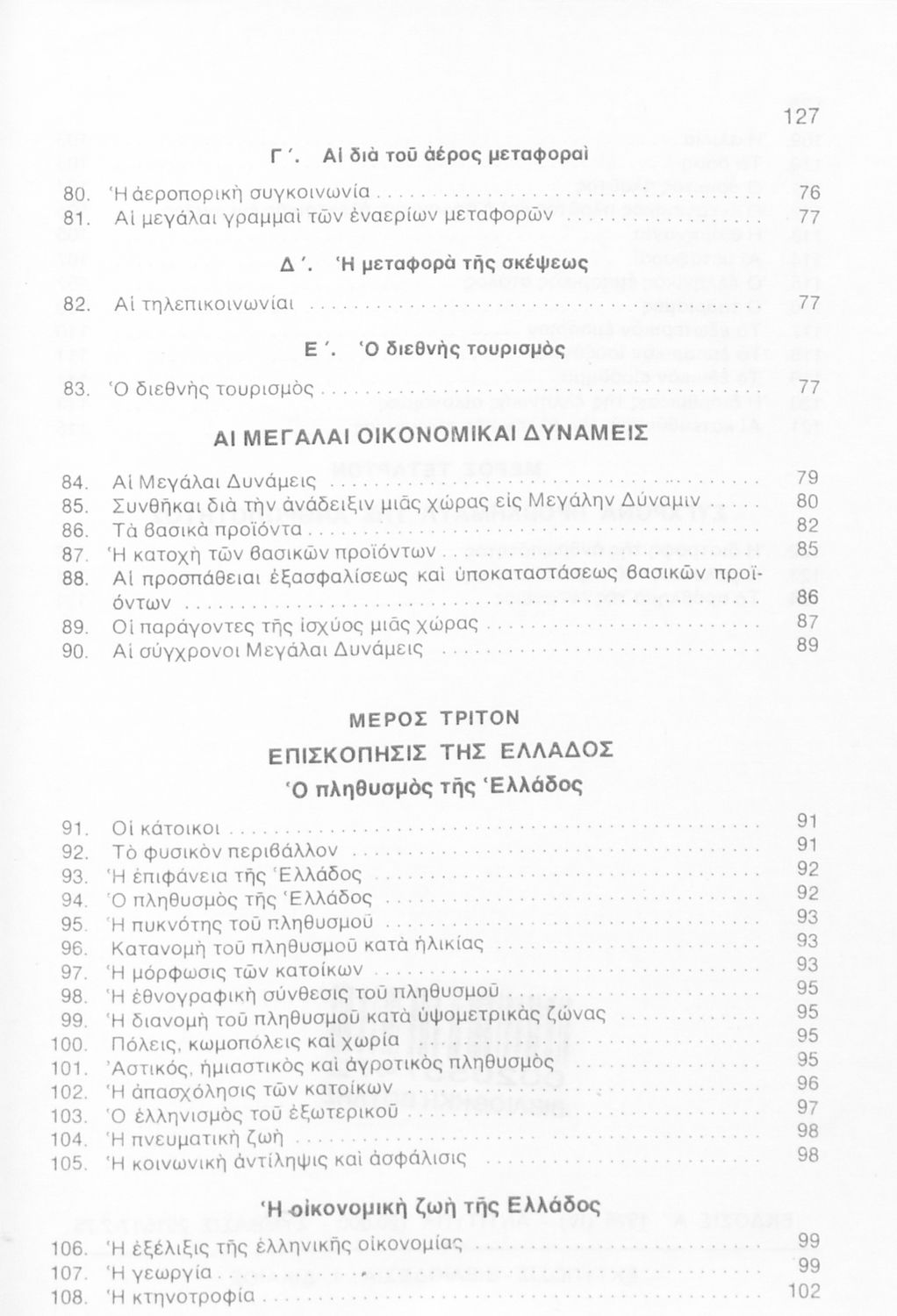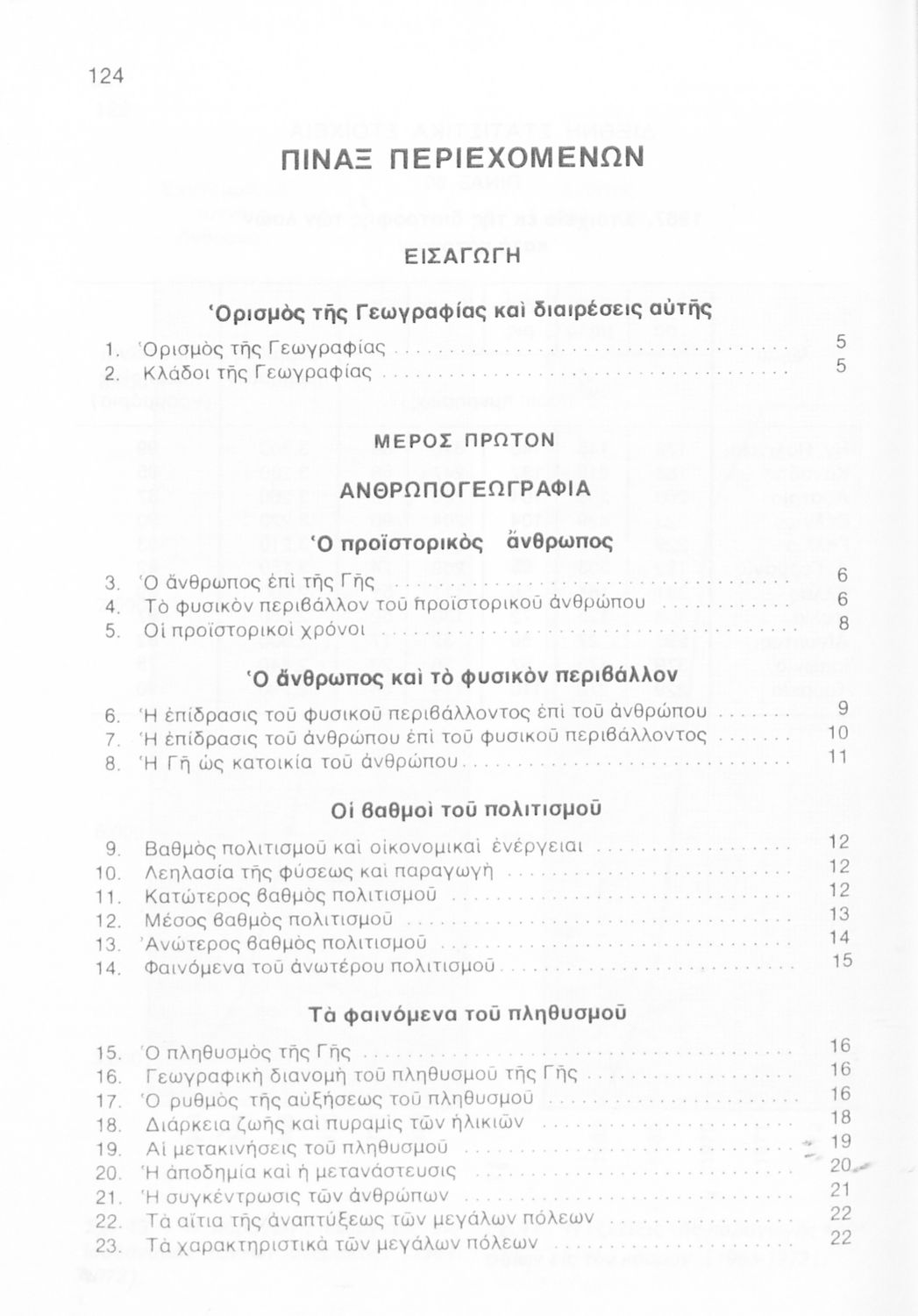 Σχολικό εγχειρίδιο Γεωγραφίας Ε΄ Γυμνασίου που εστιάζει την ανθρωπογεωγραφία, με έμφαση σε θέματα μετανάστευσης και πληθυσμιακής αύξησης, και την οικονομική γεωγραφία με έμφαση σε θέματα γεωργικής, κτηνοτροφικής, δασικής και βιομηχανικής παραγωγής. Περιέχει και στοιχεία για τον ελληνικό τουρισμό και εμπόριο.