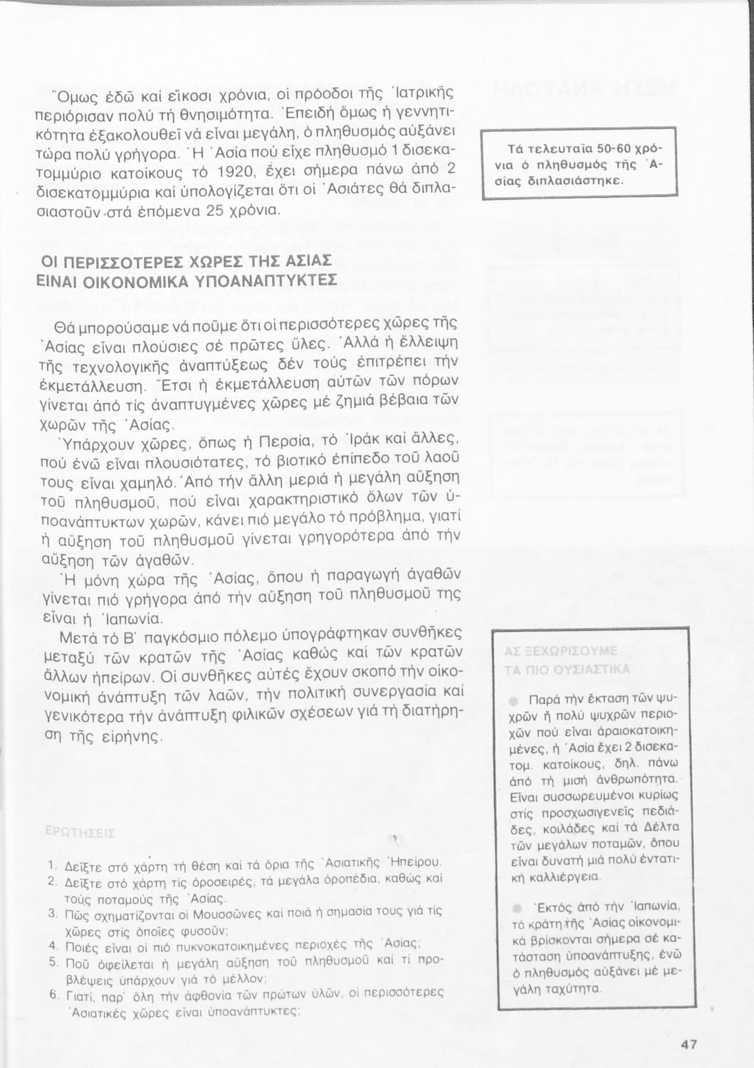 Σχολικό εγχειρίδιο Γεωγραφίας Γ΄ Γυμνασίου που παρουσιάζει τα γενικά πολιτικά, οικονομικά και γεωφυσικά χαρακτηριστικά των ηπείρων πλην της Ευρώπης και εξετάζει ενδεικτικές χώρες και περιοχές