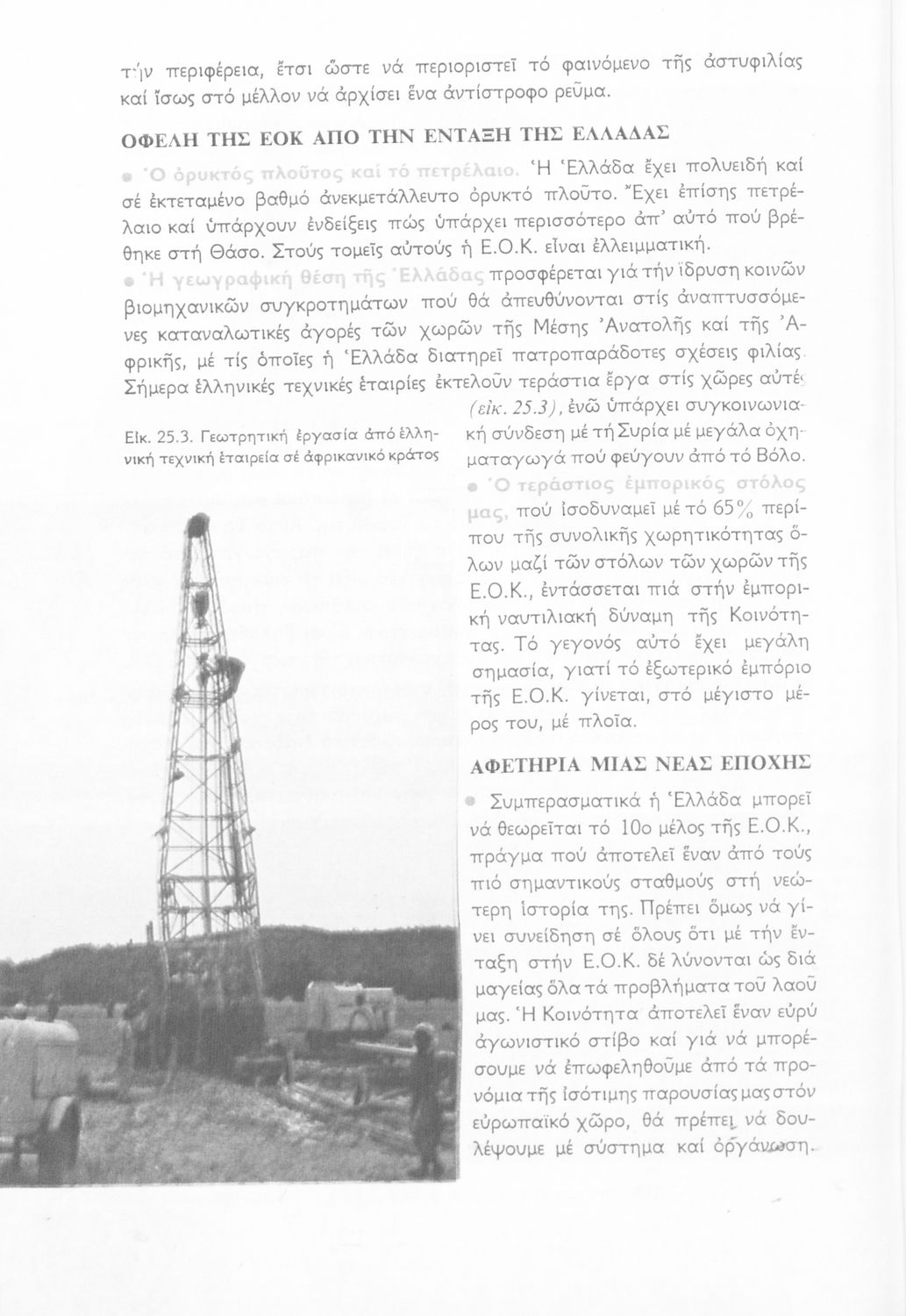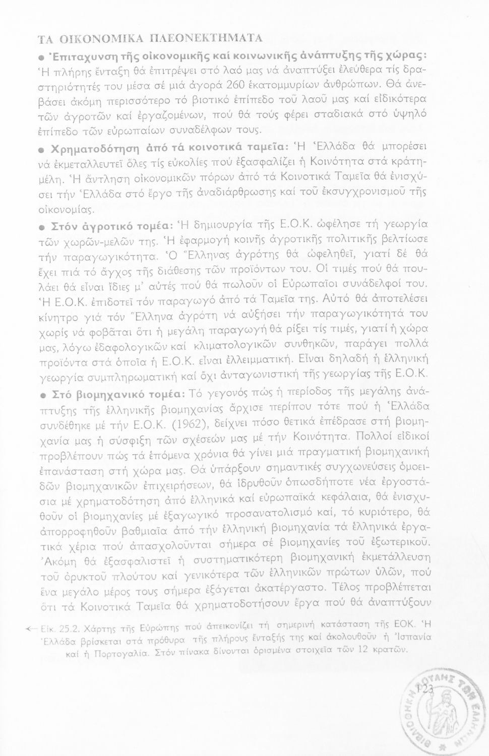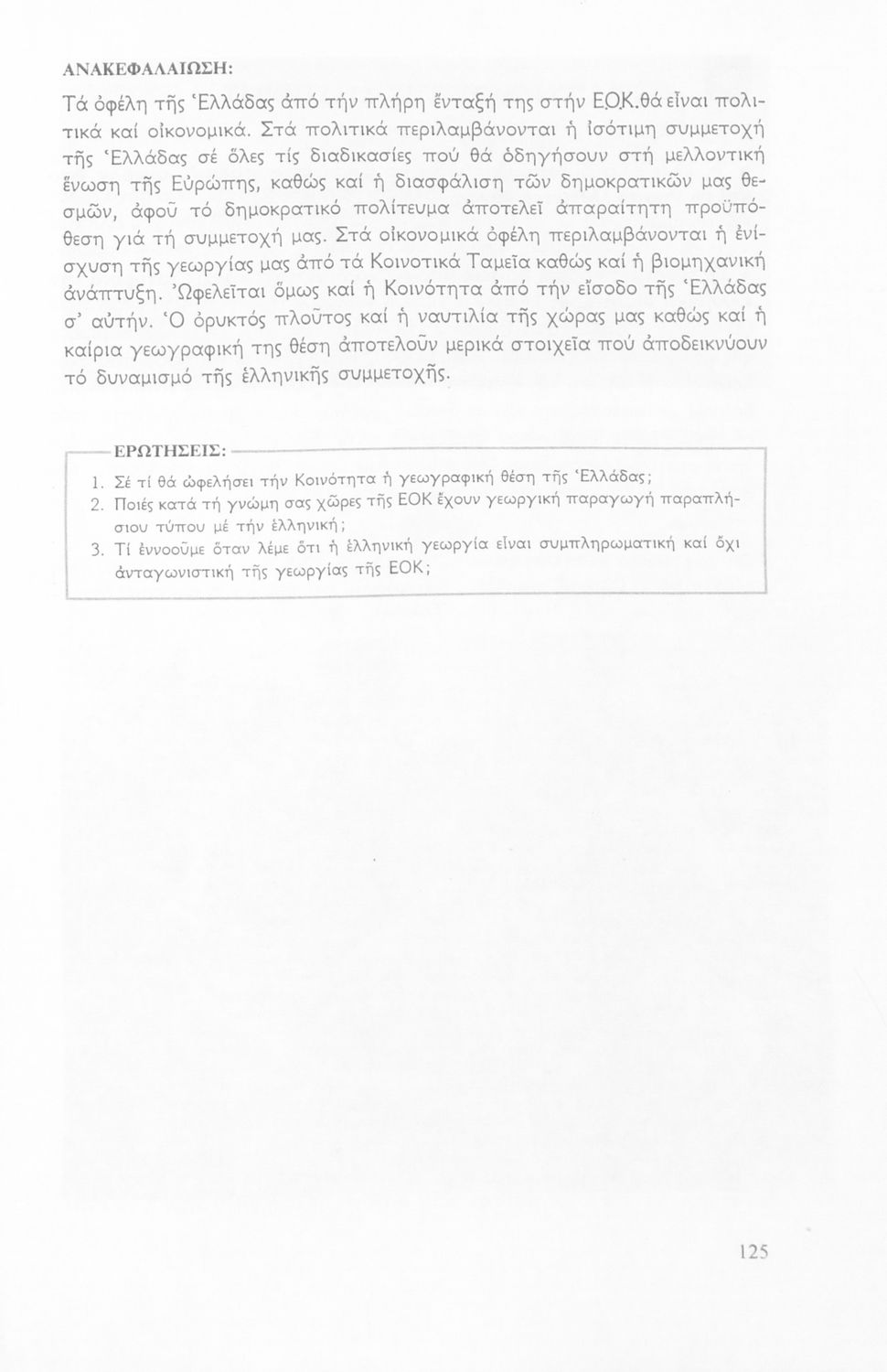 Σχολικό εγχειρίδιο Γεωγραφίας Γ΄ Γυμνασίου που αποτελεί μια γενική επισκόπηση της Ελλάδας από γεωμορφολογική, πολιτική και οικονομική σκοπιά. Περιλαμβάνει εκτεταμένη αναφορά στη σχέση Ελλάδας και ΕΟΚ.