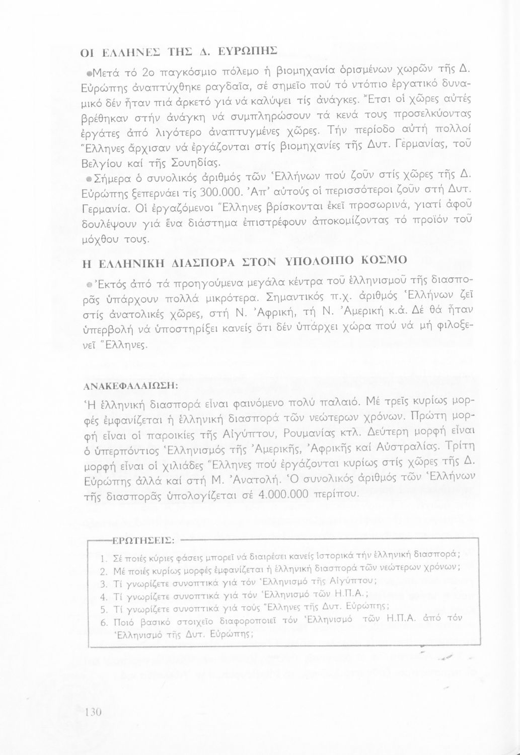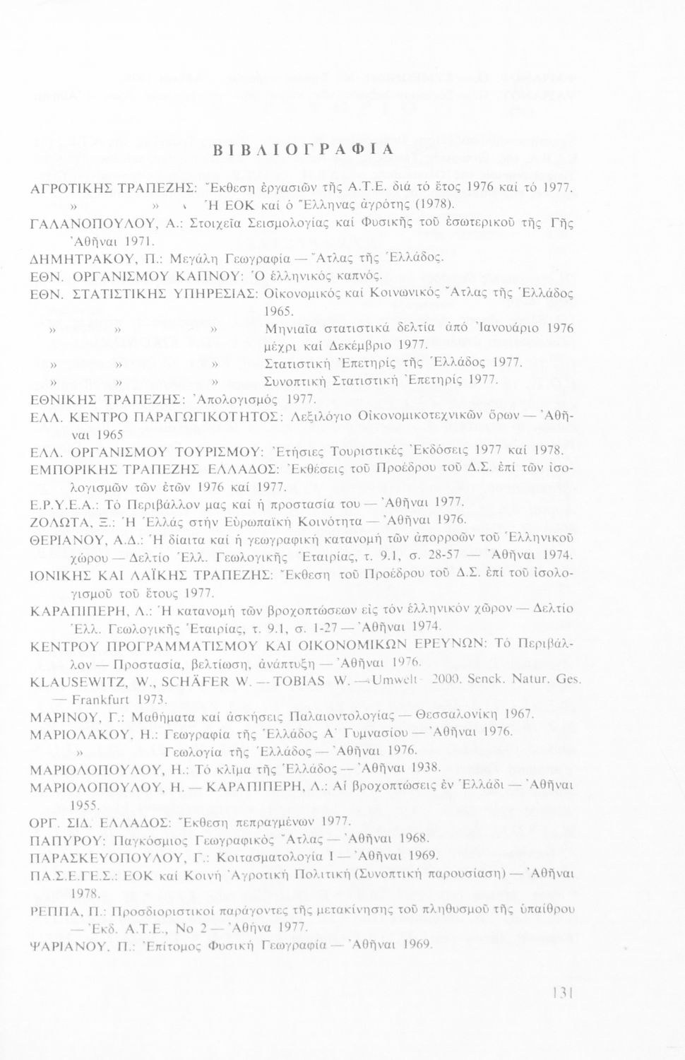 Σχολικό εγχειρίδιο Γεωγραφίας της Γ' Γυμνασίου. Το βιβλίο ξεκινά με μια γεωφυσική παρουσίαση του ελληνικού χώρου όπου αναφέρεται στα είδη των πετρωμάτων της Ελλάδας για να συνεχίσει με μια ανθρωπογεωγραφική προσέγγιση εξετάζοντας την πληθυσμιακή σύσταση της χώρας. Στο τρίτο μέρος περιγράφει τη γεωργία, την κτηνοτροφία, την αλιεία και τη δασονομία της χώρας. Τέλος, παρουσιάζει την οικονομική γεωγραφία της Ελλάδας, το εμπόριο και τον τουρισμό, και κλείνει αναλύοντας την περίπτωση της Ελλάδας σε σχέση με το Ευρωπαϊκό πλαίσιο.