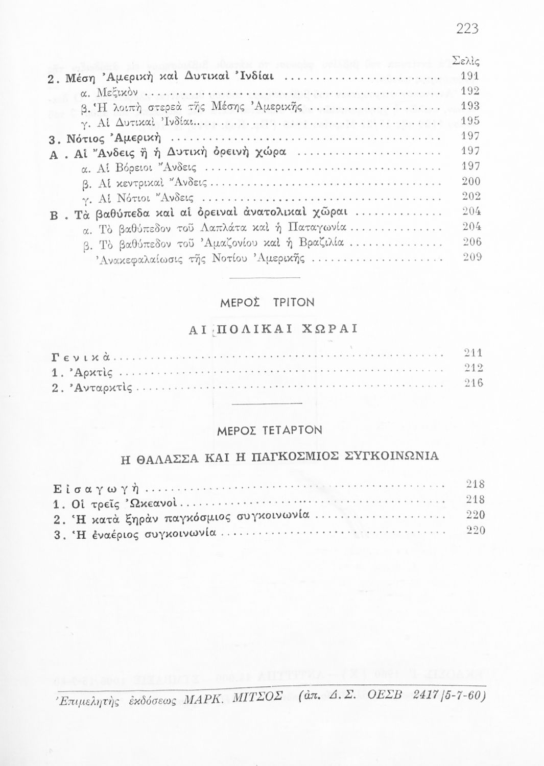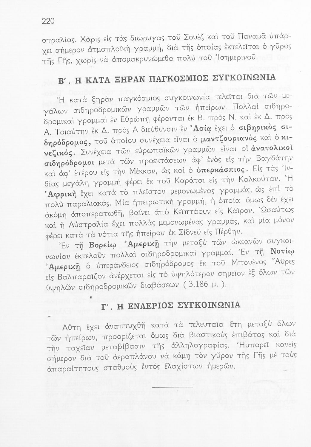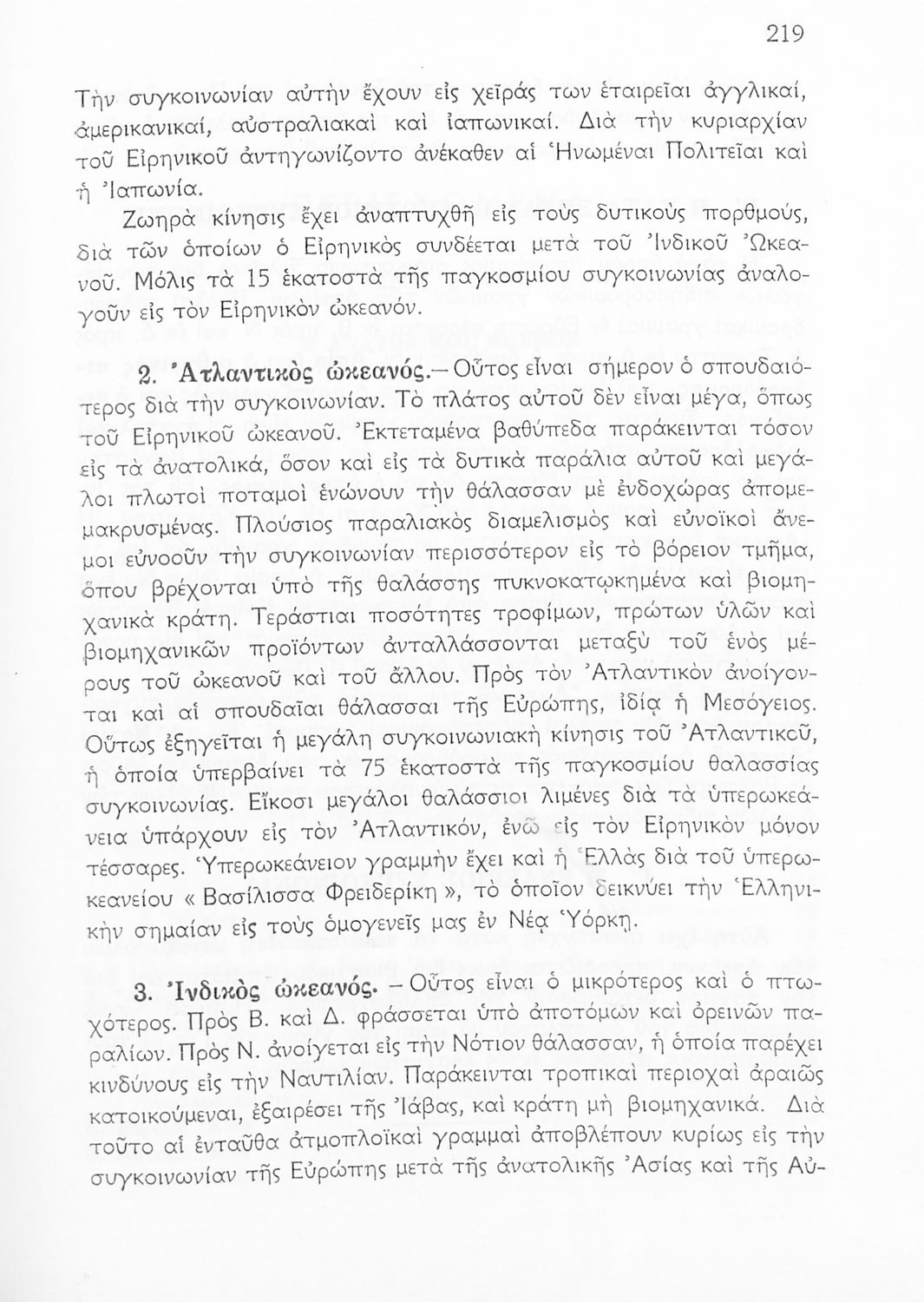 Βαθμίδα εκπαίδευσης: Δευτεροβάθμια Τάξη: Γ' Γυμνασίου Μάθημα: Γεωγραφία Γλώσσα: Καθαρεύουσα Παρουσίαση περιεχομένου: Σχολικό εγχειρίδιο Γεωγραφίας Γ΄ Γυμνασίου που παρουσιάζει τις ηπείρους εκτός της Ευρώπης από γεωφυσική, πολιτική, πολιτισμική και οικονομική σκοπιά. Γίνεται ειδική αναφορά στις παγκόσμιες συγκοινωνίες. |
