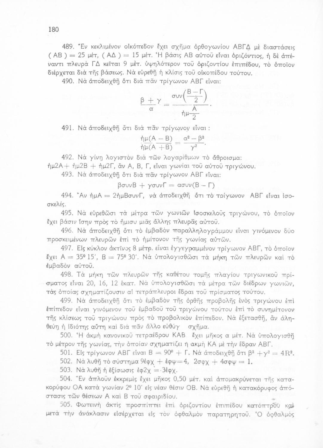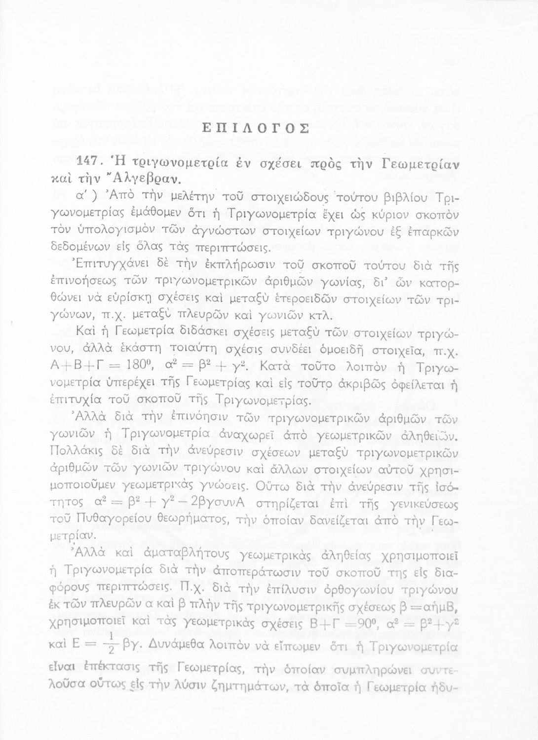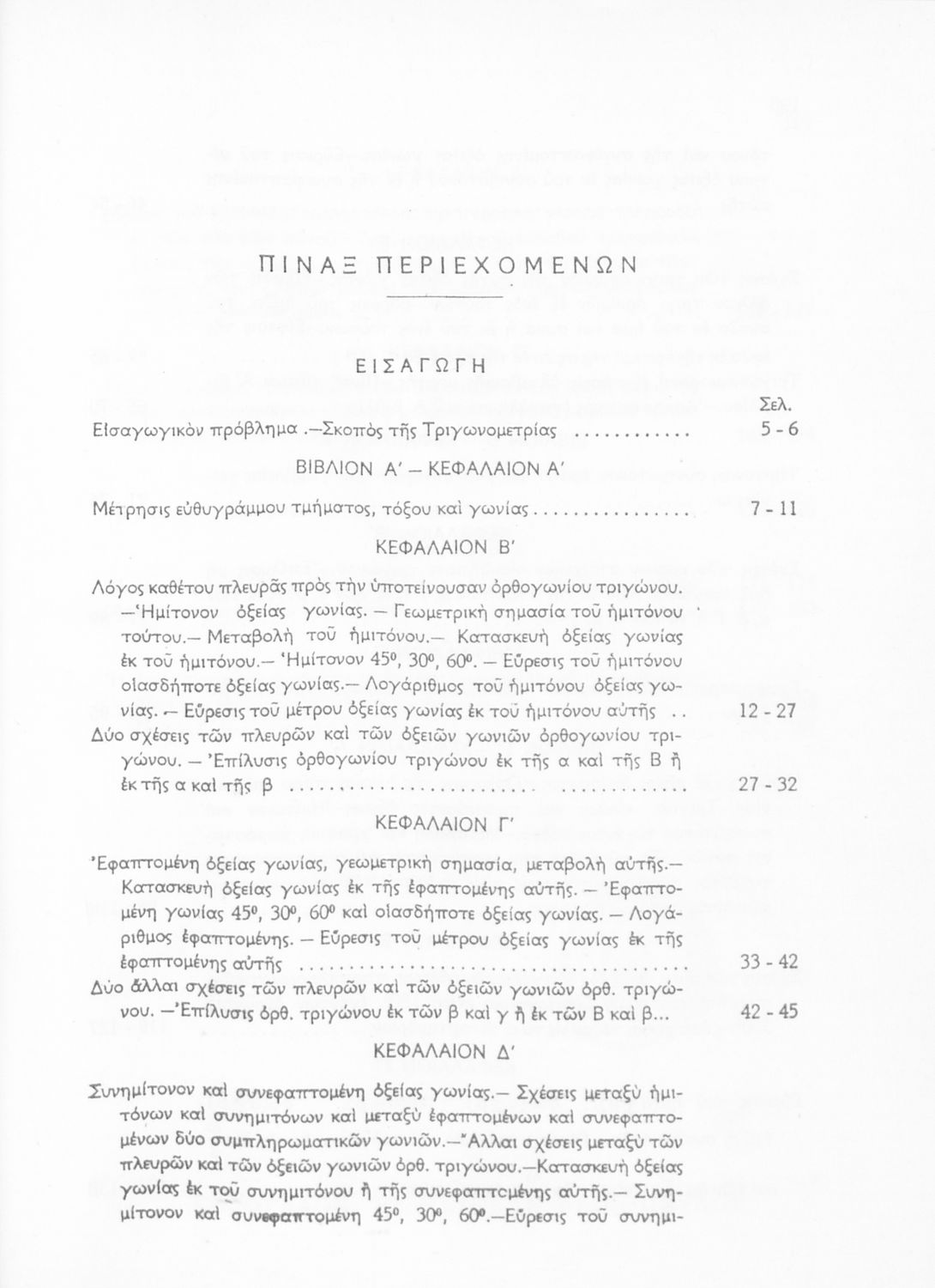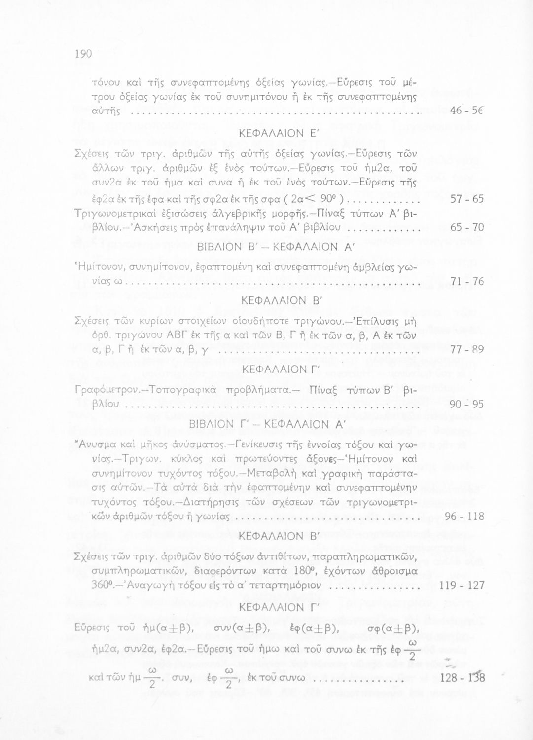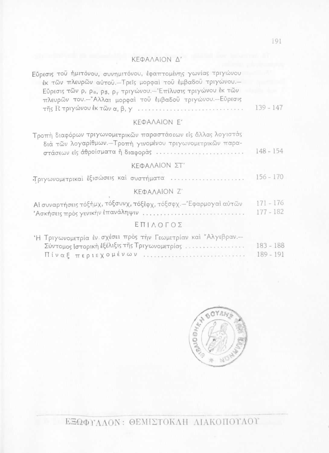 Βαθμίδα εκπαίδευσης: Δευτεροβάθμια Τάξη: Γ' Λυκείου Μάθημα: Τριγωνομετρία Γλώσσα: Καθαρεύουσα Παρουσίαση περιεχομένου: Σχολικό εγχειρίδιο Μαθηματικών της Γ΄ Λυκείου. Το βιβλίο περιέχει ασκήσεις τριγωνομετρίας. Εισάγει τους μαθητές στα διαφορετικά είδη τριγώνων, τις ιδιότητες και τα χαρακτηριστικά τους καθώς και στον τρόπο υπολογισμού διαφόρων στοιχείων τους όπως το εμβαδόν και η περιφέρεια. |