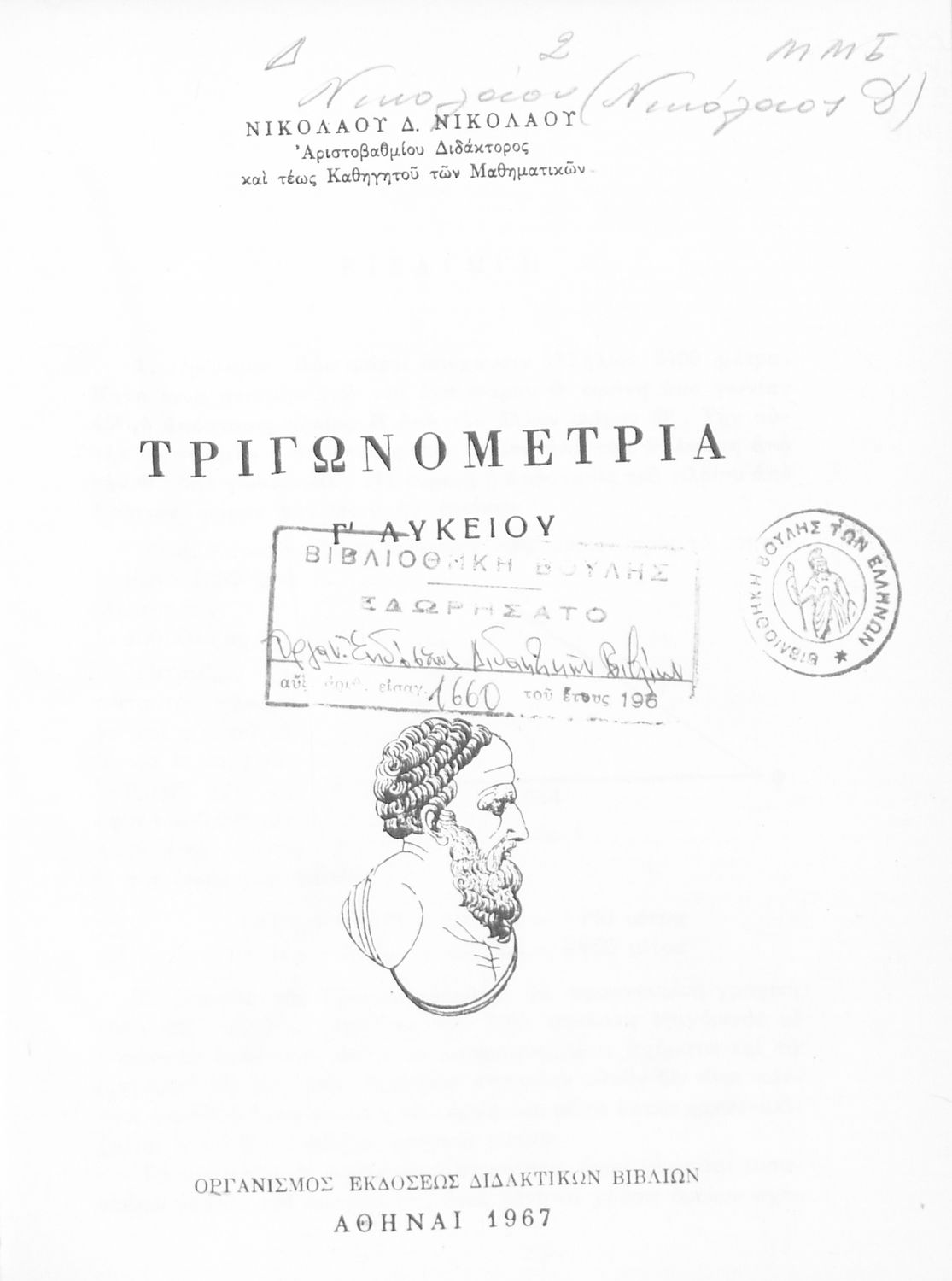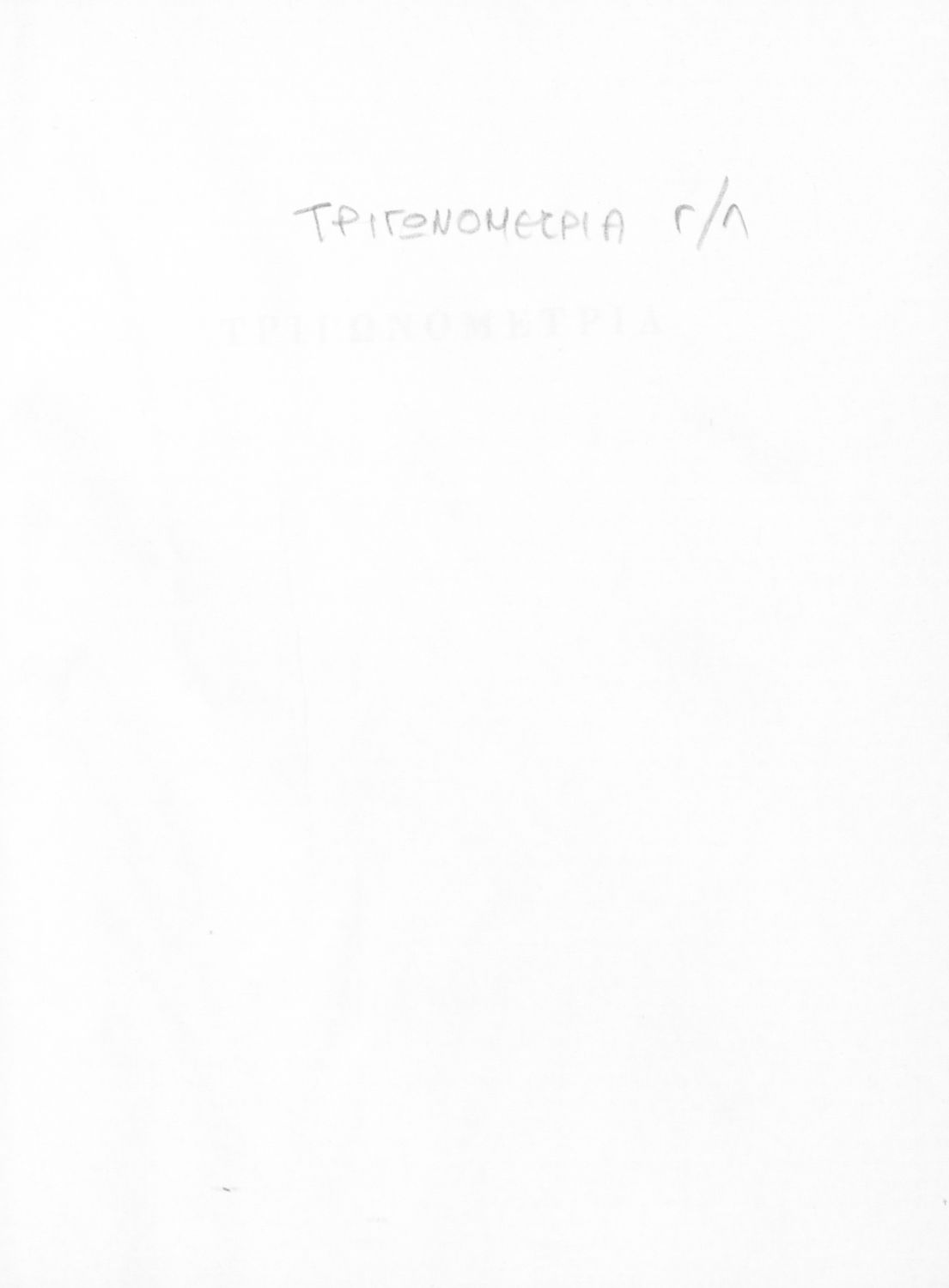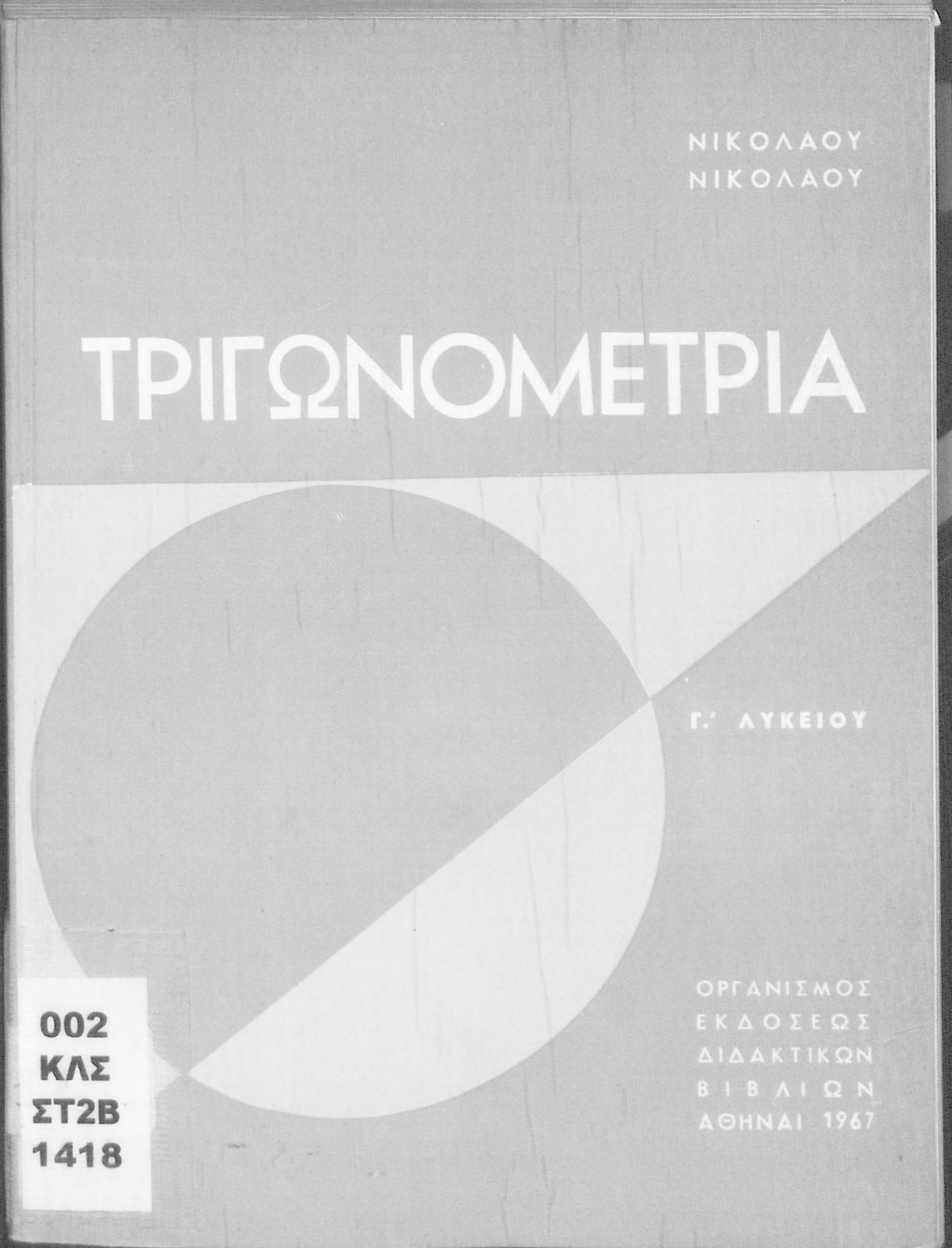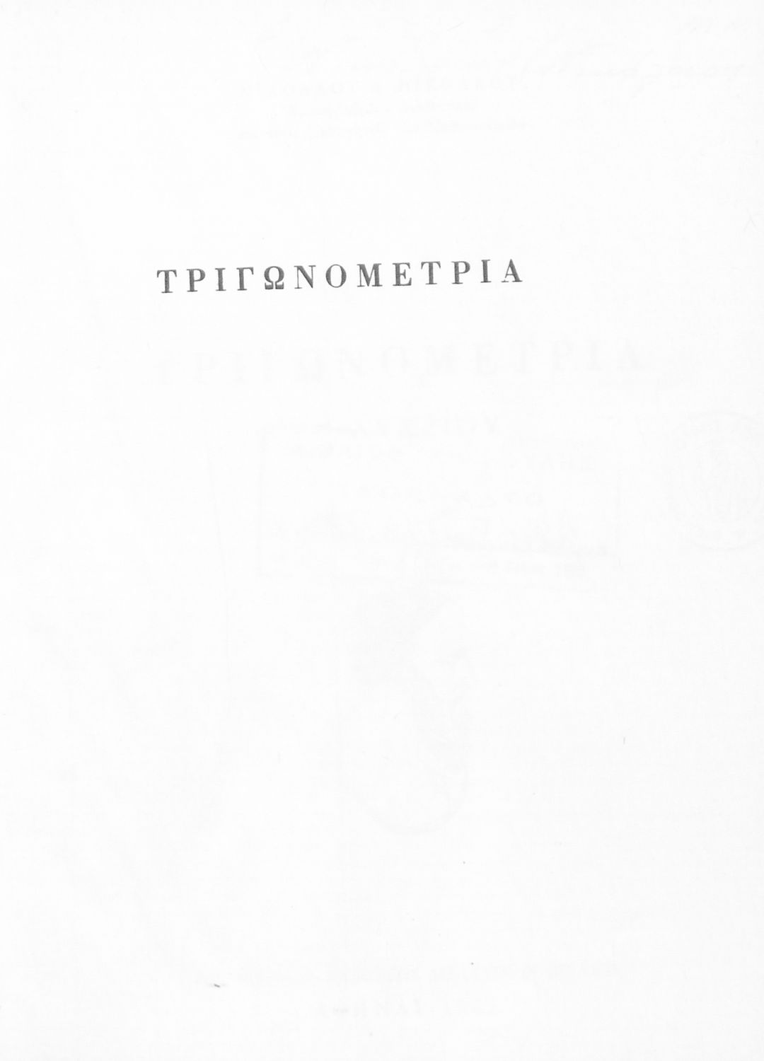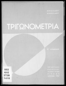 Βαθμίδα εκπαίδευσης: Δευτεροβάθμια Τάξη: Γ' Λυκείου Μάθημα: Τριγωνομετρία Γλώσσα: Καθαρεύουσα Παρουσίαση περιεχομένου: Σχολικό εγχειρίδιο Μαθηματικών της Γ΄ Λυκείου. Το βιβλίο περιέχει ασκήσεις τριγωνομετρίας. Εισάγει τους μαθητές στα διαφορετικά είδη τριγώνων, τις ιδιότητες και τα χαρακτηριστικά τους καθώς και στον τρόπο υπολογισμού διαφόρων στοιχείων τους όπως το εμβαδόν και η περιφέρεια. |