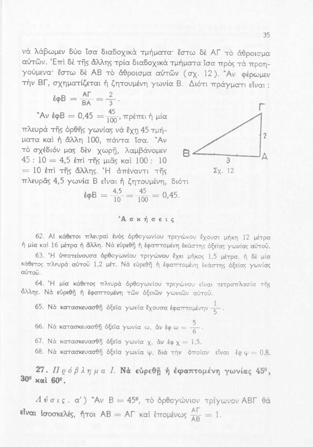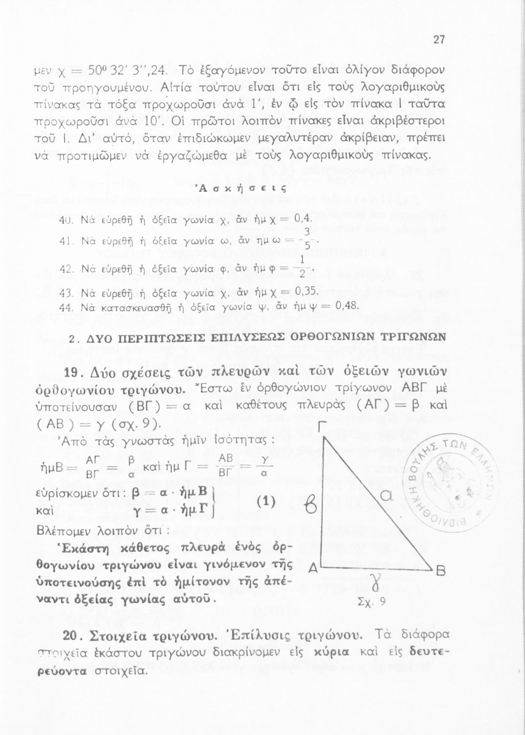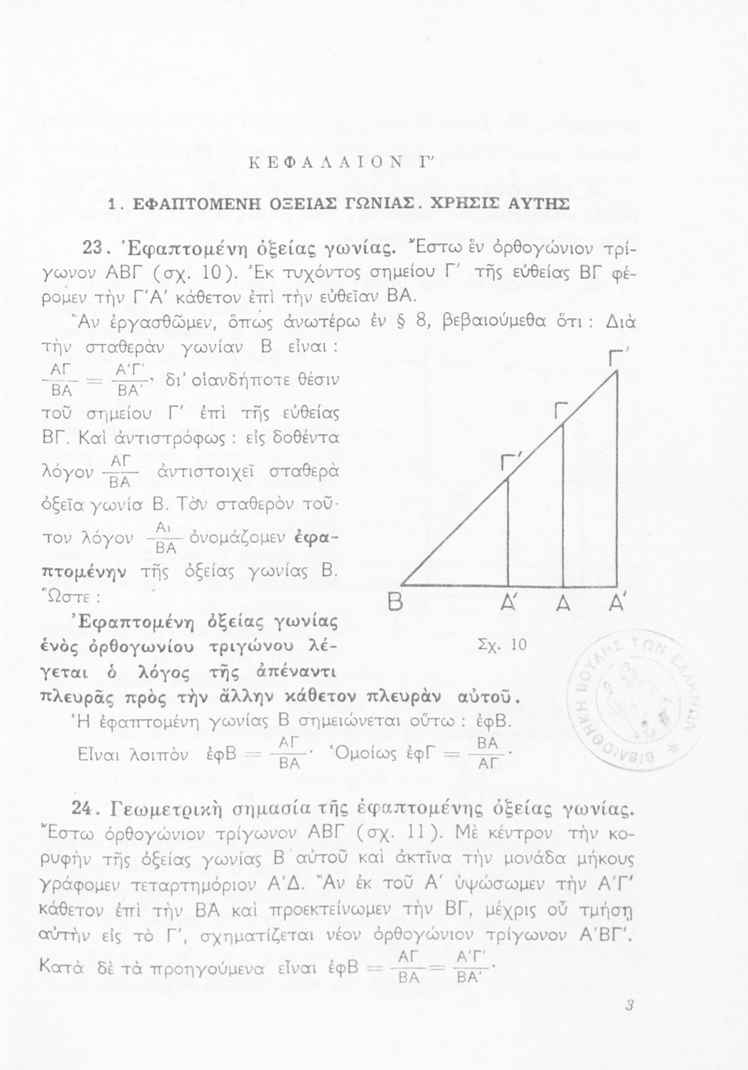 Σχολικό εγχειρίδιο Τριγωνομετρίας για τις Δ΄, Ε΄ και ΣΤ΄ Γυμνασίου που περιλαμβάνει θεωρία και ασκήσεις. Φέρει το σύμβολο της δικτατορίας.