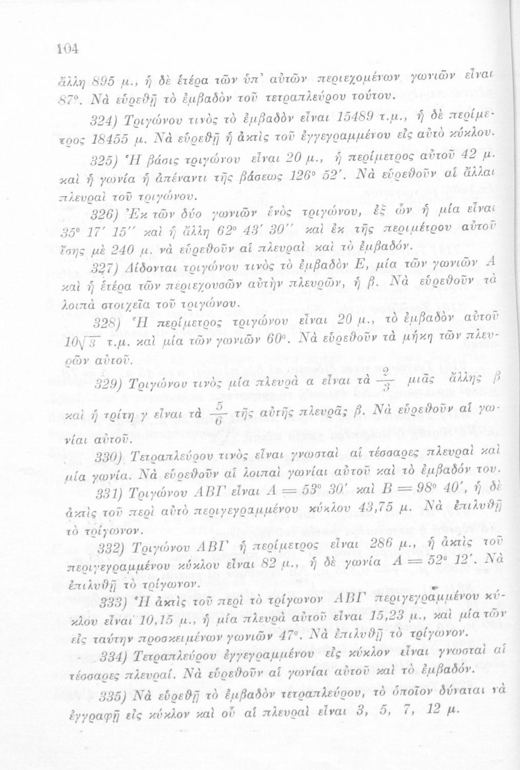 Παρουσίαση περιεχομένου: Σχολικό εγχειρίδιο Μαθηματικών της ΣΤ΄ Παλαιού Τύπου. Το βιβλίο περιέχει ασκήσεις τριγωνομετρίας. Εισάγει τους μαθητές στα διαφορετικά είδη τριγώνων, τις ιδιότητες και τα χαρακτηριστικά τους καθώς και στον τρόπο υπολογισμού διαφόρων στοιχείων τους όπως το εμβαδόν και η περιφέρεια.