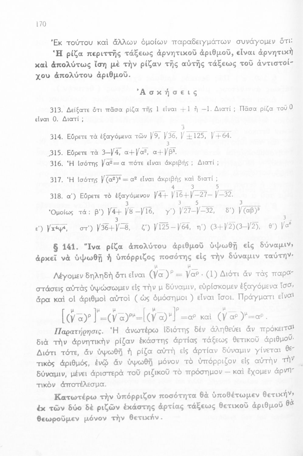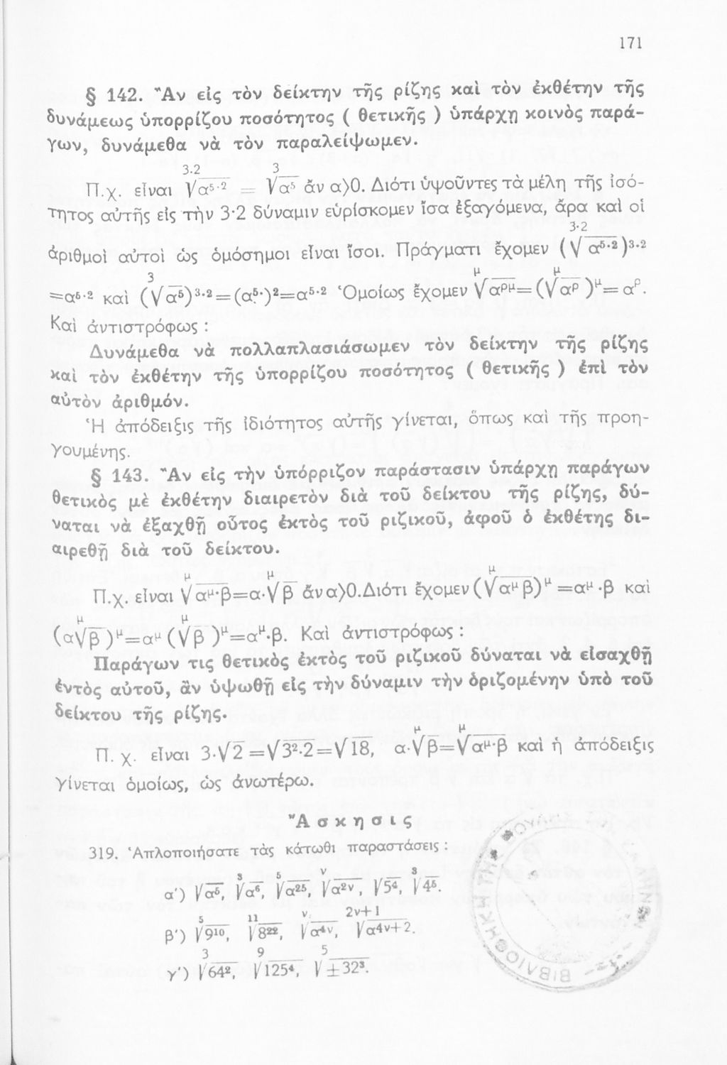 Σχολικό εγχειρίδιο Άλγεβρας Δ΄ Γυμνασίου που εστιάζει στις ιδιότητες των αριθμών, στις εξισώσεις, στους λογάριθμους και στις παραγώγους. Ο συγγραφέας ήταν καθηγητής στο Πανεπιστήμιο. Φέρει το σύμβολο της ...