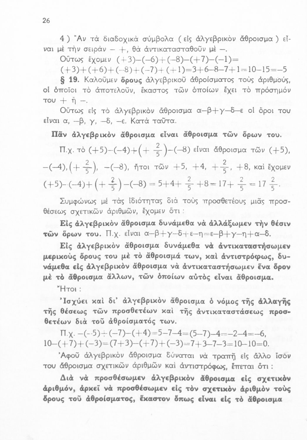 Σχολικό εγχειρίδιο Μαθηματικών Δ', Ε' και ΣΤ΄ τάξεων του Γυμνασίου που παρουσιάζει τις βασικές έννοιες της Άλγεβρας, εστιάζει τις ιδιότητες των αριθμών και περιέχει ασκήσεις εξισώσεων, λογαρίθμων και παραγώγων.