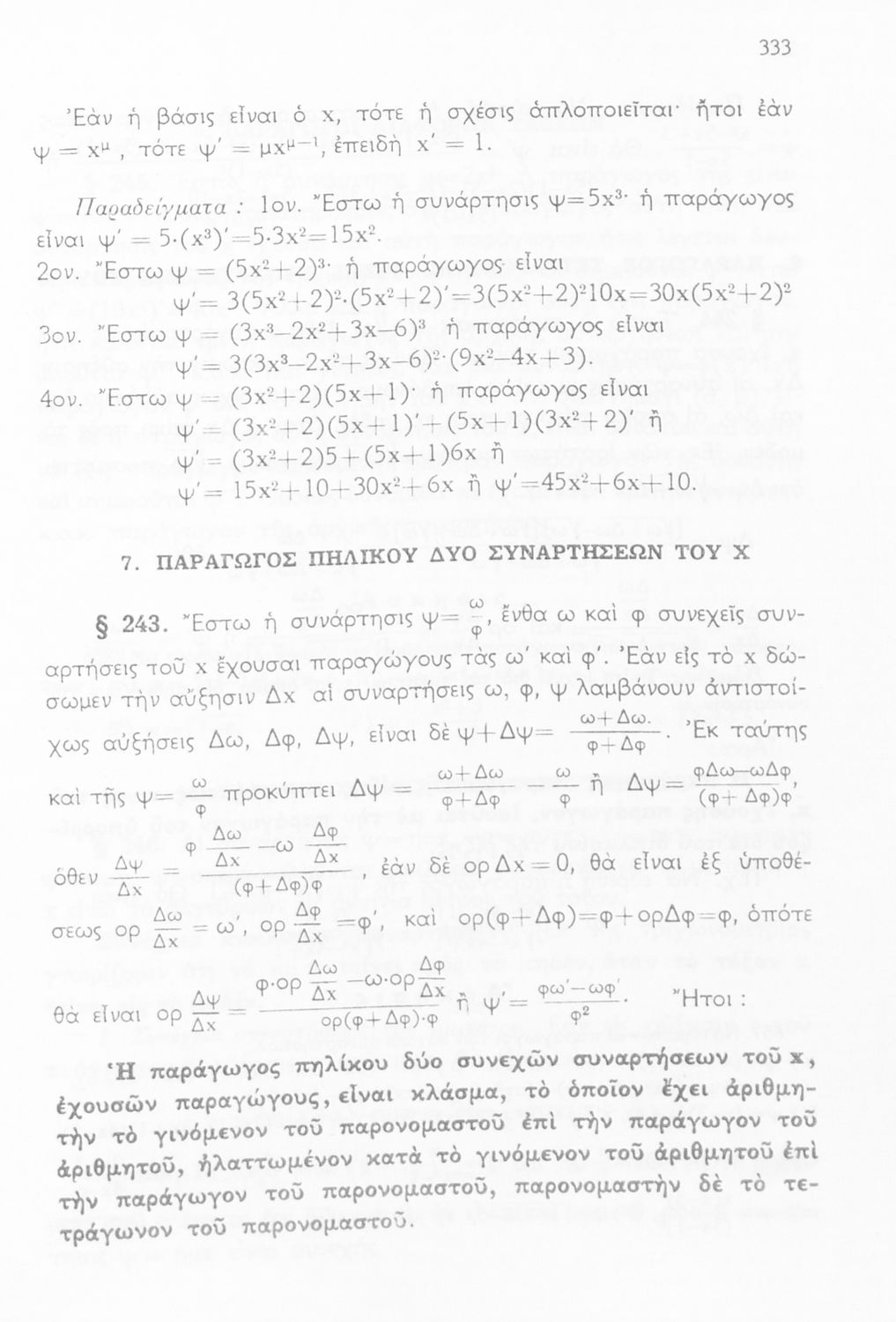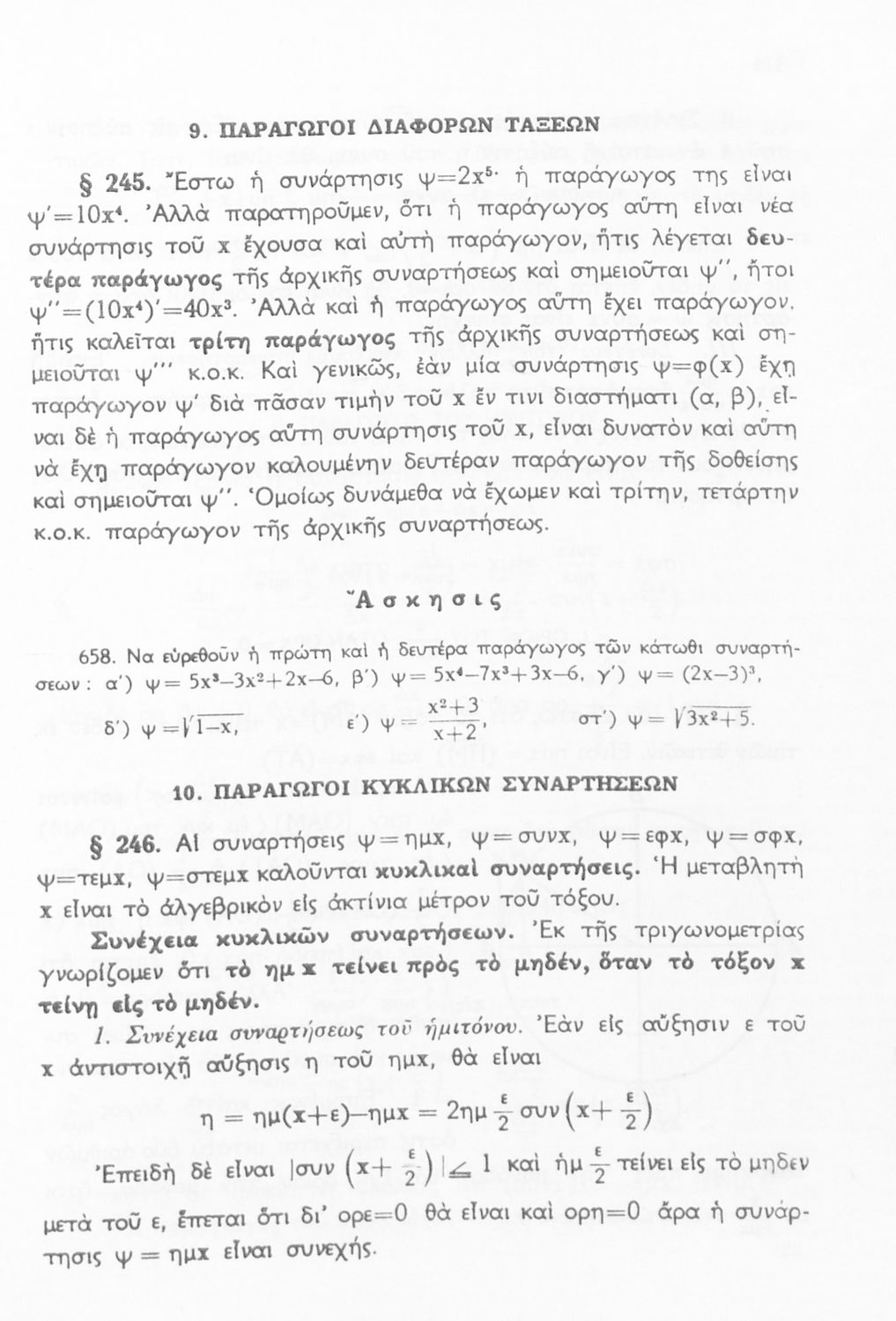 Σχολικό εγχειρίδιο Άλγεβρας Δ΄ Γυμνασίου που εστιάζει στις ιδιότητες των αριθμών, στις εξισώσεις, στους λογάριθμους και στις παραγώγους. Ο συγγραφέας ήταν καθηγητής στο Πανεπιστήμιο. Φέρει το σύμβολο της ...