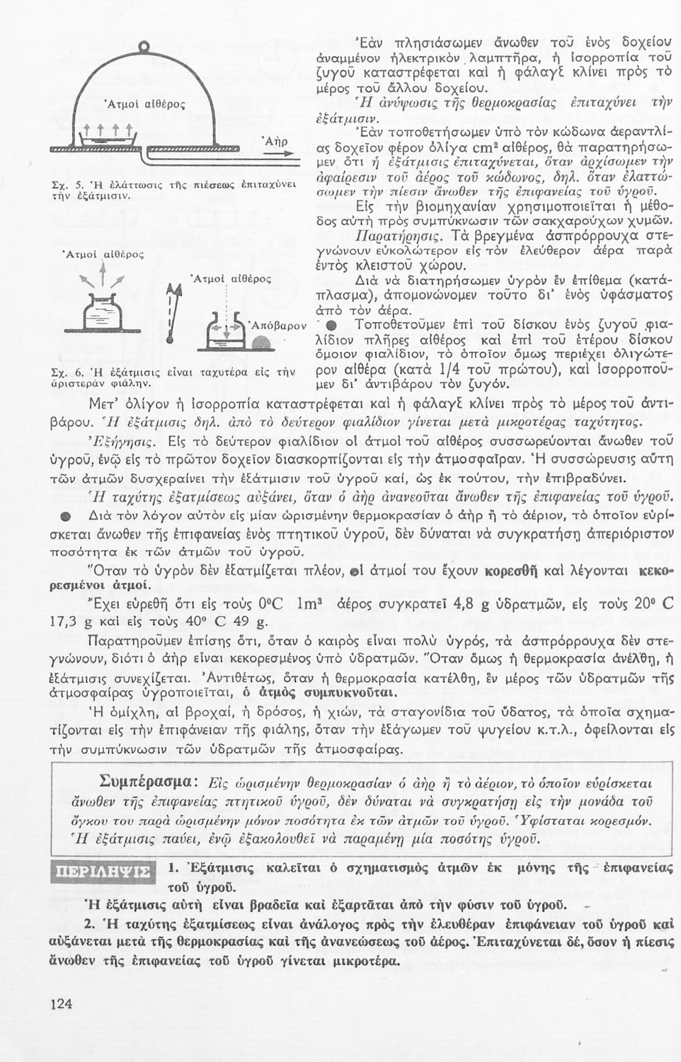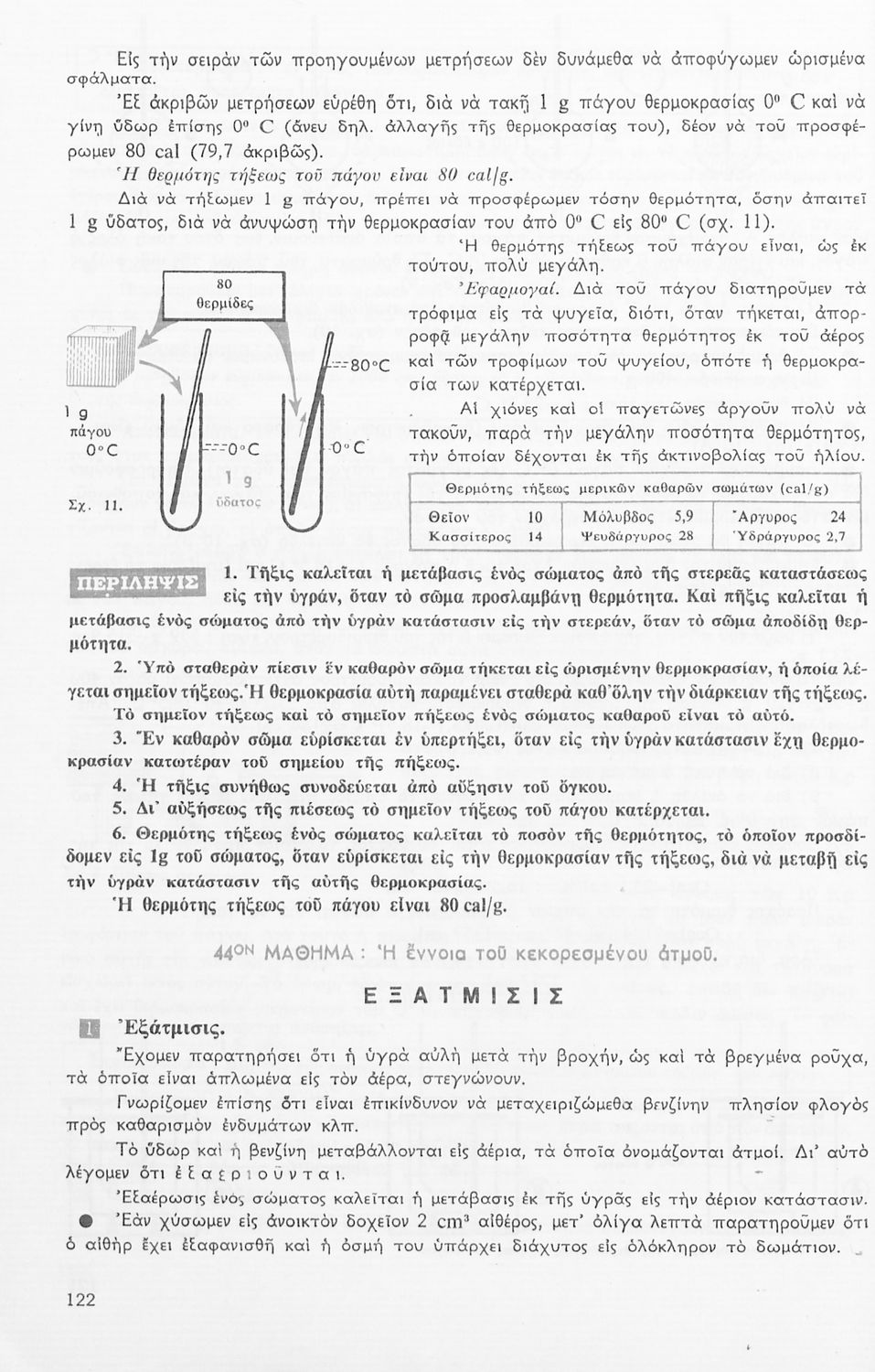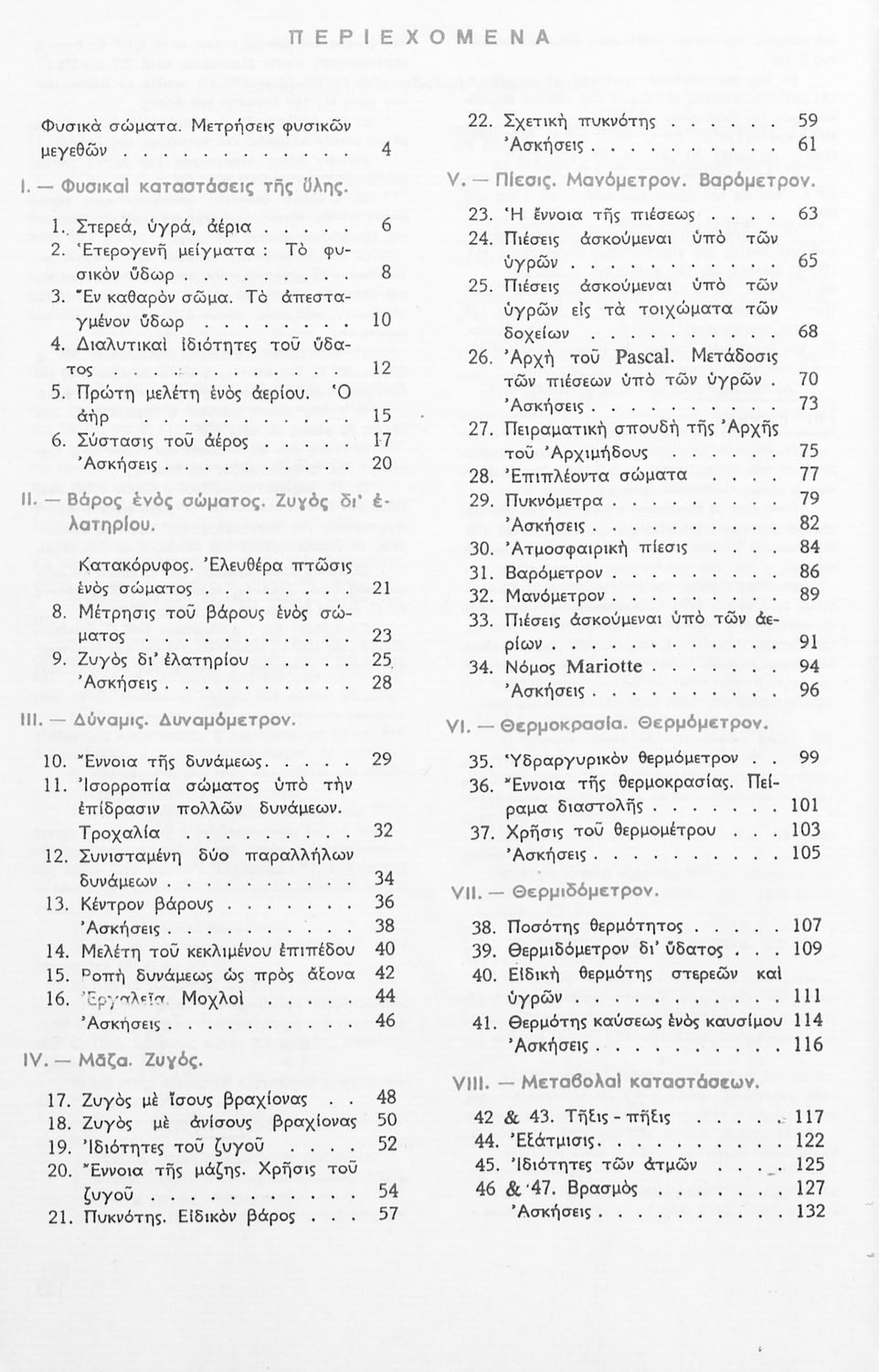 Το σύγγραμμα ήταν σχολικό εγχειρίδιο για το μάθημα της Φυσικής στο Γυμνάσιο. Αναλύει τις ιδιότητες των σωμάτων, τις δυνάμεις, τη μάζα, την πίεση, τη θερμότητα και τις μεταβολές των σωμάτων τήξη, πήξη, ...