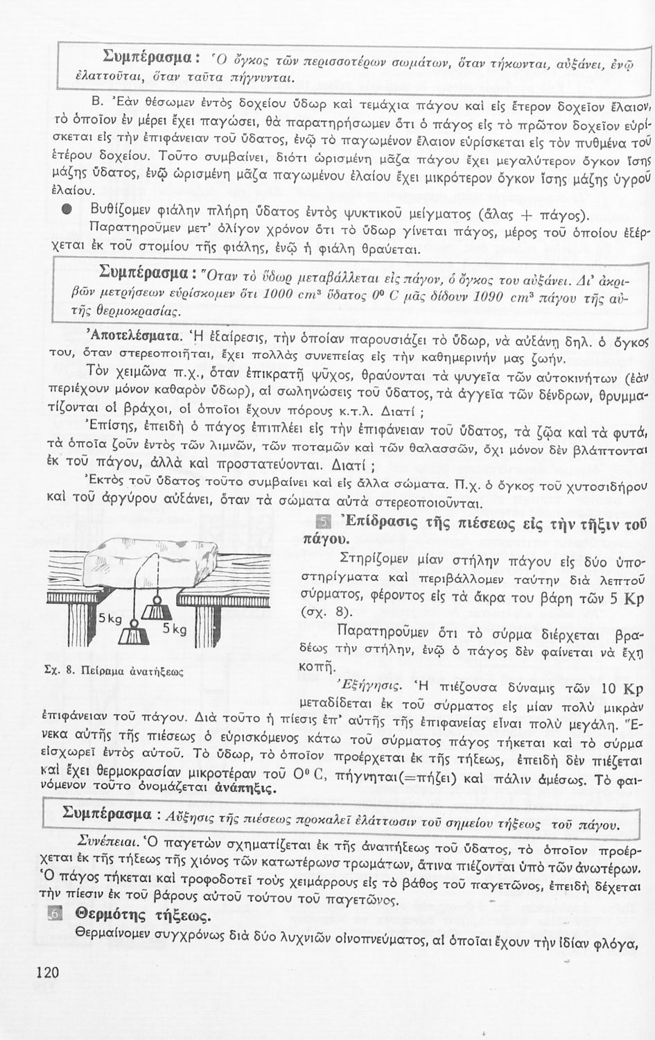 Παρουσίαση περιεχομένου: Το σύγγραμμα ήταν σχολικό εγχειρίδιο για το μάθημα της Φυσικής στο Γυμνάσιο. Αναλύει τις ιδιότητες των σωμάτων, τις δυνάμεις, τη μάζα, την πίεση, τη θερμότητα και τις μεταβολές των σωμάτων τήξη, πήξη, εξάτμιση. Κάθε κεφάλαιο περιέχει τη θεωρεία και τις ασκήσεις. Το βιβλίο περιέχει σκίτσα και σχεδιαγράμματα, τα οποία διευκολύνουν τη διδασκαλία και εξυπηρετούν στην καλύτερη κατανόηση της φυσικής επιστήμης.