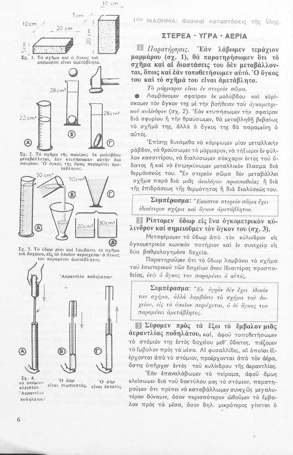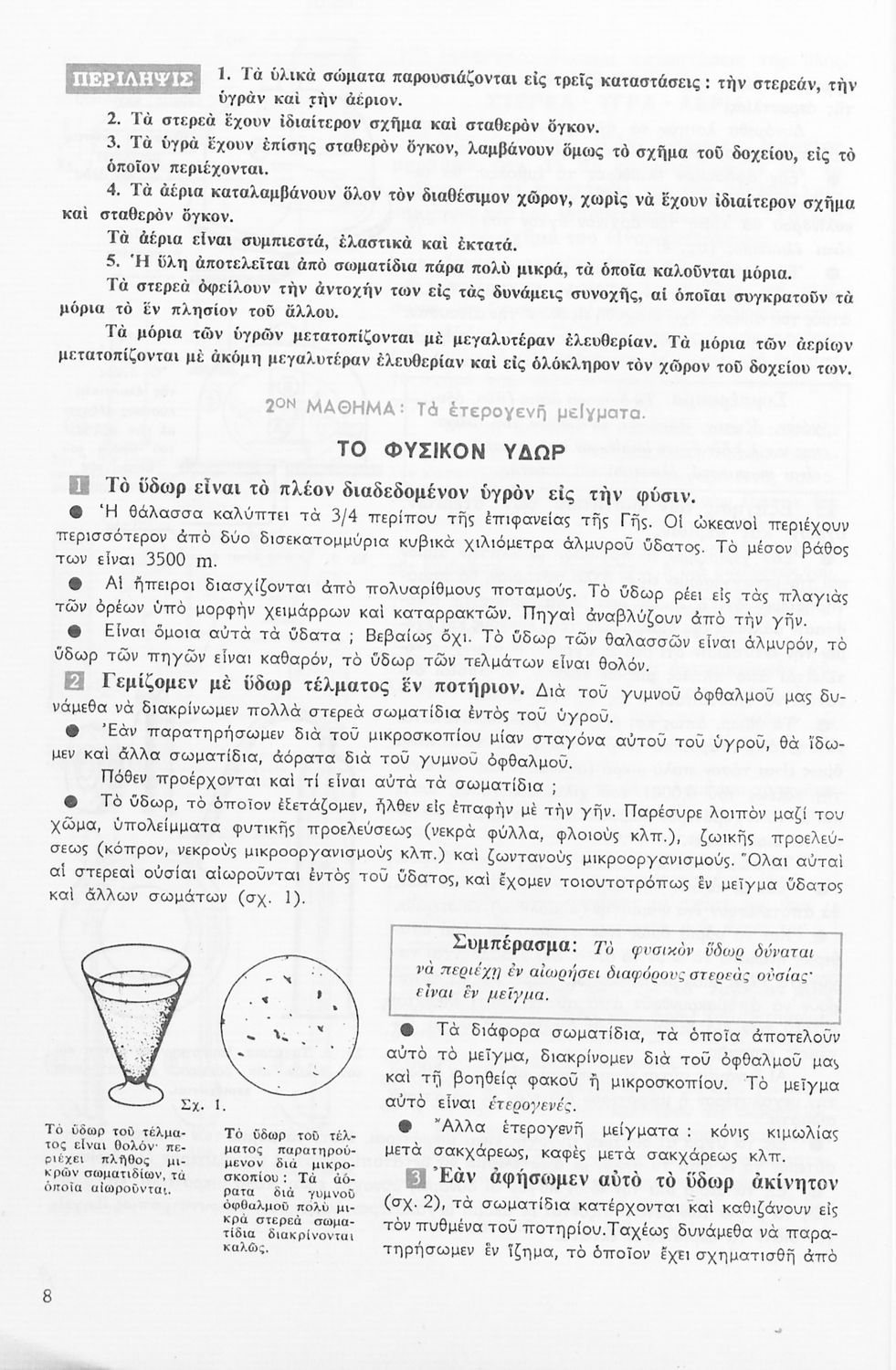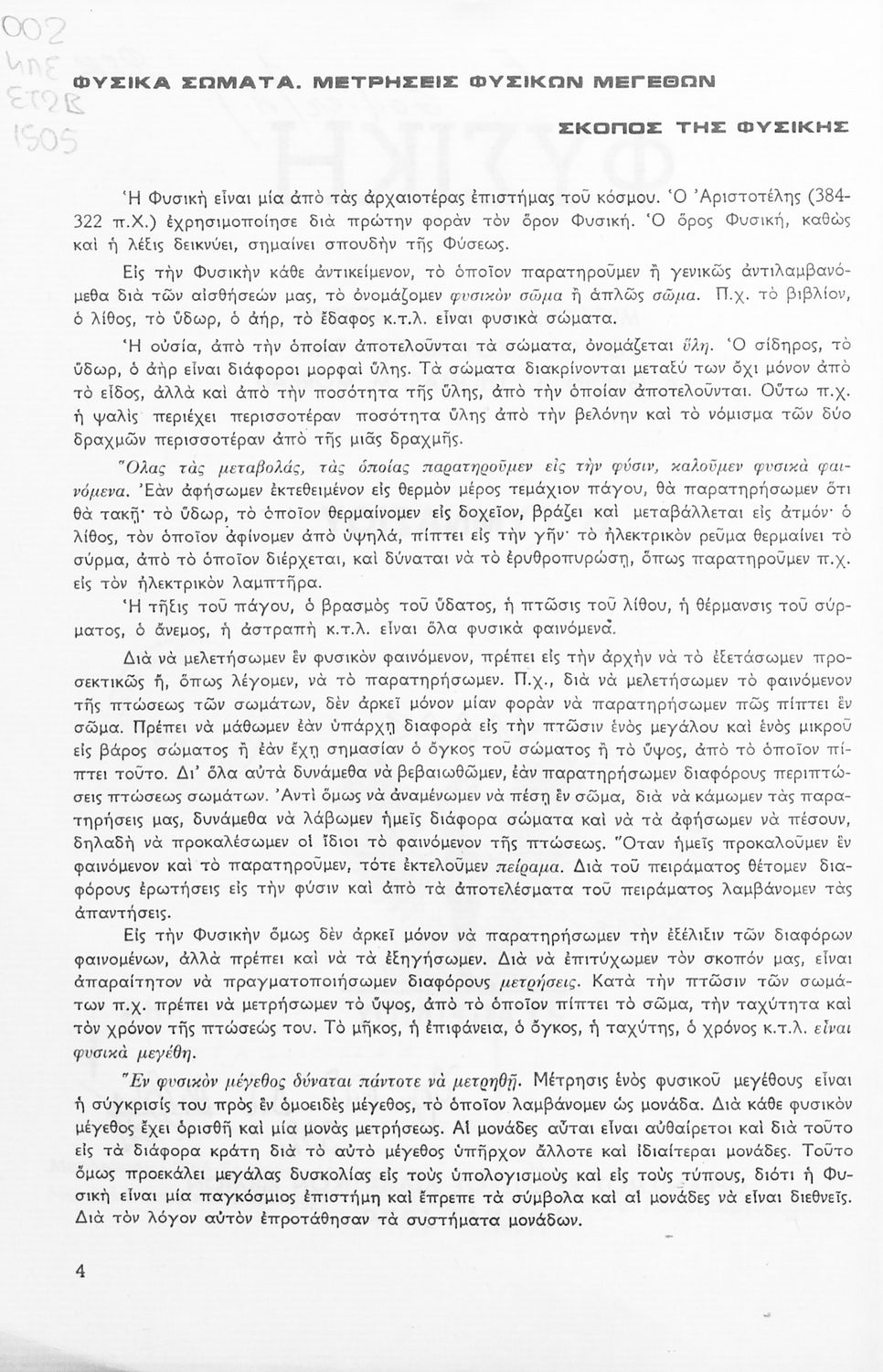 Το σύγγραμμα ήταν σχολικό εγχειρίδιο για το μάθημα της Φυσικής στο Γυμνάσιο. Αναλύει τις ιδιότητες των σωμάτων, τις δυνάμεις, τη μάζα, την πίεση, τη θερμότητα και τις μεταβολές των σωμάτων τήξη, πήξη, εξάτμιση. Κάθε κεφάλαιο περιέχει τη θεωρεία και τις ασκήσεις. Το βιβλίο περιέχει σκίτσα και σχεδιαγράμματα, τα οποία διευκολύνουν τη διδασκαλία και εξυπηρετούν στην καλύτερη κατανόηση της φυσικής επιστήμης.
