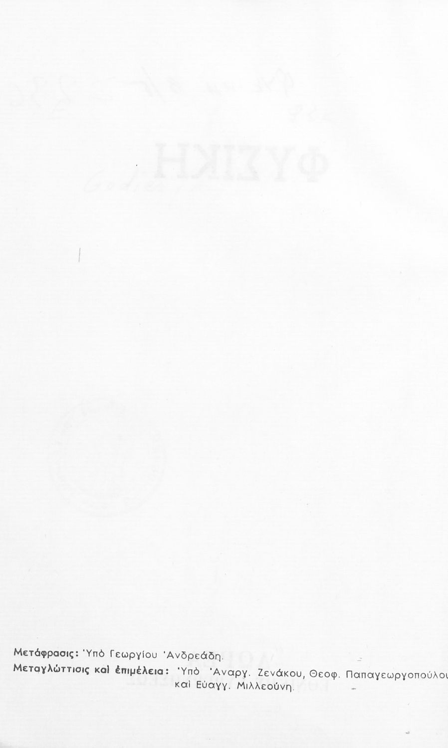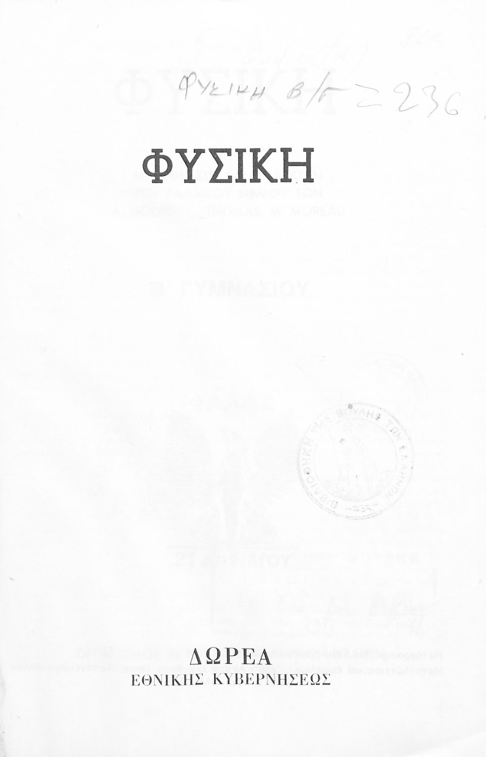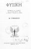 Βαθμίδα εκπαίδευσης: Δευτεροβάθμια Τάξη: Β' Γυμνασίου Μάθημα: Φυσική Γλώσσα: Απλή καθαρεύουσα Παρουσίαση περιεχομένου: Το σύγγραμμα ήταν σχολικό εγχειρίδιο για το μάθημα της Φυσικής στο Γυμνάσιο. Αναλύει τις ιδιότητες των σωμάτων, τις δυνάμεις, τη μάζα, την πίεση, τη θερμότητα και τις μεταβολές των σωμάτων τήξη, πήξη, εξάτμιση. Κάθε κεφάλαιο περιέχει τη θεωρεία και τις ασκήσεις. Το βιβλίο περιέχει σκίτσα και σχεδιαγράμματα, τα οποία διευκολύνουν τη διδασκαλία και εξυπηρετούν στην καλύτερη κατανόηση της φυσικής επιστήμης. |