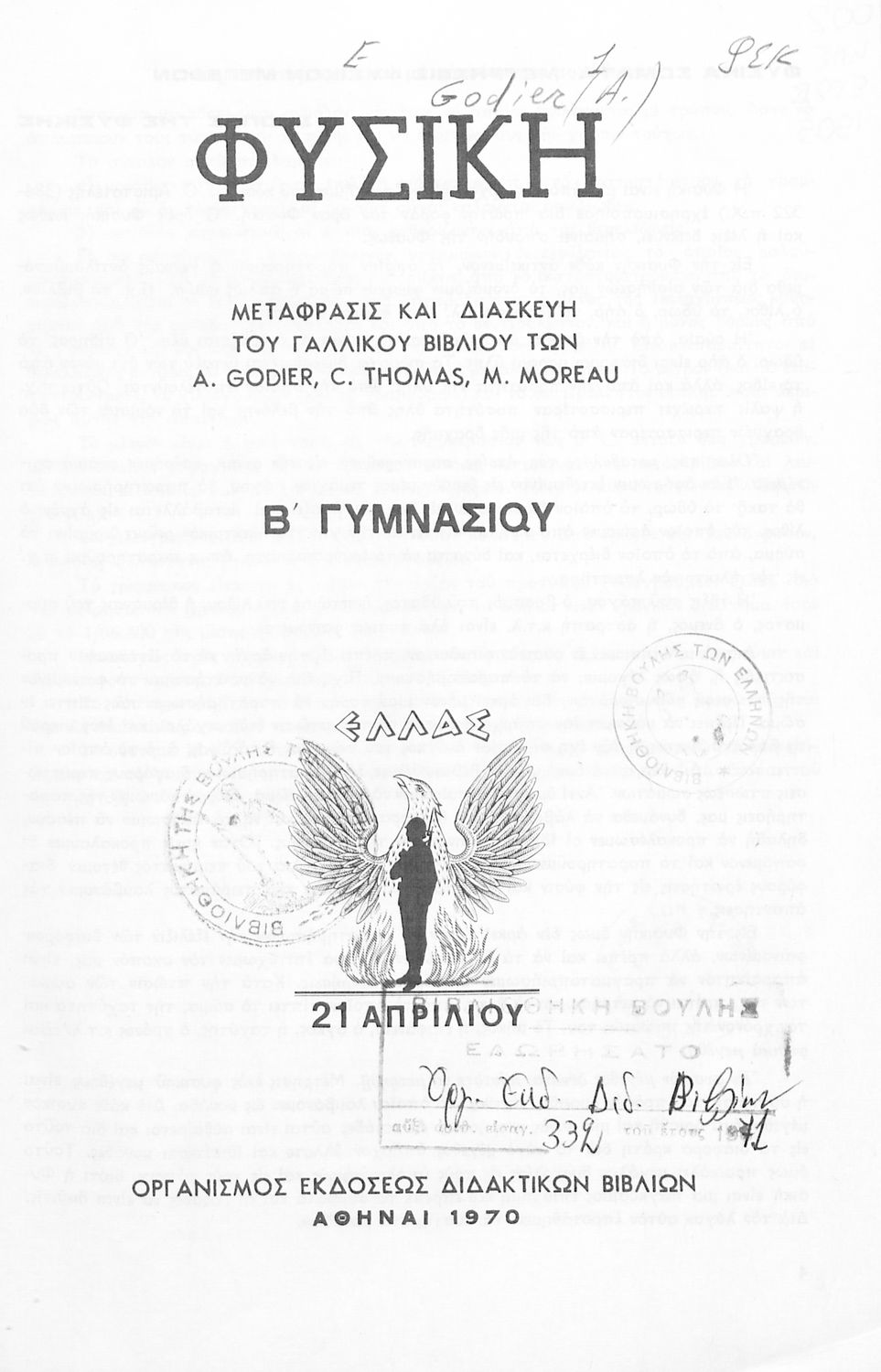 Εκδότης: Οργανισμός Εκδόσεως Διδακτικών Βιβλίων Έτος έκδοσης: 1970 Τόπος έκδοσης: Αθήνα Έκδοση: 4η Υπουργική απόφαση / Σύμβαση: 2038/13-4-1970 Έτος έγκρισης: 1970 |