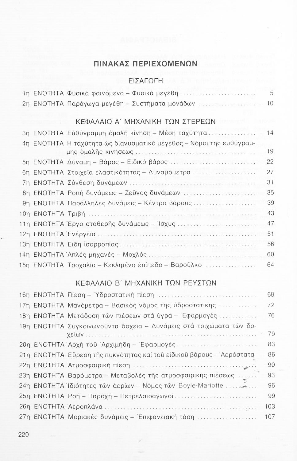 Σχολικό εγχειρίδιο της Β΄ Γυμνασίου για το μάθημα της Φυσικής. Αναφέρεται στα φυσικά φαινόμενα και το σύστημα μονάδων μέτρησης, συνεχίζει με τη μηχανική των στερεών, τις κινήσεις, το έργο, την ισχύς. Μετά αναλύεται η μηχανική στα ρευστά σώματα. Τέλος περιγράφονται τα φαινόμενα της θερμότητας και της οπτικής.