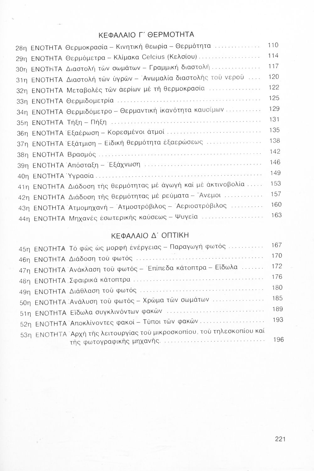 Σχολικό εγχειρίδιο της Β΄ Γυμνασίου για το μάθημα της Φυσικής. Αναφέρεται στα φυσικά φαινόμενα και το σύστημα μονάδων μέτρησης, συνεχίζει με τη μηχανική των στερεών, τις κινήσεις, το έργο, την ισχύς. Μετά αναλύεται η μηχανική στα ρευστά σώματα. Τέλος περιγράφονται τα φαινόμενα της θερμότητας και της οπτικής.