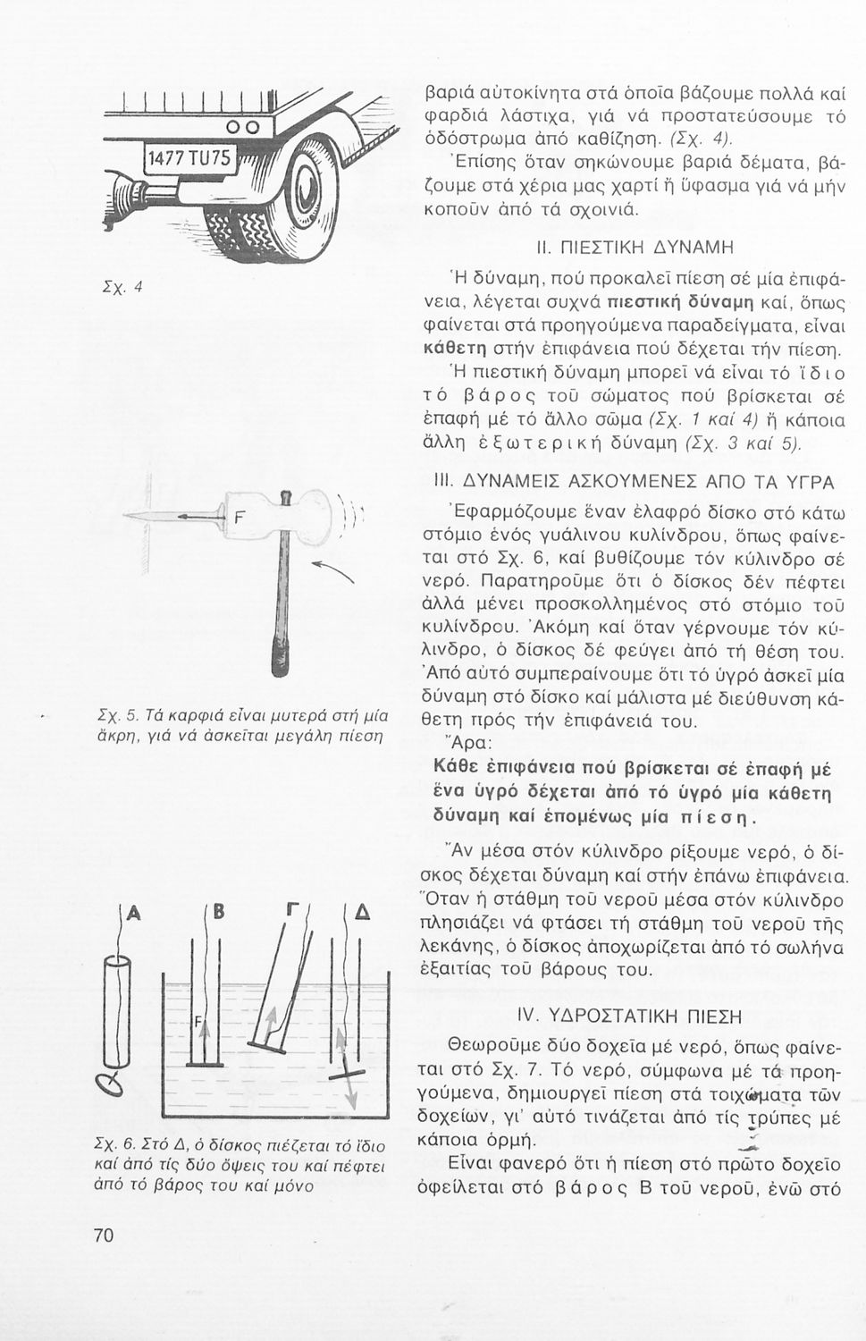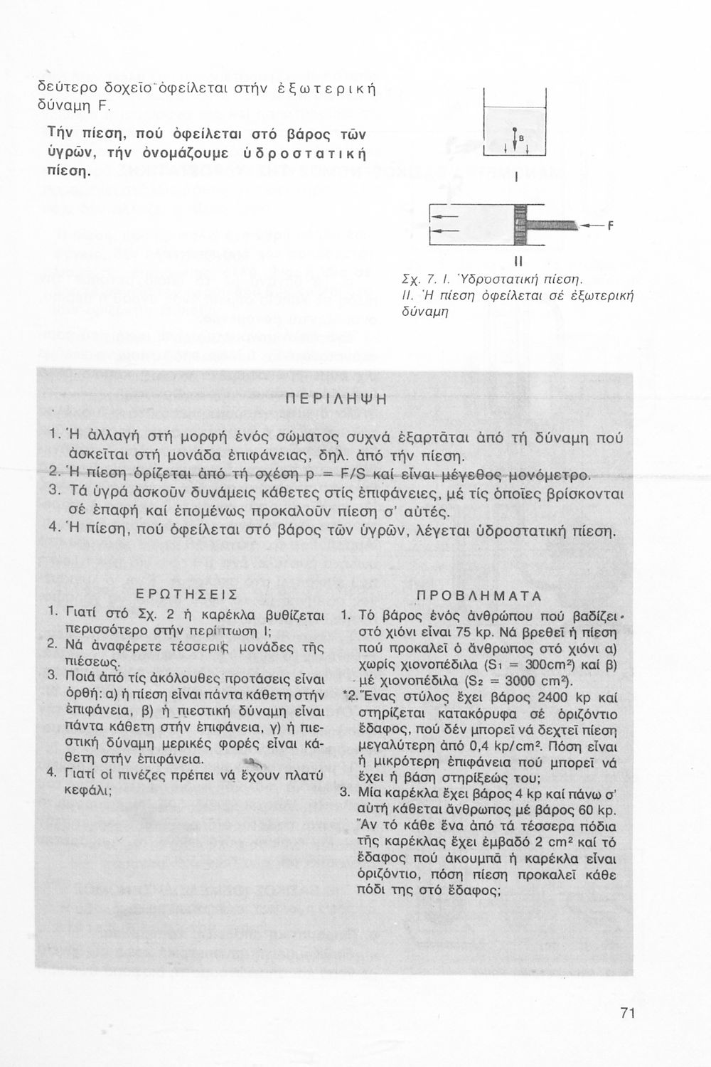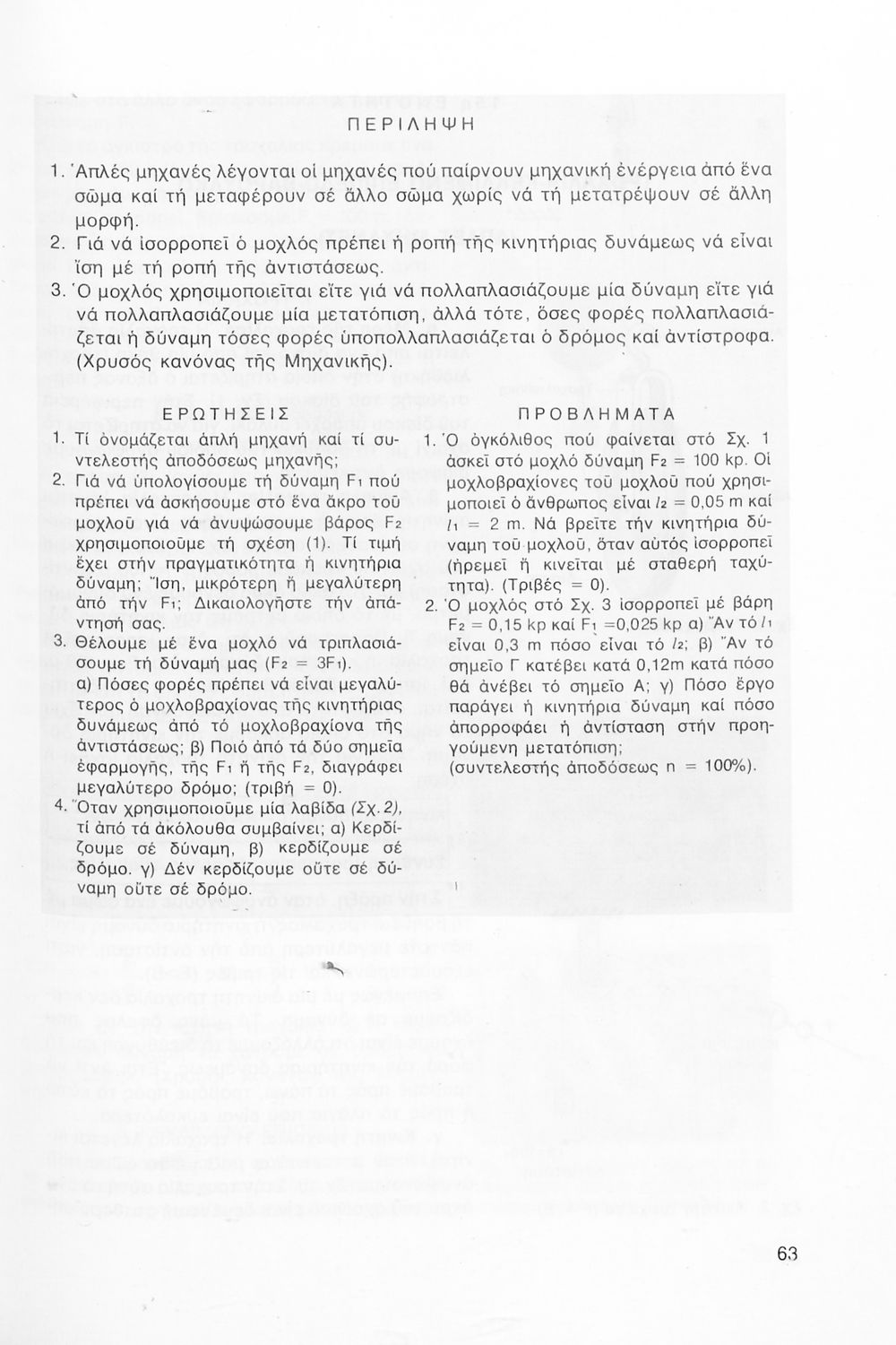 Σχολικό εγχειρίδιο της Β΄ Γυμνασίου για το μάθημα της Φυσικής. Αναφέρεται στα φυσικά φαινόμενα και το σύστημα μονάδων μέτρησης, συνεχίζει με τη μηχανική των στερεών, τις κινήσεις, το έργο, την ισχύς. Μετά αναλύεται η μηχανική στα ρευστά σώματα. Τέλος περιγράφονται τα φαινόμενα της θερμότητας και της οπτικής.