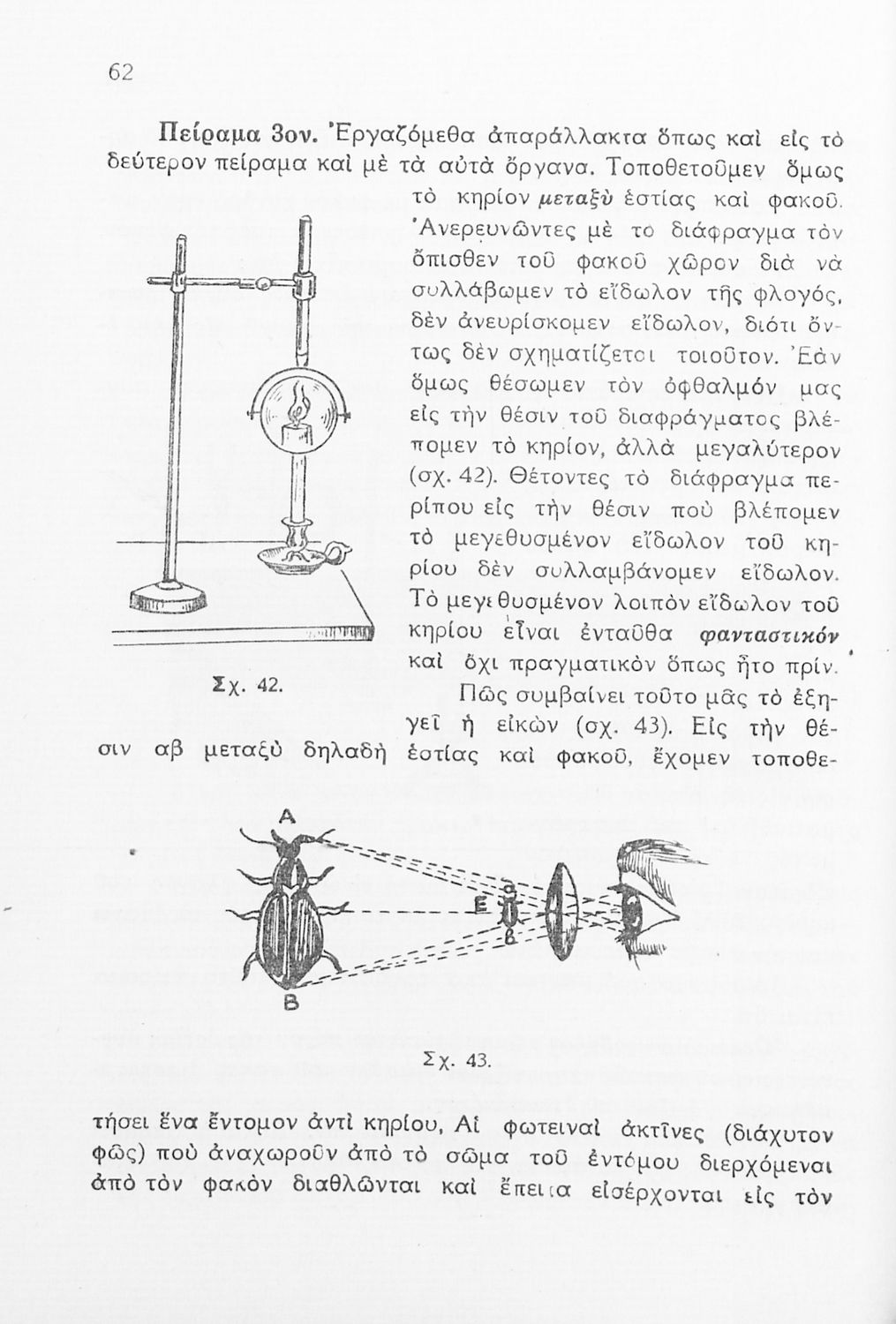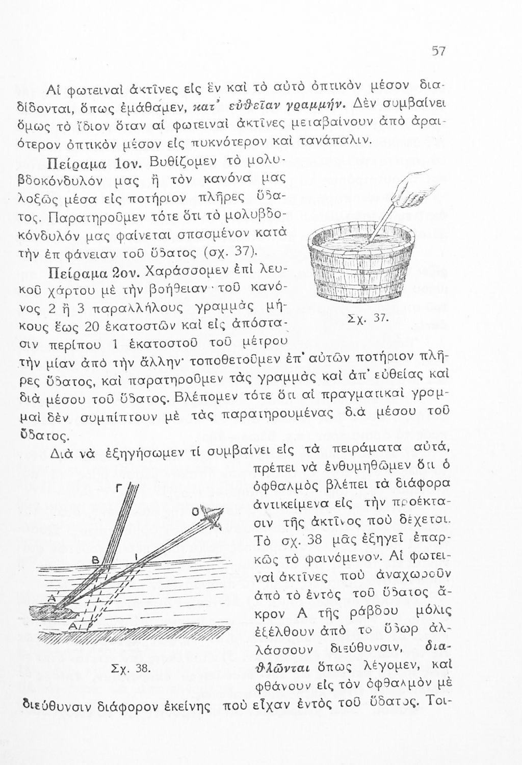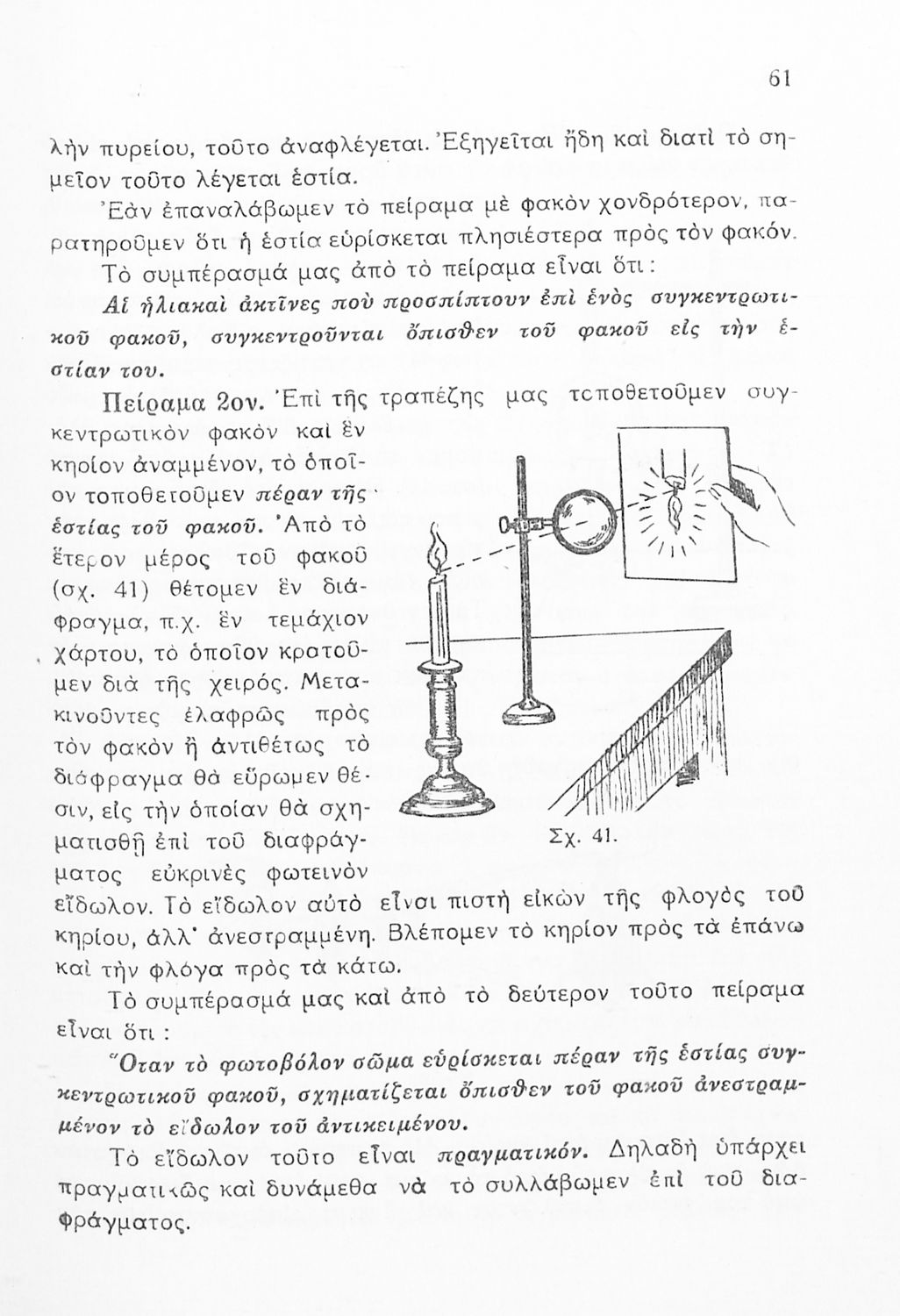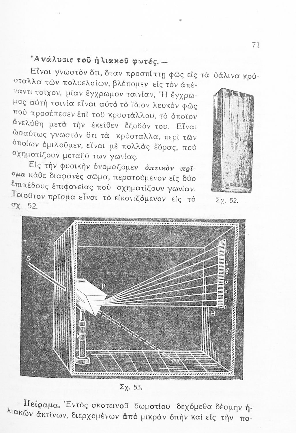 Σχολικό Εγχειρίδιο Φυσικής και Χημείας της Β' Τάξης Αστικών Σχολείων. Το βιβλίο είναι μια εισαγωγή στη φυσική και τη χημεία. Είναι χωρισμένο σε δύο μέρη. Στο πρώτο μέρος, παρουσιάζονται στοιχεία αεροστατικής, οπτικής και ακουστικής. Το δεύτερο μέρος, αφορά τη χημεία και εξετάζει τις ιδιότητες και τα χαρακτηριστικά των μετάλλων. Τέλος, το βιβλίο κάνει αναφορά στα άτομα και μόρια και στους νόμους των χημικών αντιδράσεων.