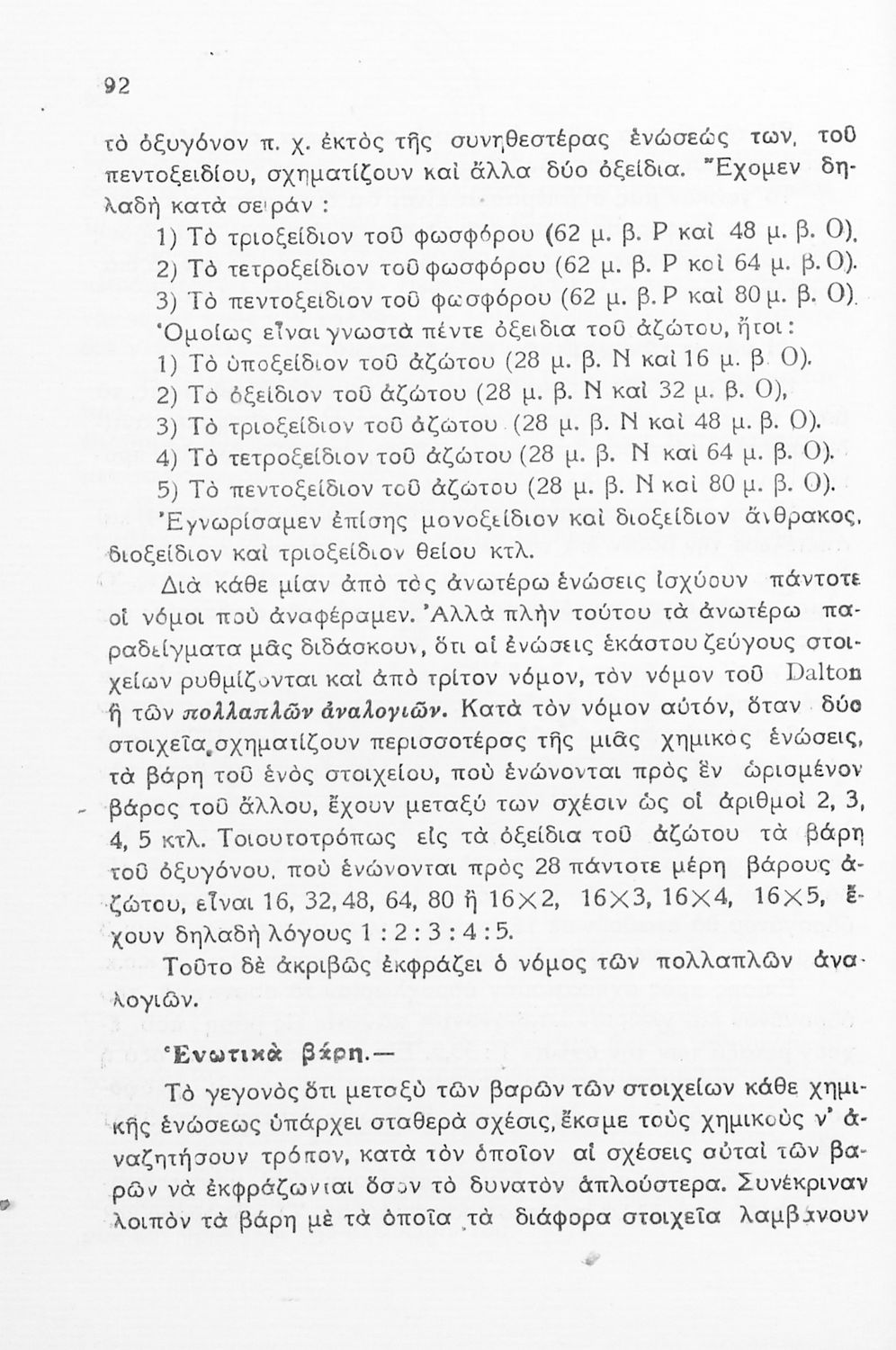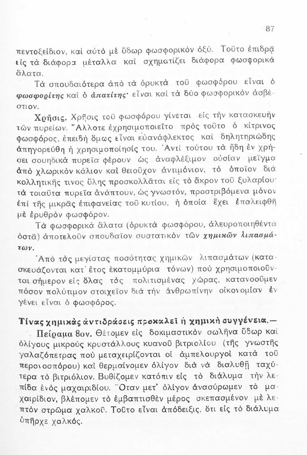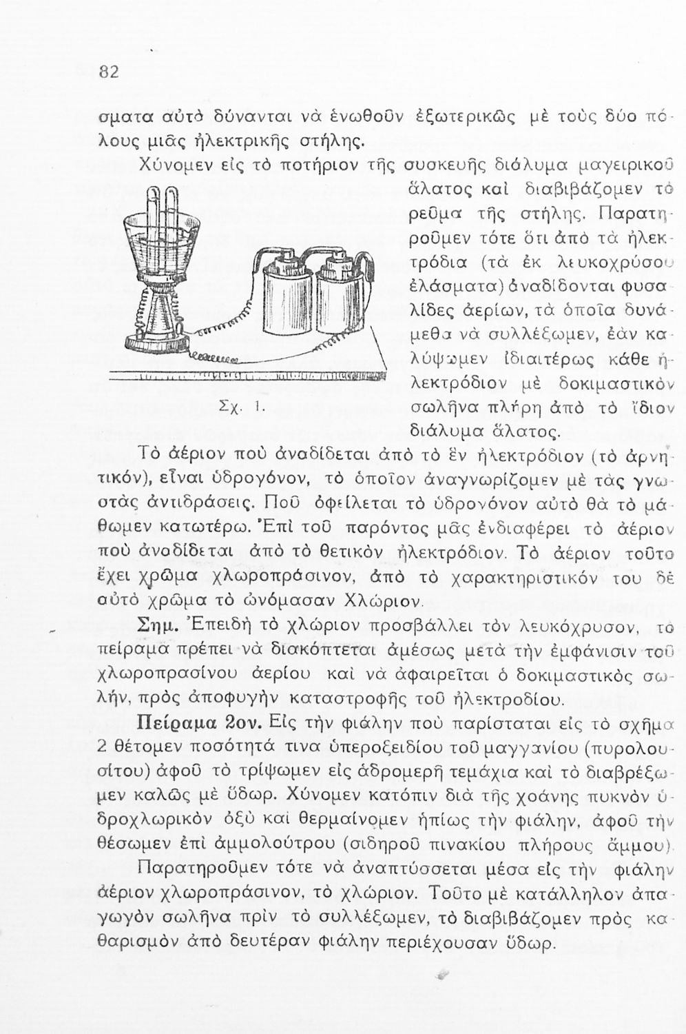 Σχολικό Εγχειρίδιο Φυσικής και Χημείας της Β' Τάξης Αστικών Σχολείων. Το βιβλίο είναι μια εισαγωγή στη φυσική και τη χημεία. Είναι χωρισμένο σε δύο μέρη. Στο πρώτο μέρος, παρουσιάζονται στοιχεία αεροστατικής, οπτικής και ακουστικής. Το δεύτερο μέρος, αφορά τη χημεία και εξετάζει τις ιδιότητες και τα χαρακτηριστικά των μετάλλων. Τέλος, το βιβλίο κάνει αναφορά στα άτομα και μόρια και στους νόμους των χημικών αντιδράσεων.