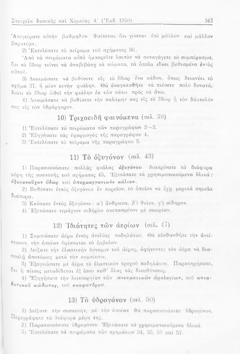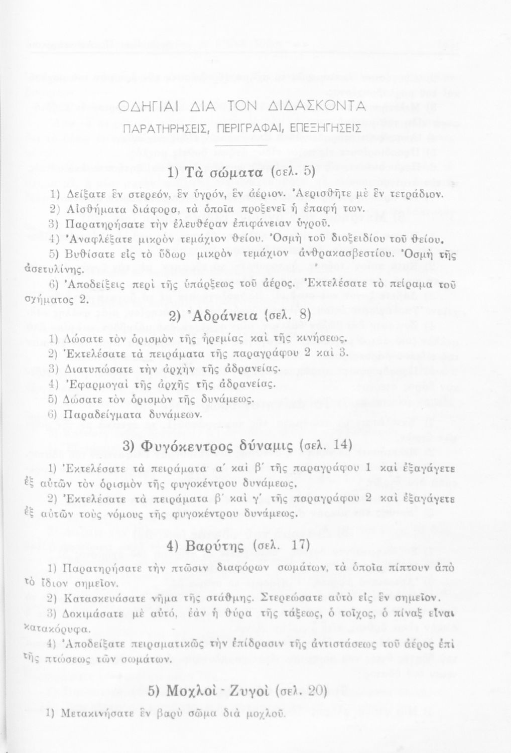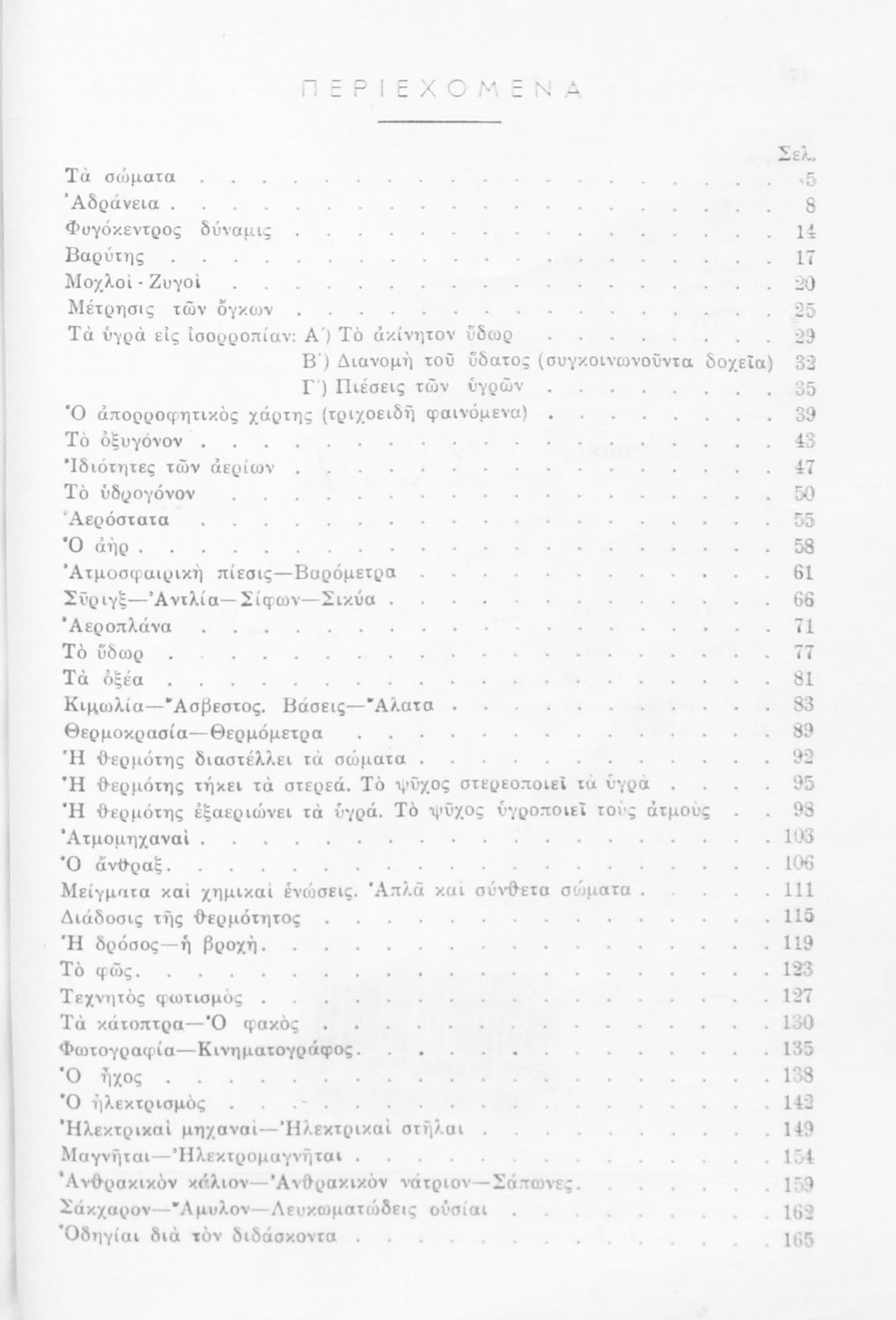 Βαθμίδα εκπαίδευσης: Δευτεροβάθμια Τάξη: Α' Γυμνασίου Γλώσσα: Καθαρεύουσα Παρουσίαση περιεχομένου: Σχολικό εγχειρίδιο Χημείας και Φυσικής της Α΄ Γυμνασίου. Ασχολείται με τις ιδιότητες των υγρών και των αερίων, την επίδραση που έχει η θερμοκρασία στα στερεά και τα υγρά, τη μετάδοση του ήχου, και τις ιδιότητες του φωτός. Τέλος, το βιβλίο ολοκληρώνει εστιάζοντας σε ζητήματα ηλεκτρισμού και ηλεκτρομαγνητισμού |