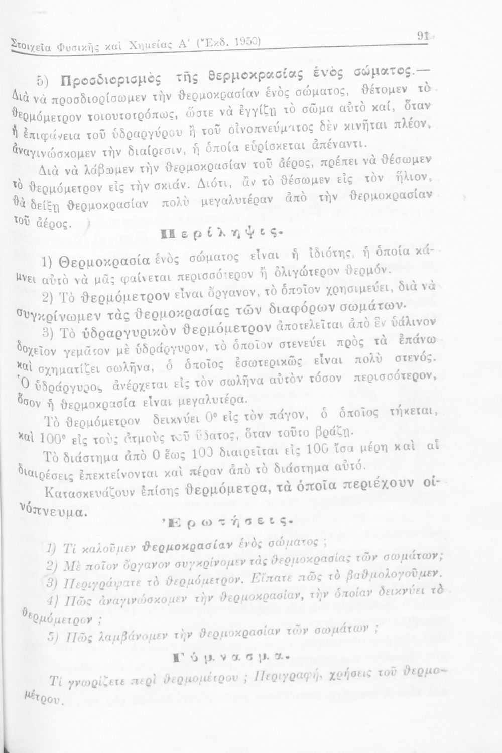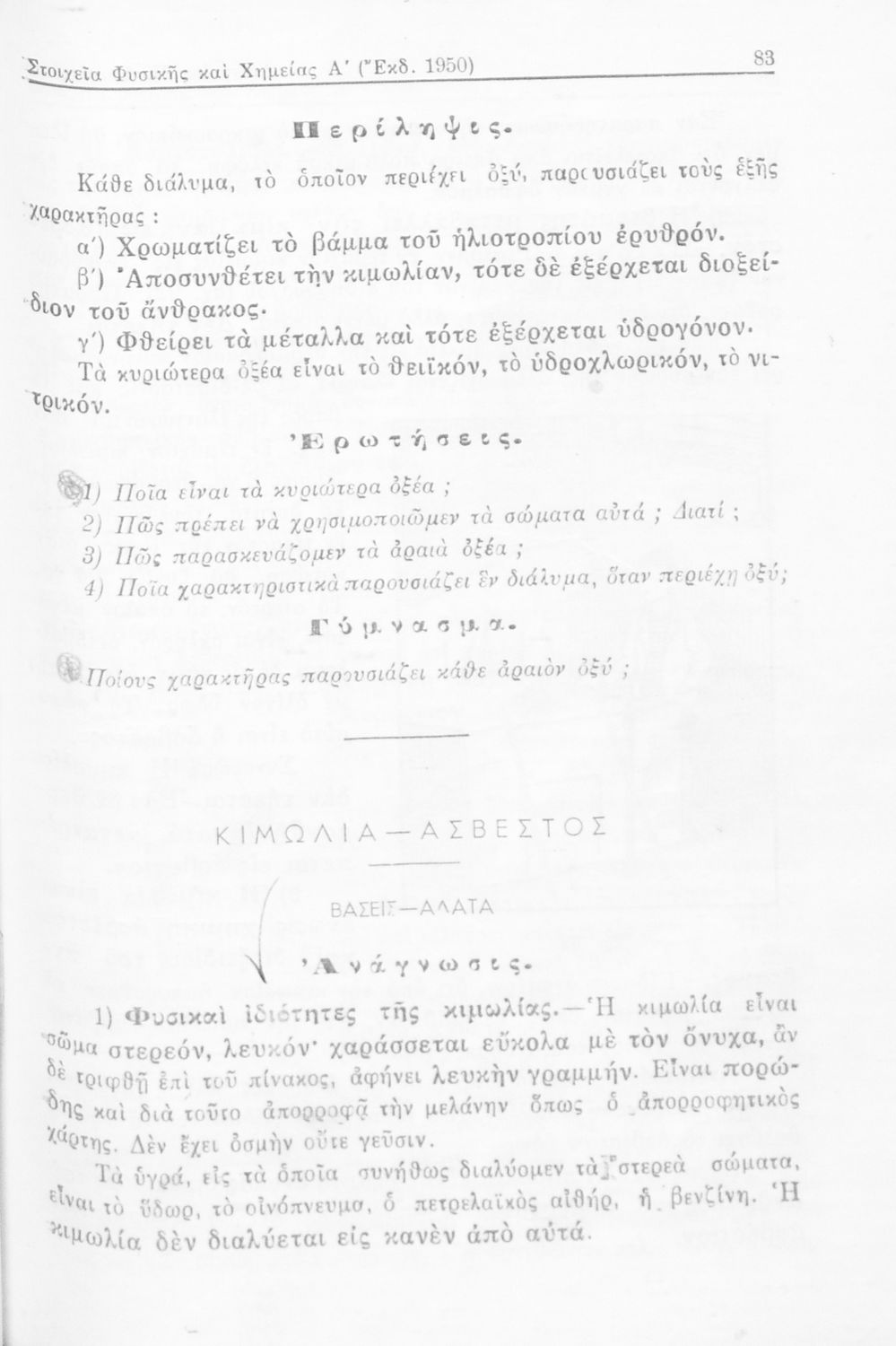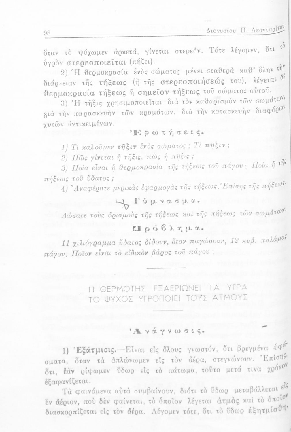 Βαθμίδα εκπαίδευσης: Δευτεροβάθμια Τάξη: Α' Γυμνασίου Γλώσσα: Καθαρεύουσα Παρουσίαση περιεχομένου: Σχολικό εγχειρίδιο Χημείας και Φυσικής της Α΄ Γυμνασίου. Ασχολείται με τις ιδιότητες των υγρών και των αερίων, την επίδραση που έχει η θερμοκρασία στα στερεά και τα υγρά, τη μετάδοση του ήχου, και τις ιδιότητες του φωτός. Τέλος, το βιβλίο ολοκληρώνει εστιάζοντας σε ζητήματα ηλεκτρισμού και ηλεκτρομαγνητισμού |